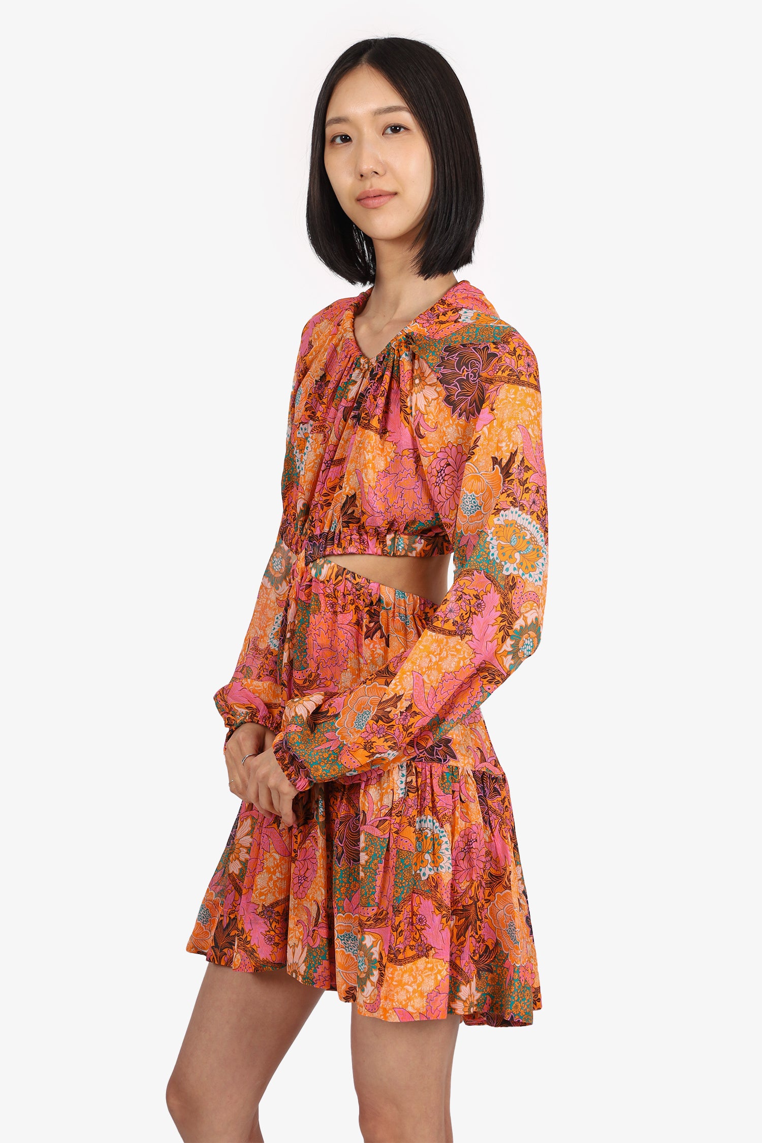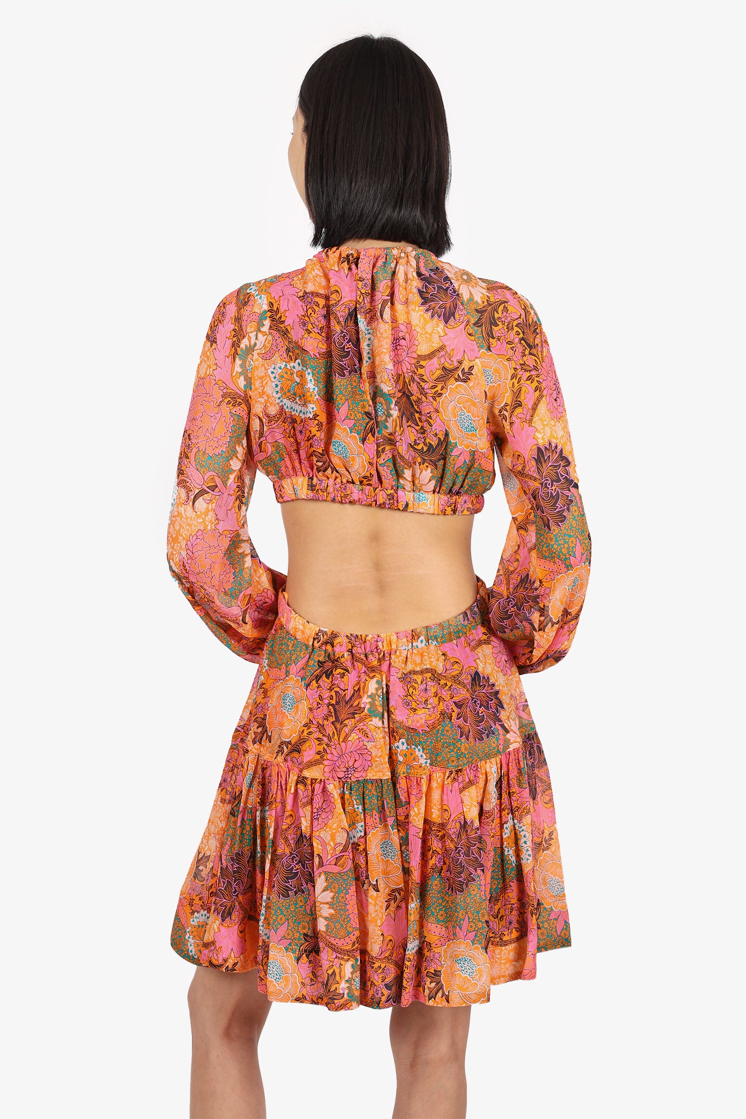 Refresh availabilityA.L.C Orange/Pink Silk Floral Print Cut-out Mini Dress. Slip-on. Round neckline. Rear keyhole with button-up closure. Elasticated sleeve cuffs. Elasticated cut outs at waistline. Partially lined. Tonal stitching.