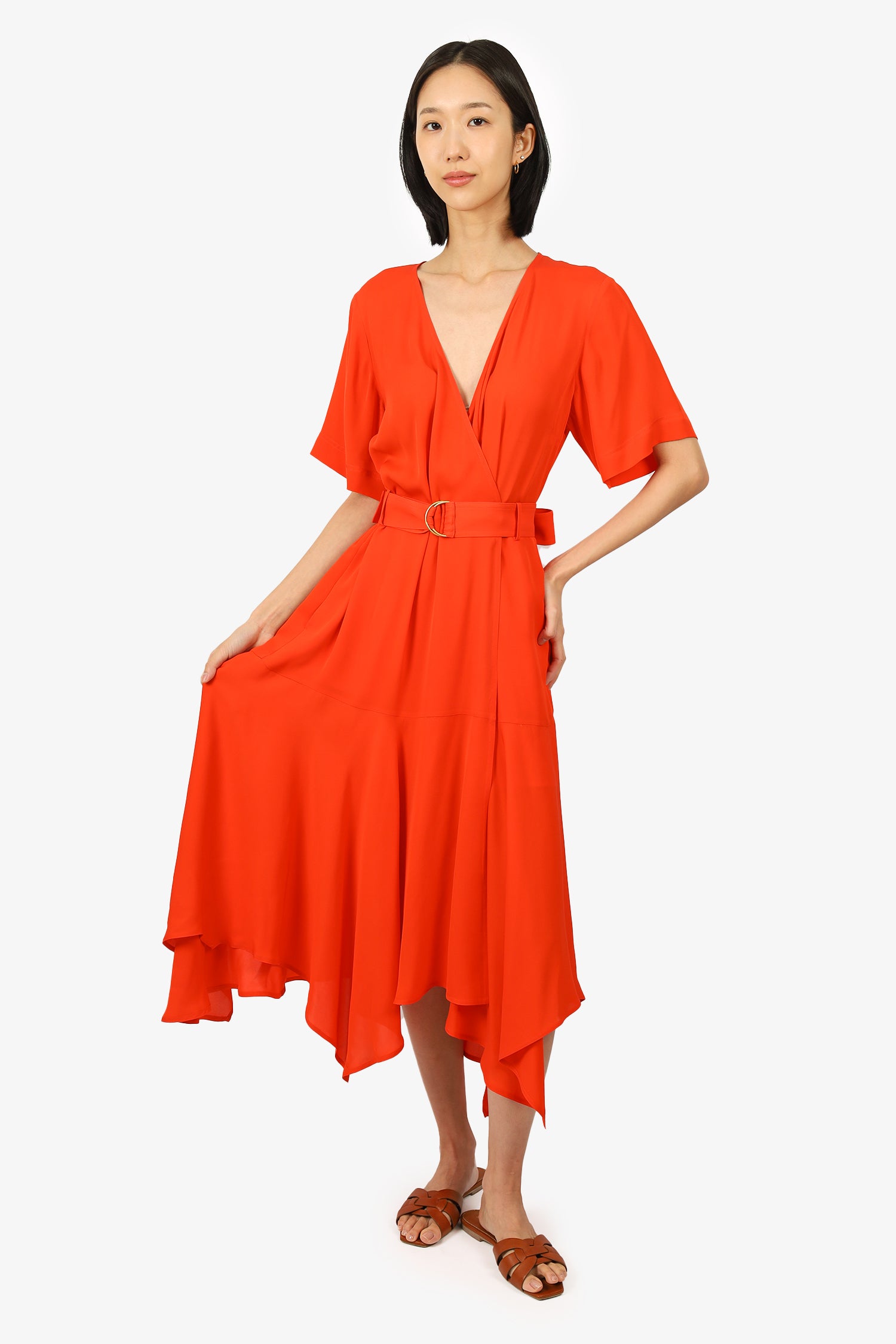 Refresh availabilityA.L.C Orange Silk Belted Wrap Dress. Wrap design with single front button-up closure. V-neckline. Waistband belt loops. Removable belt at waistband with pull-through buckle closure. Gold-tone hardware. Tonal stitching.