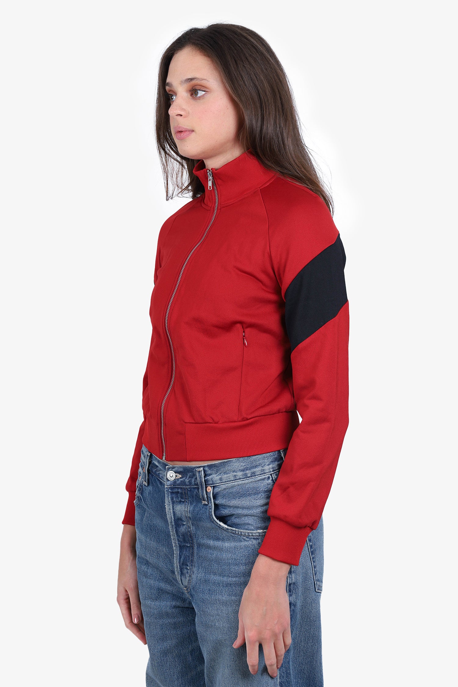 Refresh availabilityA.L.C Red/Black Colorblock Zip-up Jacket. Front zipper closure. Ribbed neckline, hem, and cuffs. Side pockets with zipper closure. Silver-toned hardware. Tonal stitching.
