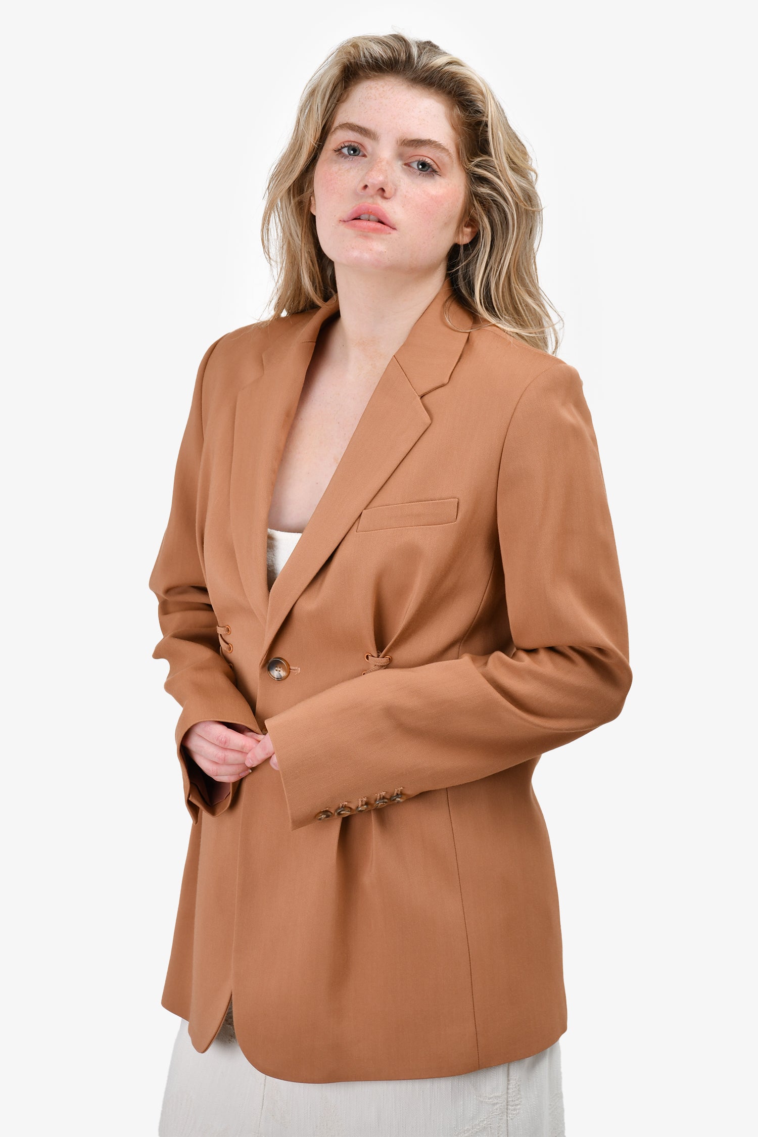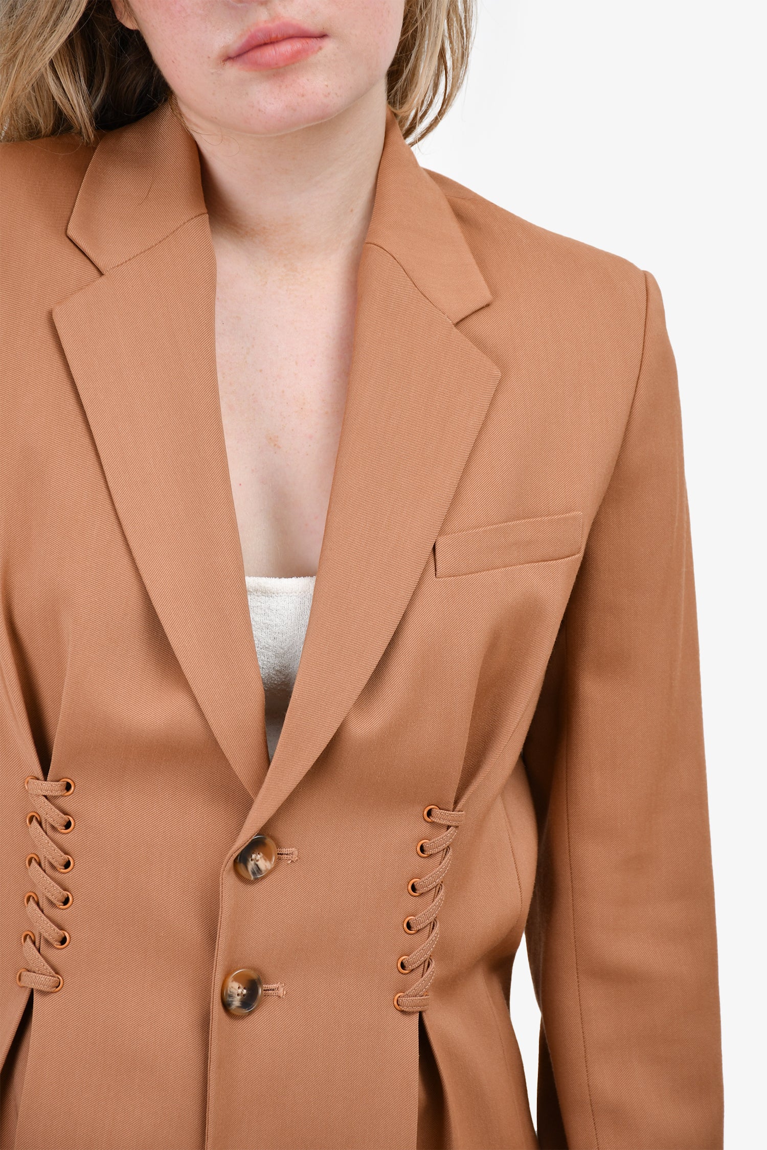 Refresh availabilityA.L.C. Terracotta Lace-Up Blazer. Front button-up closure. Lined. Padded shoulders. Button closure on the cuffs. V-neck.