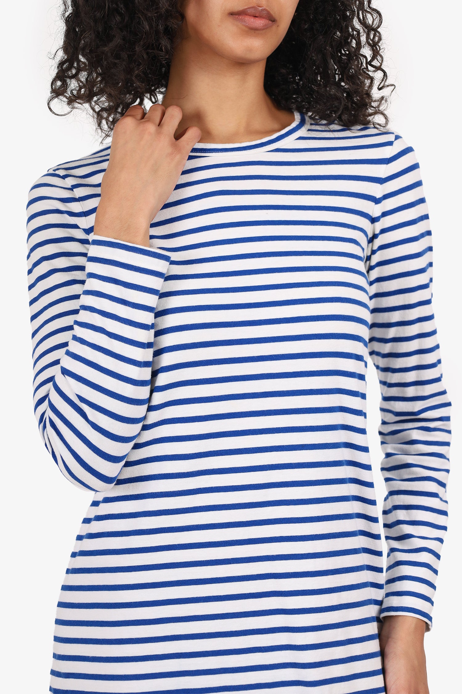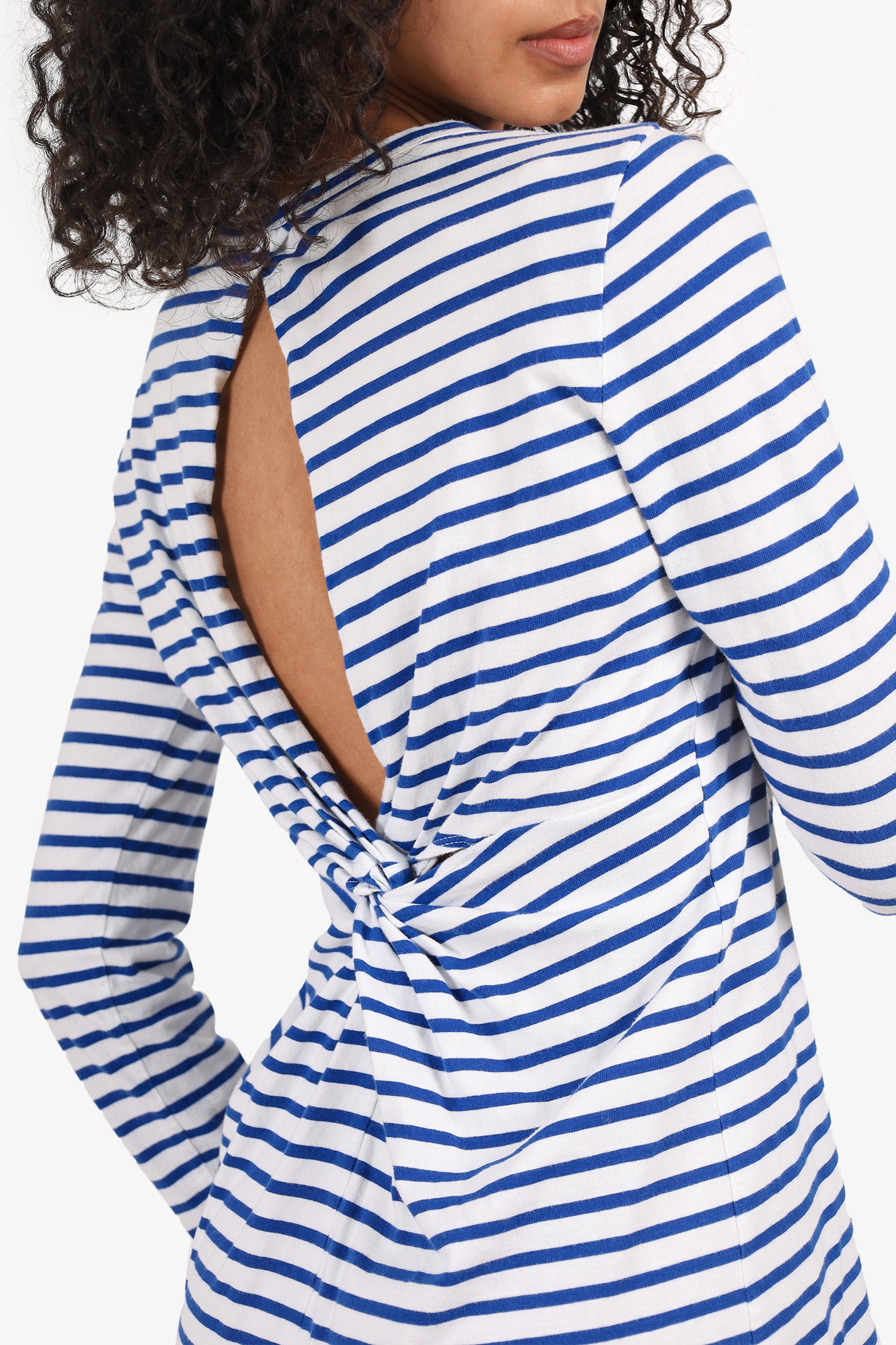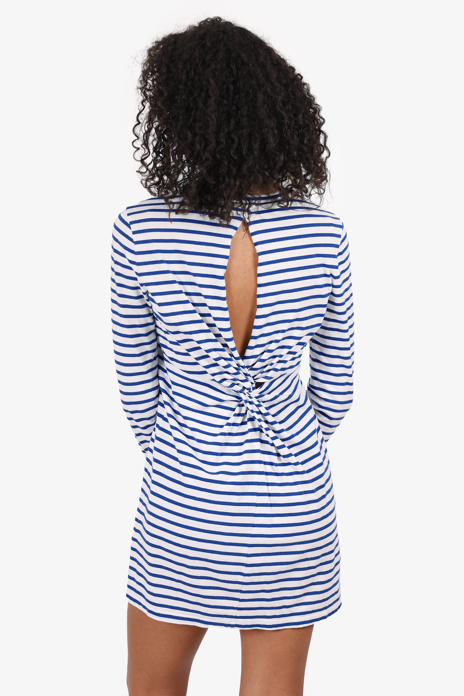 Refresh availabilityA.L.C. White/Blue Stripped Long Sleeve Mini Dress. Pull-on. Round-neckline. Rear keyhole. Tonal stitching.