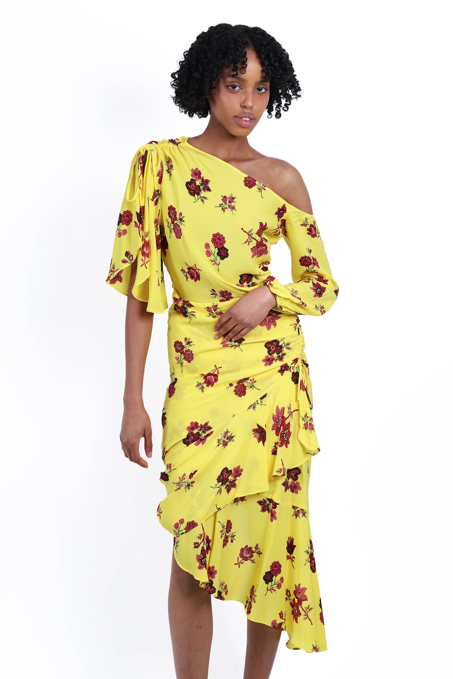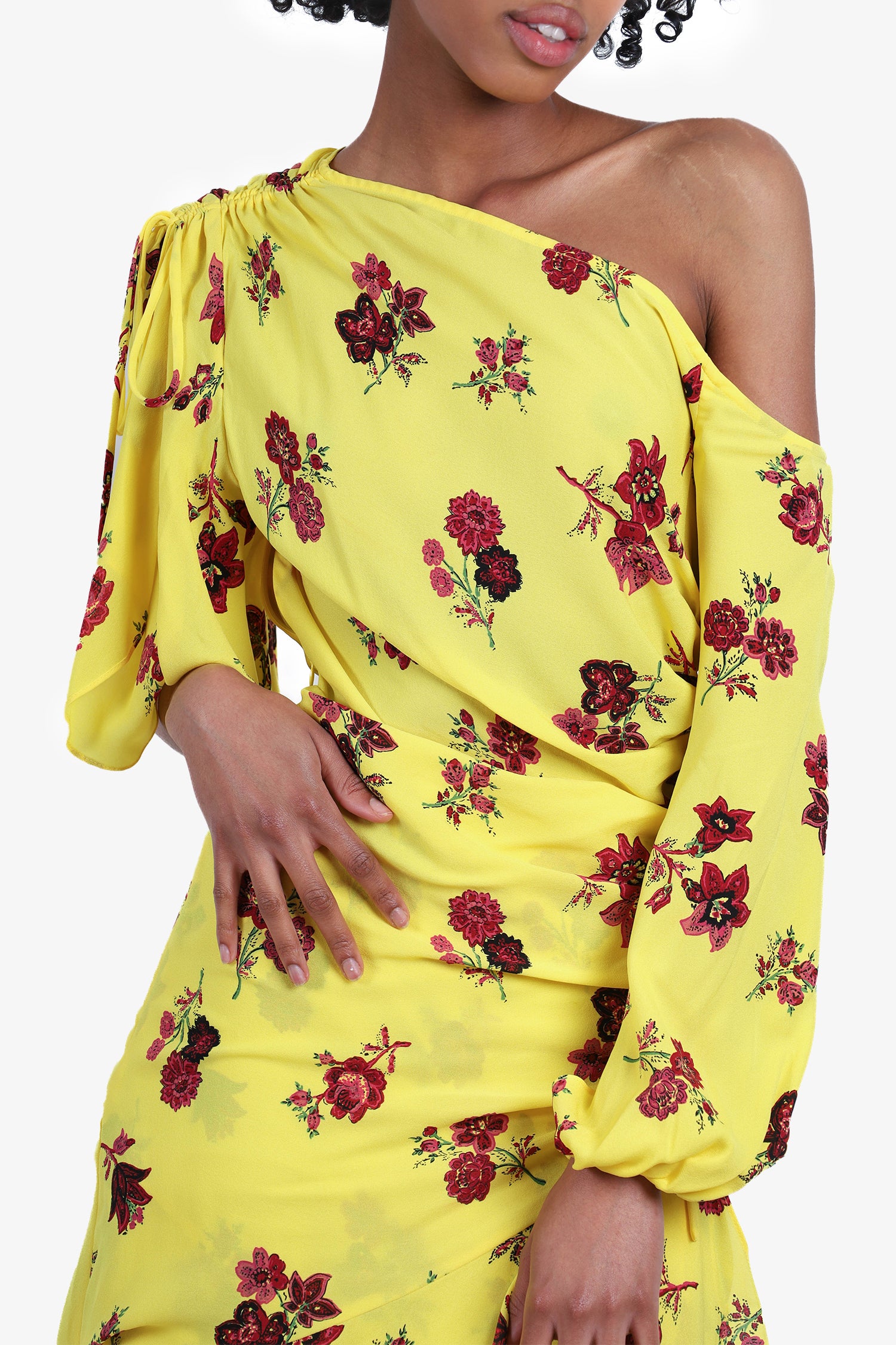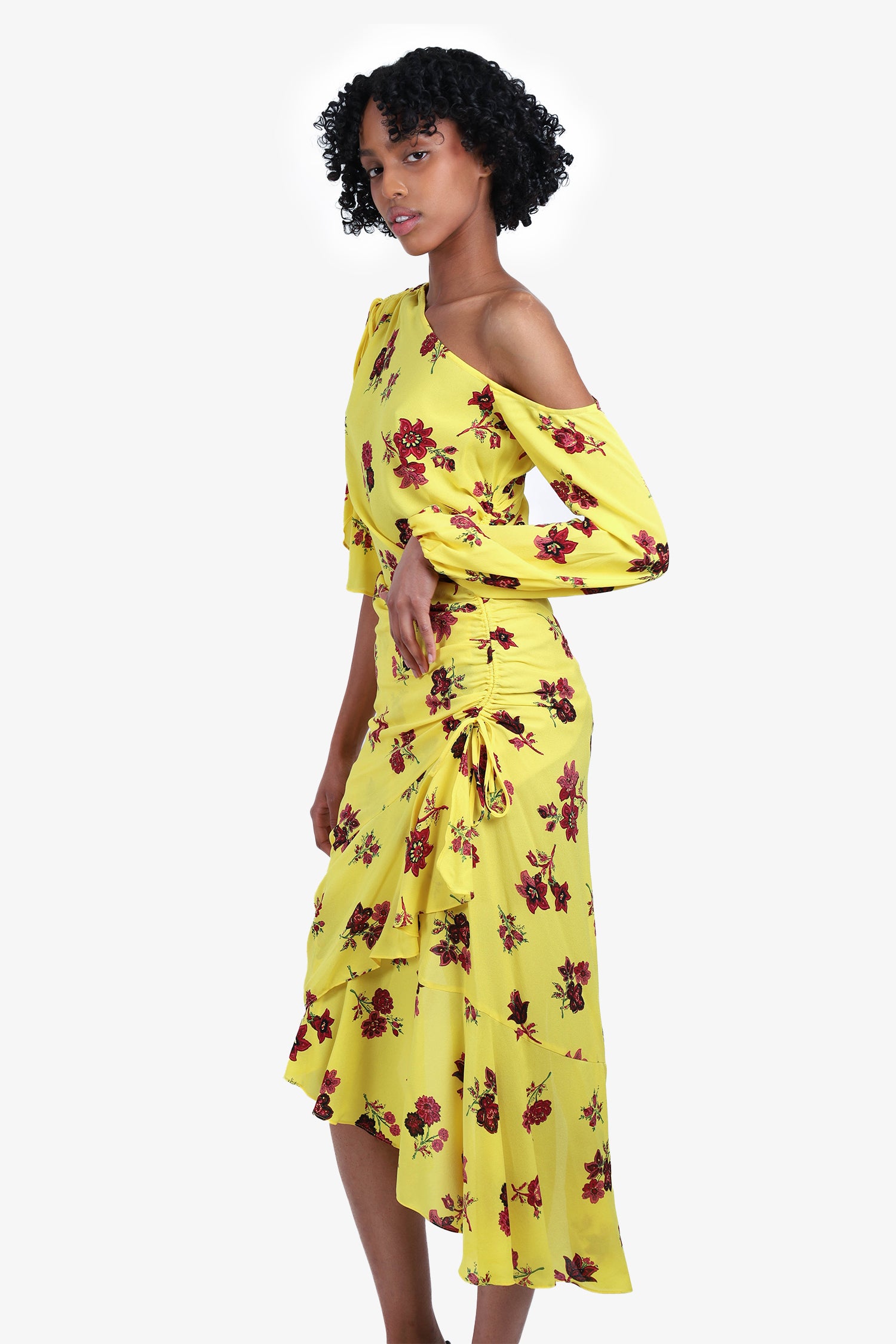 Refresh availabilityA.L.C. Yellow/Red Floral Printed Silk Asymmetrical Neckline Long-Sleeve Midi Dress. One shoulder. Side zip closure. Lined. Tonal stitching.