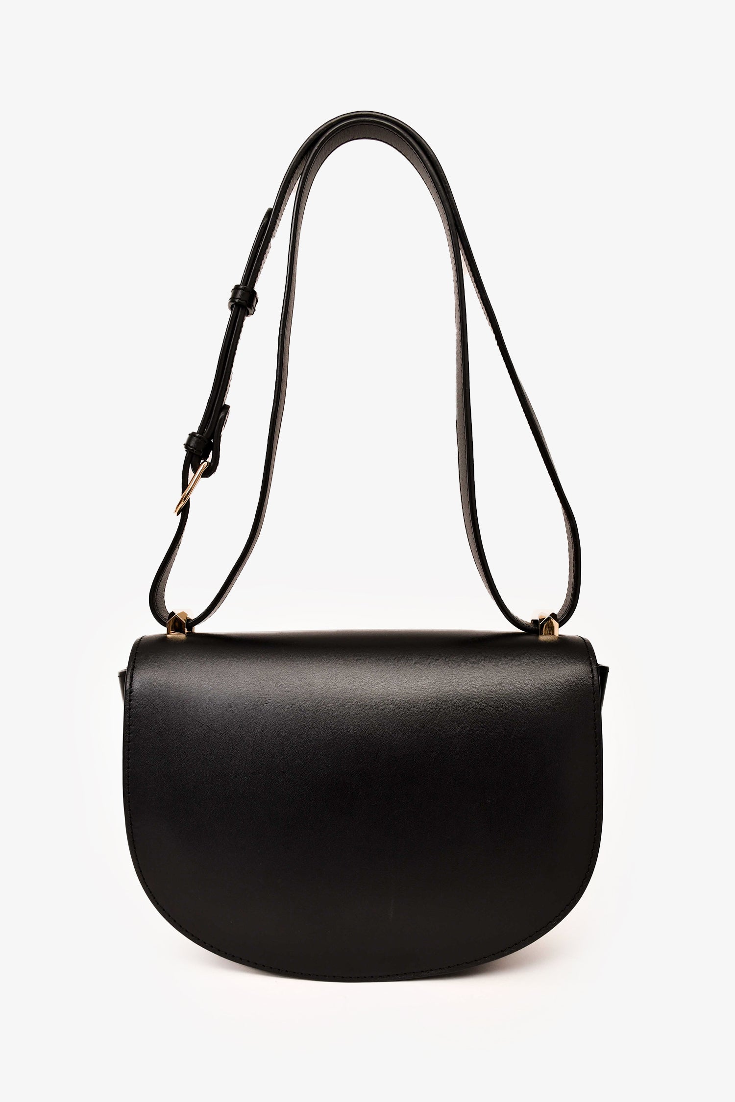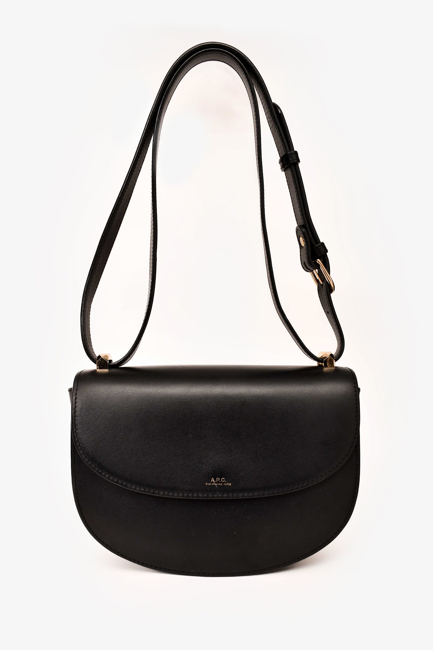 Refresh availabilityA.P.C. Black Leather Genève Crossbody. Front fold-over flap with magnetic button closure. Adjustable crossbody strap. Single interior slip pocket. Black textile interior lining. Gold-toned hardware. Tonal stitching.