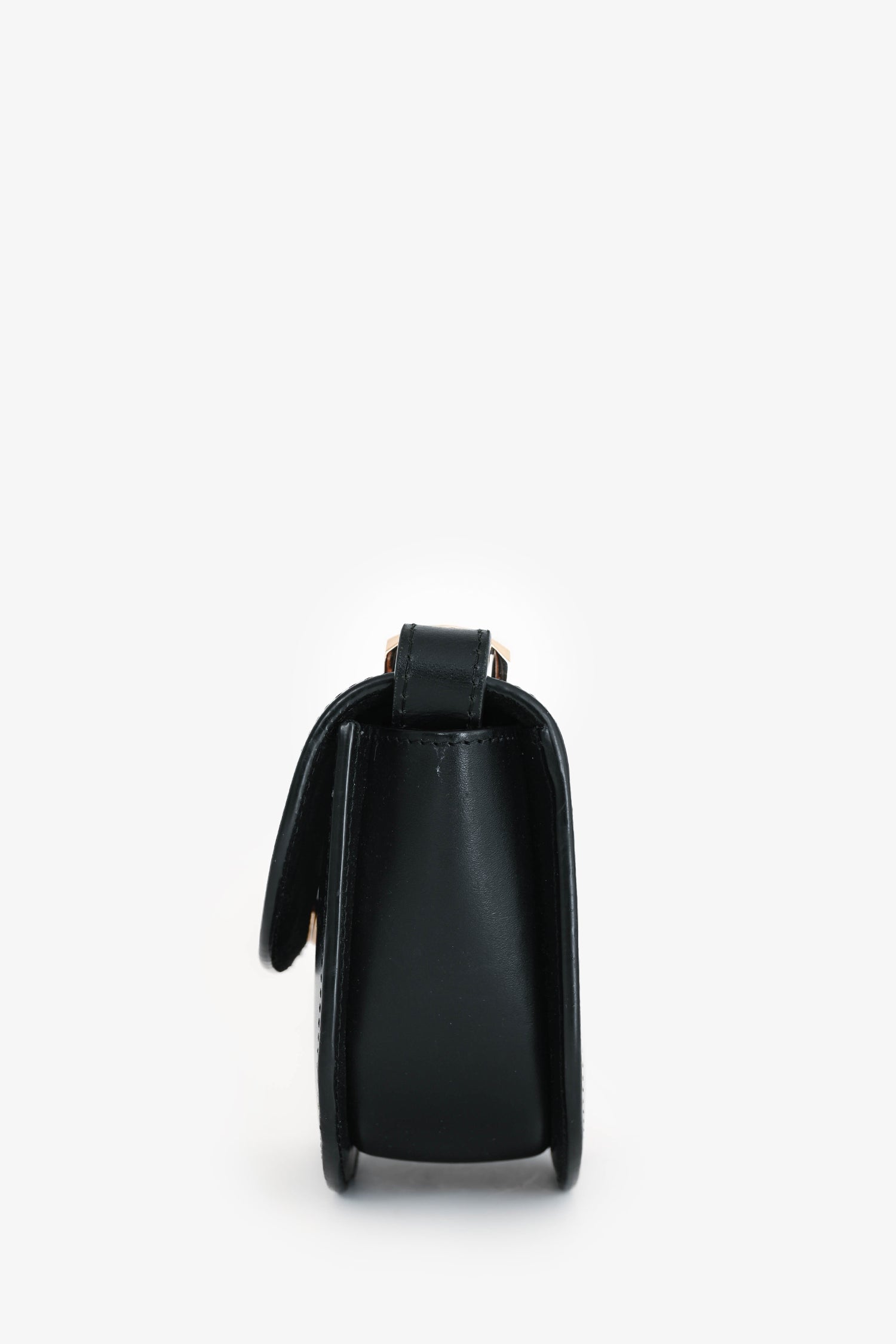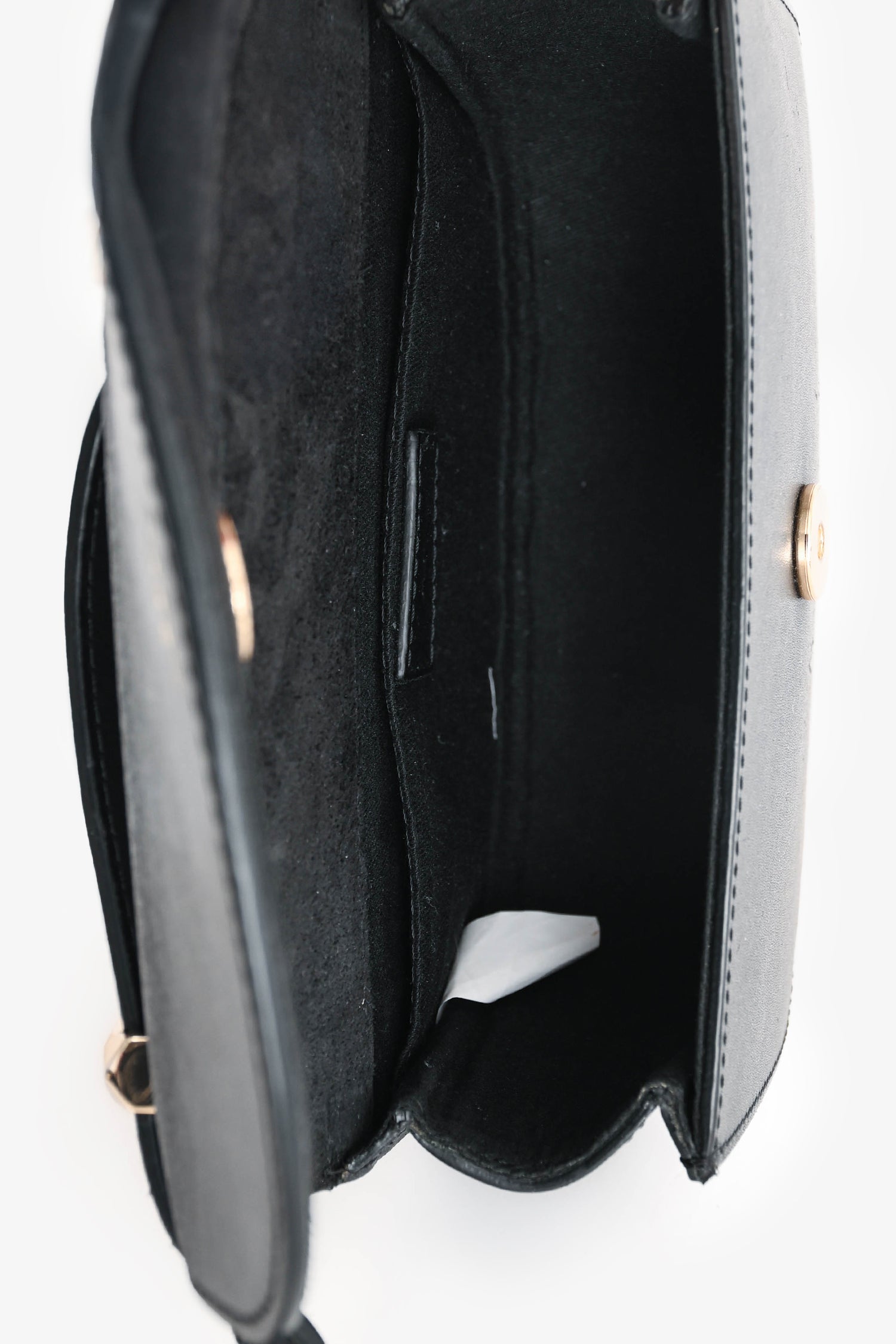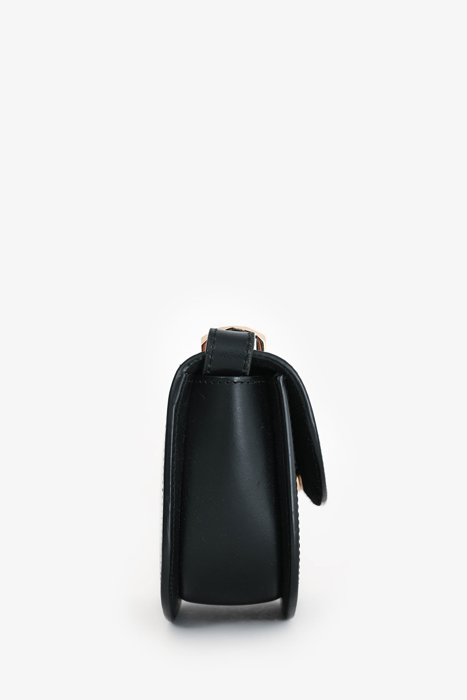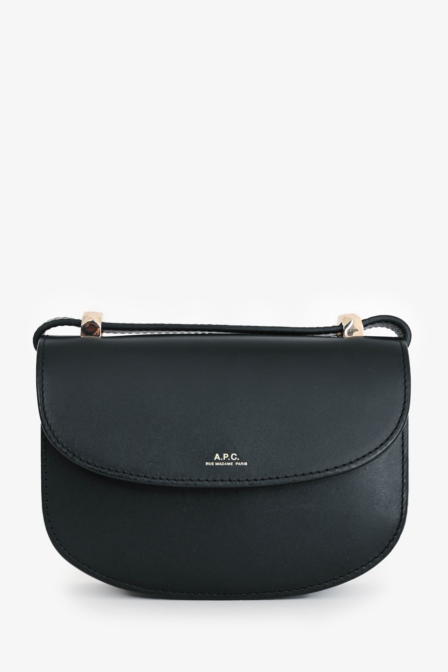 Refresh availabilityA.P.C. Black Leather Genève Mini Crossbody. Front fold-over flap with magnetic button closure. Tonal textile interior lining. Single interior wall slip pocket. Slide-around and adjustable strap. Gold-tone hardware.