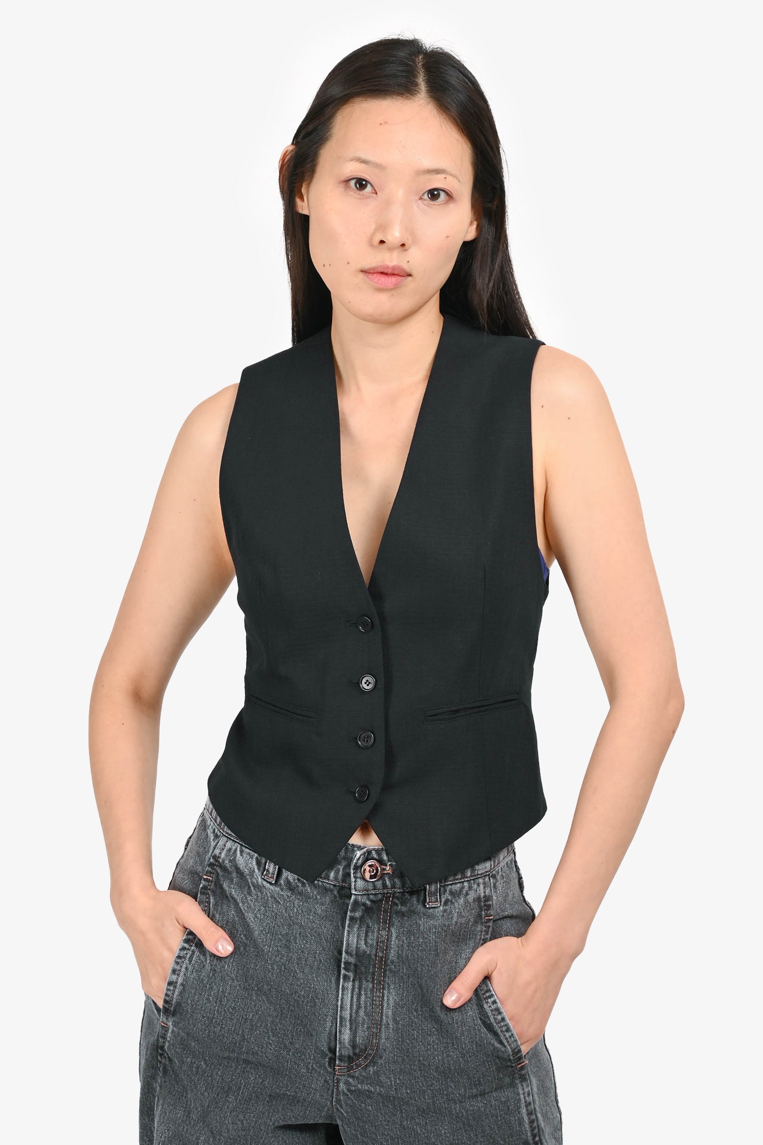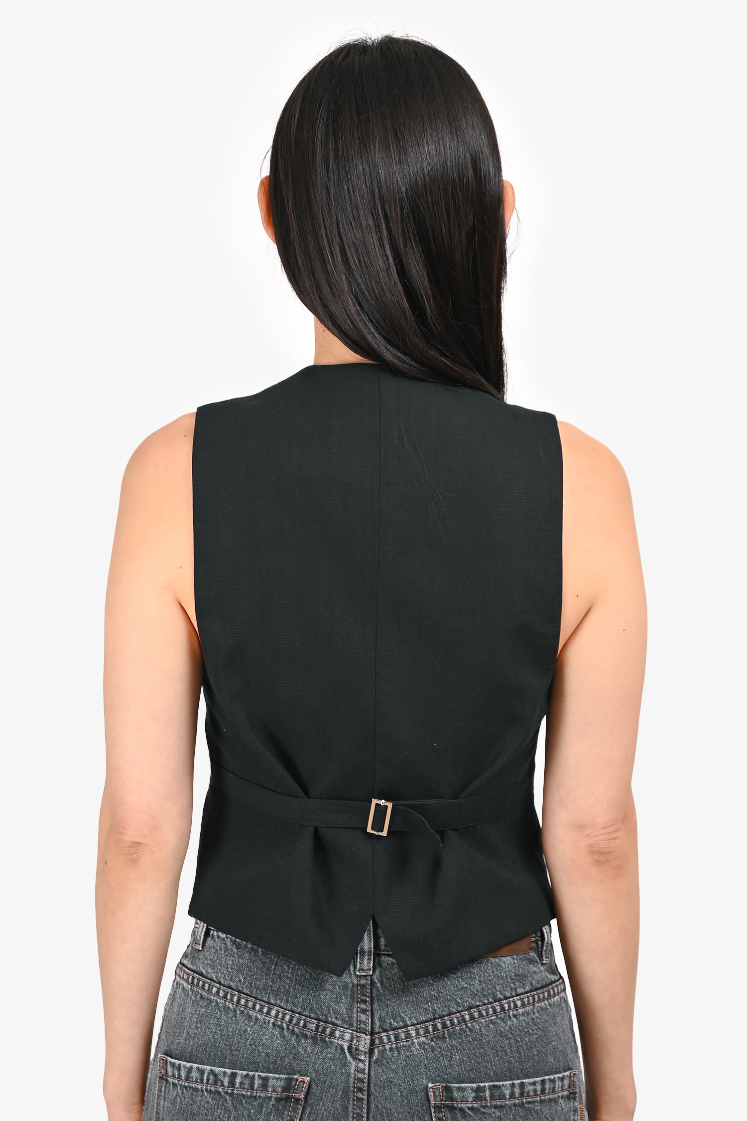 Refresh availabilityA Piece Apart Black Textured Vest. Pull-on. Button closure in the front. 2 exterior faux pockets. Lined. Tonal stitching.