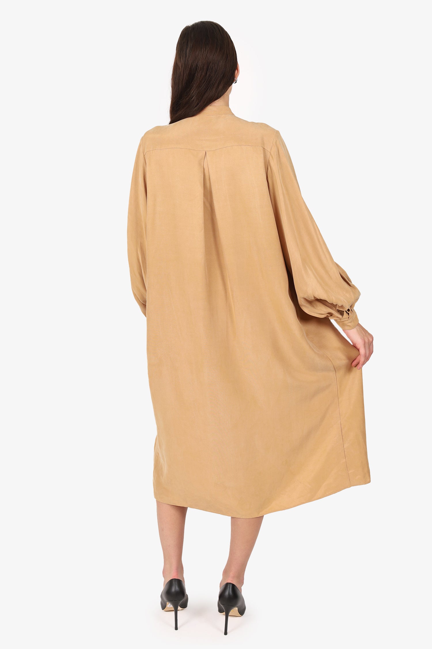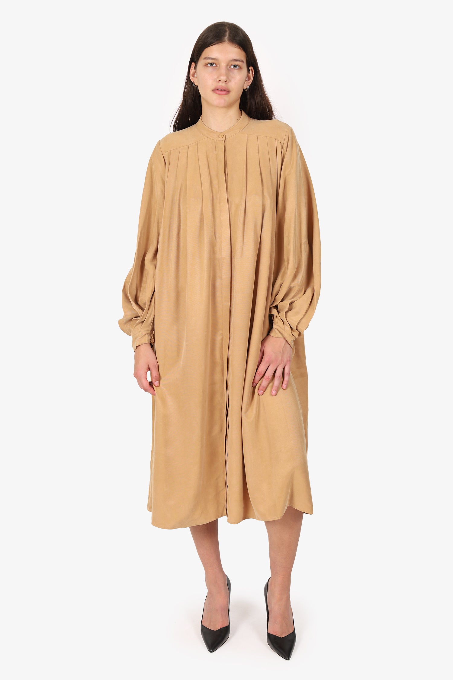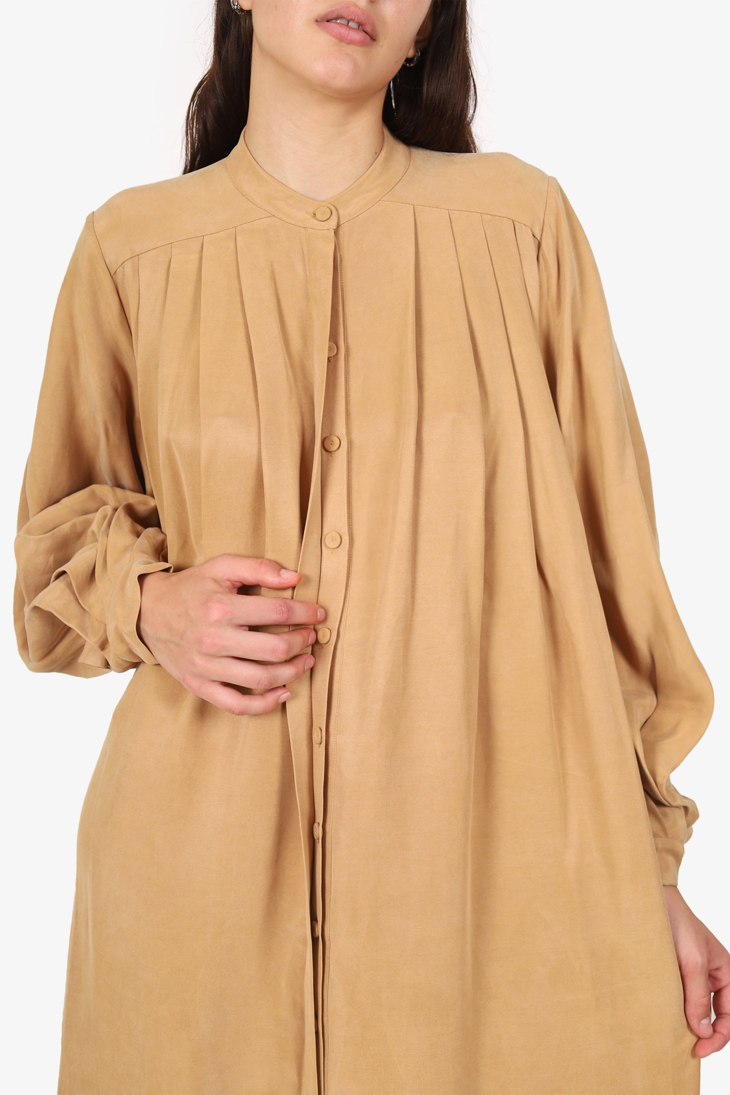 Refresh availabilityAcler Khaki Pleated Button-up Dress. Pull-on. Round-neckline. Front button-up closure. Sleeve cuffs with button-up closure. 2 front exterior side slip pockets. Tonal stitching.