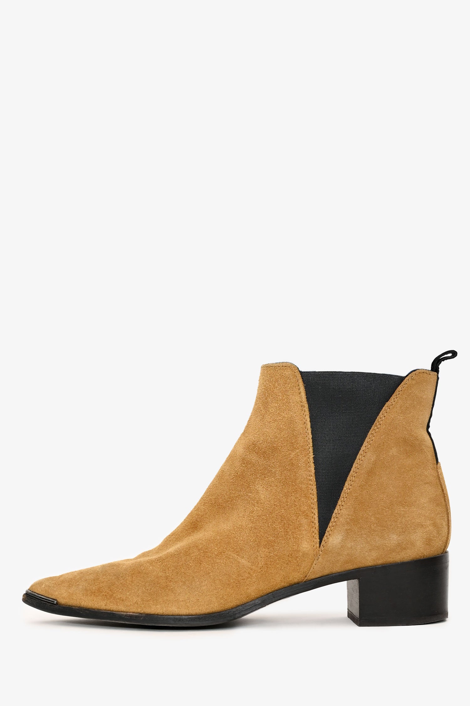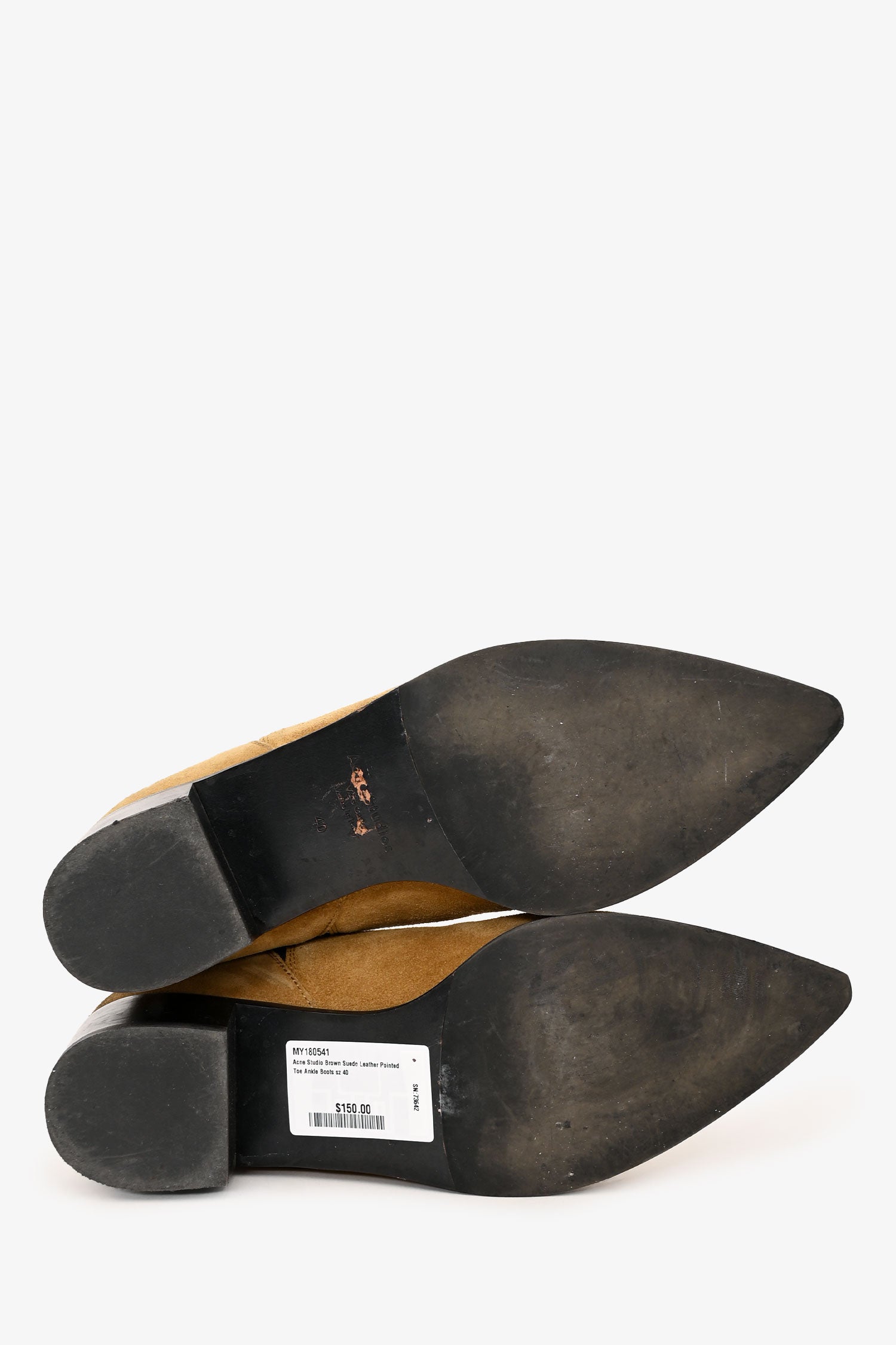 Refresh availabilityAcne Studios Brown Suede Leather Pointed Toe Ankle Boots. Pull-on. Pointed toe. Elasticized trims on the sides. Tonal stitching.