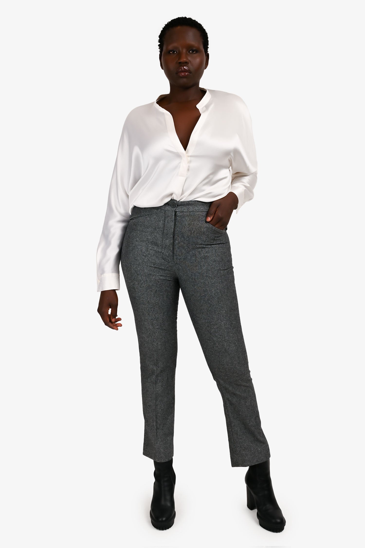 Refresh availabilityAcne Studio Grey High Waisted Slim Fit Pants. Front zip and hook closure. Waist belt loops. Two side pockets. Tonal stitching.