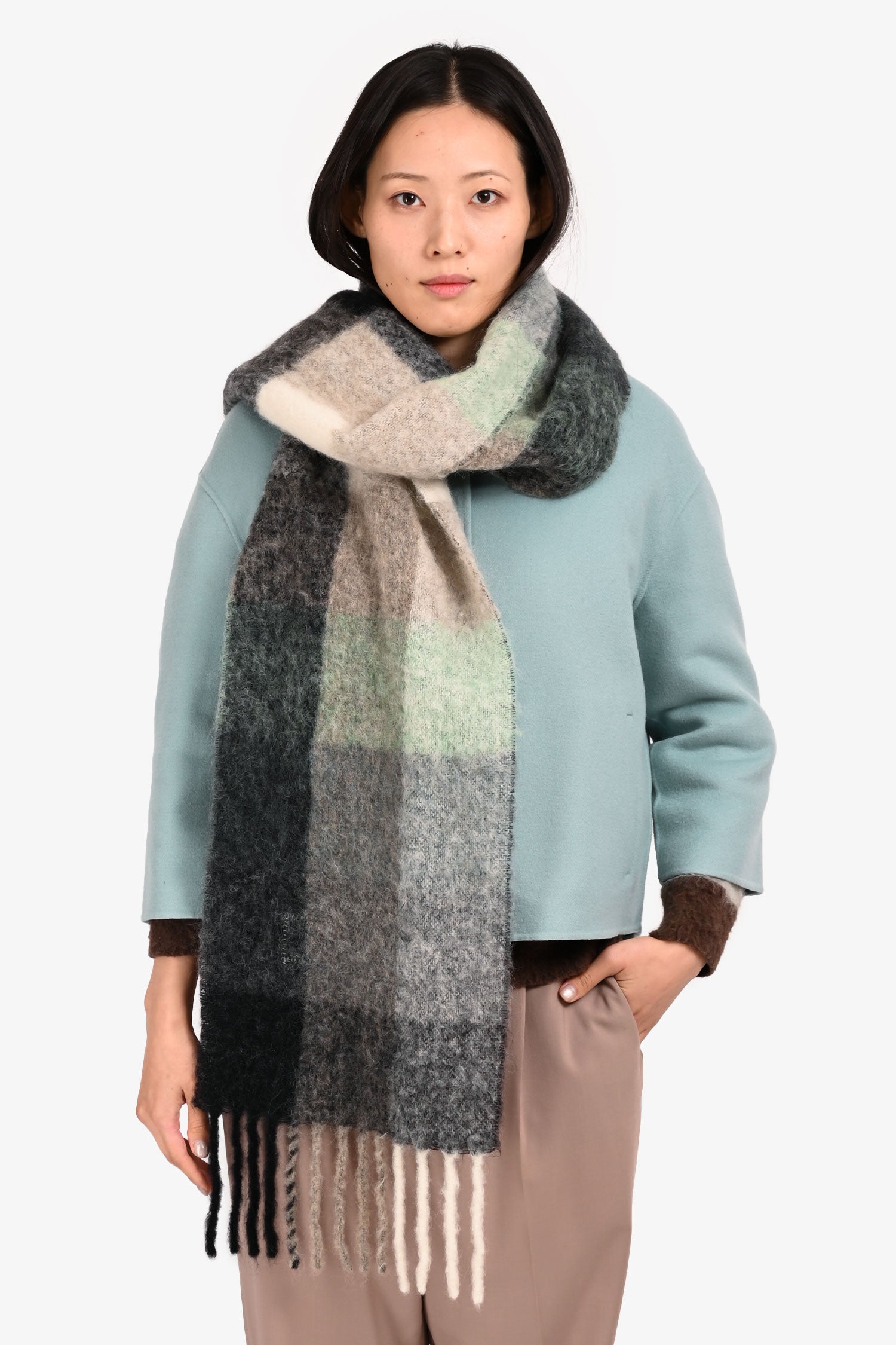 Refresh availabilityAcne Studios Black/Green/White Check Scarf. Fringe ends.