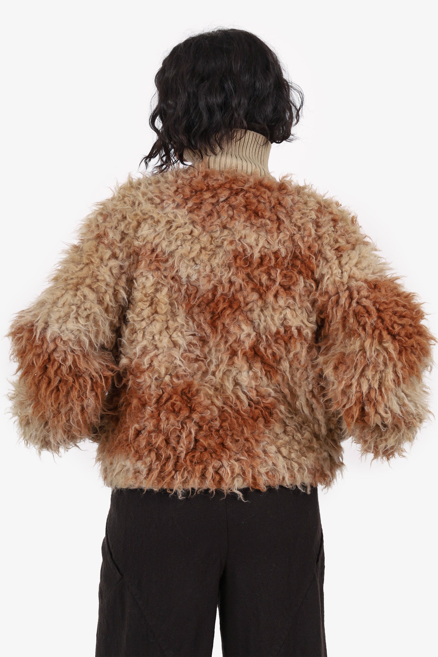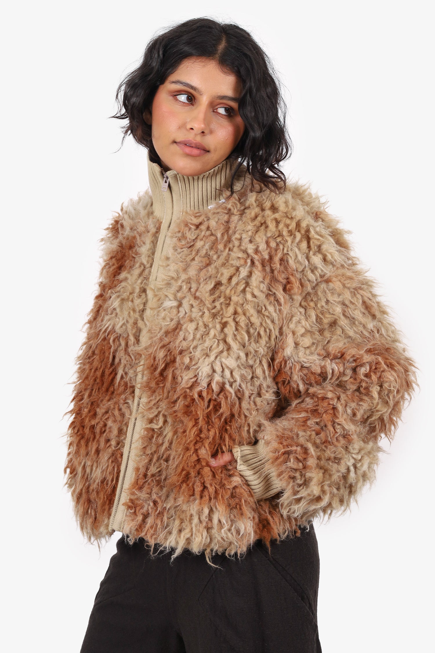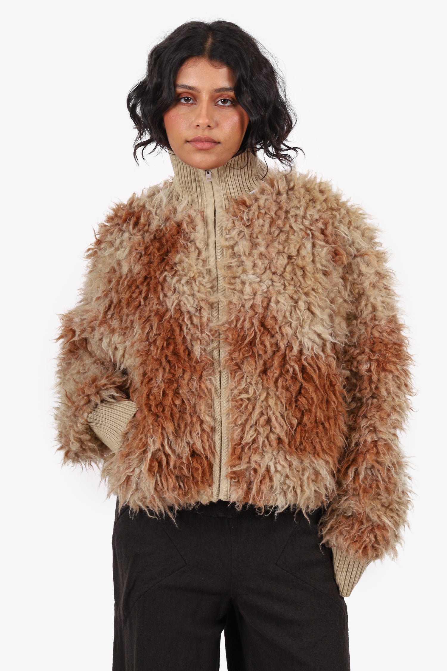 Refresh availabilityAcne Studios Brown Faux Shearling Jacket. Pull-on. Mock neckline. Front zip closure. Ribbed sleeve cuffs and neckline. Cinching drawcord at interior bottom. 2 exterior side slip pockets. 2 interior slip pockets. Tonal stitching.