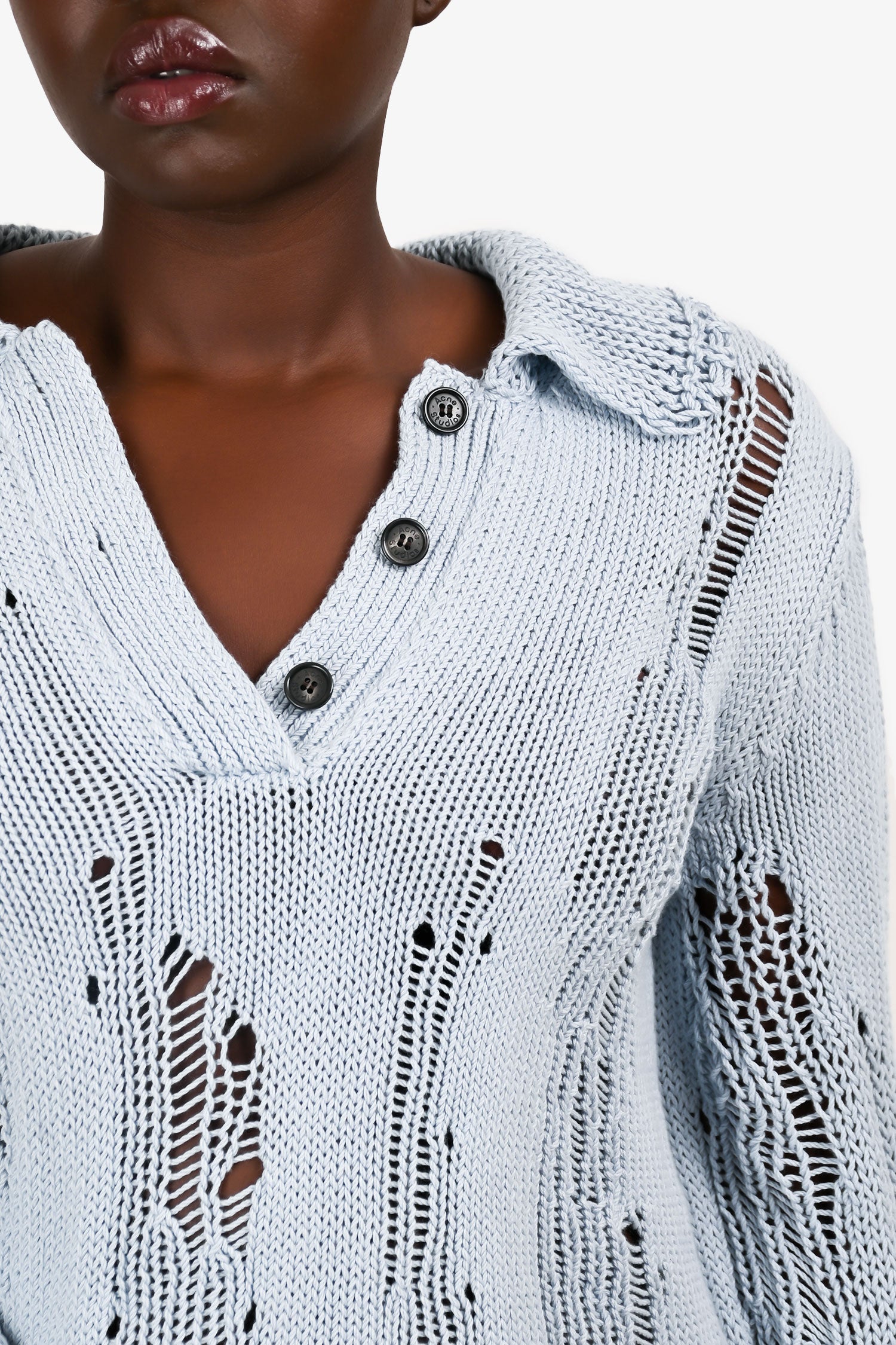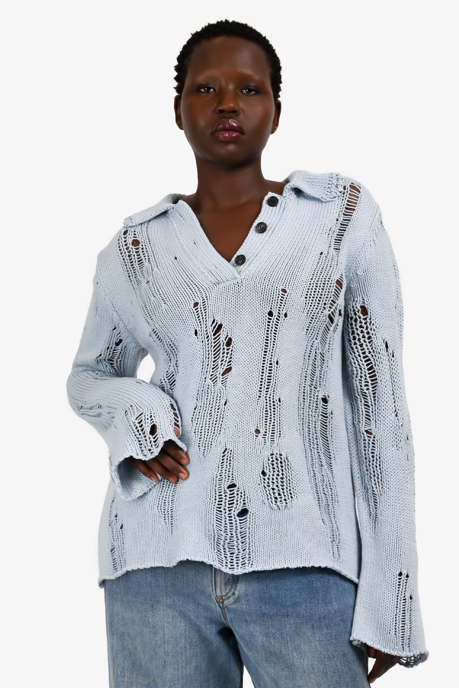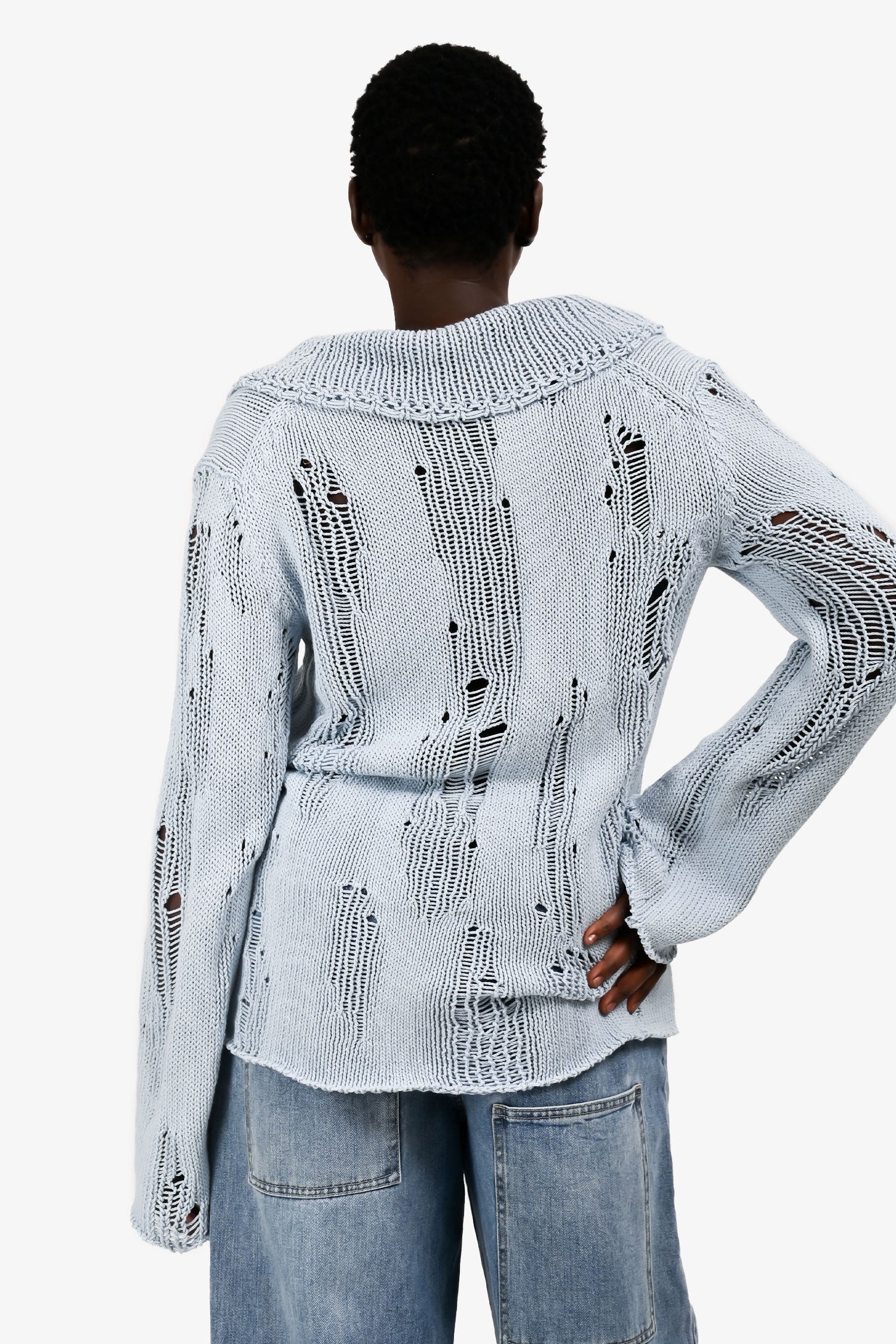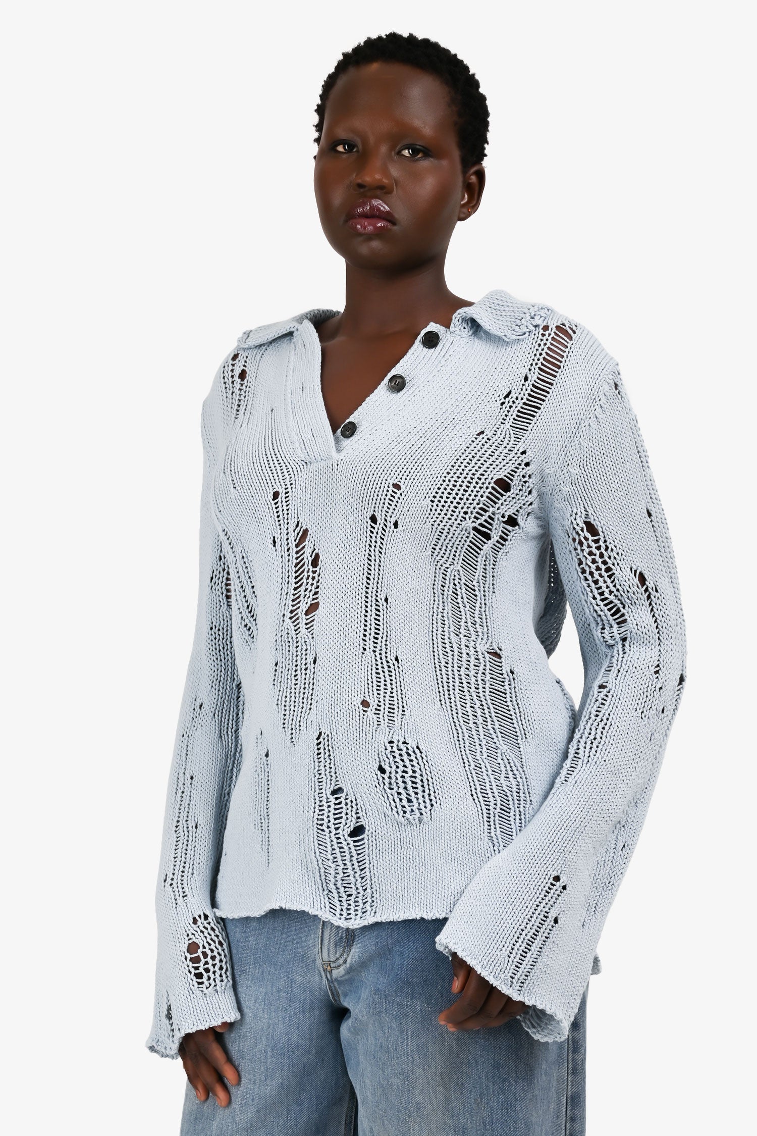 Refresh availabilityAcne Studios Light Blue Cotton/Wool Distressed Knit Sweater. Pull-on. Collared neckline. Front button-up closure. Flared sleeve cuffs. Tonal stitching.