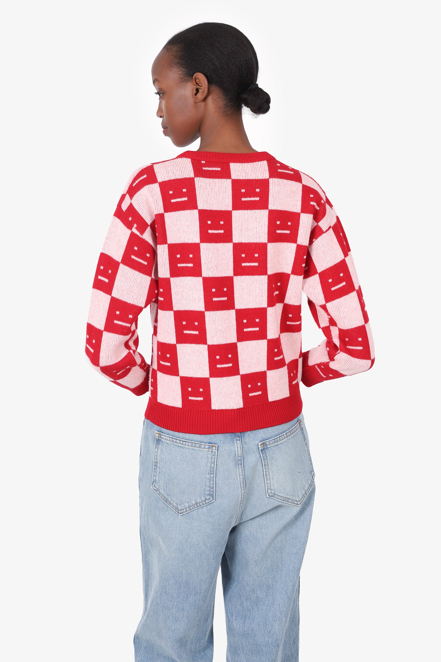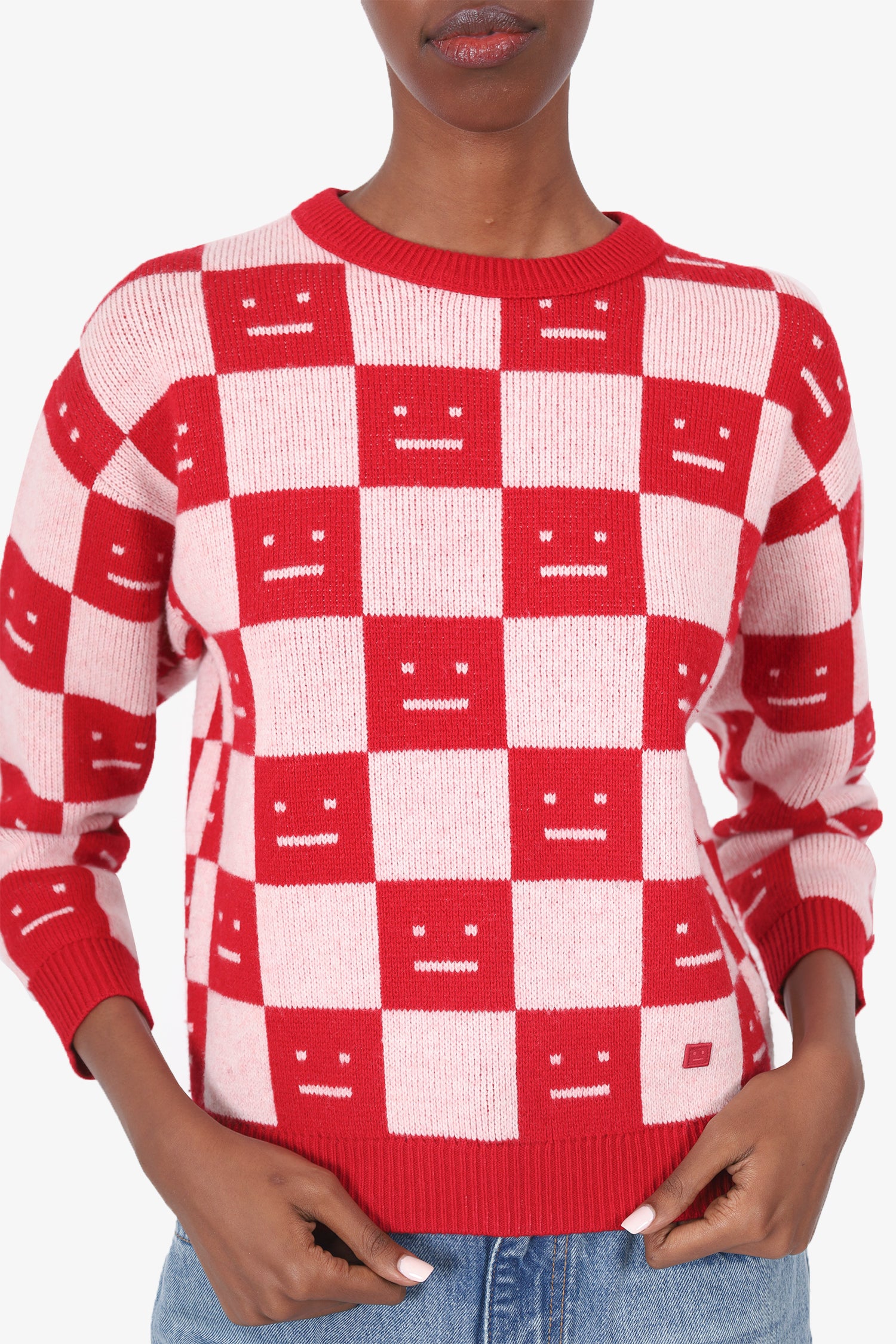 Refresh availabilityAcne Studios Red/Pink Wool Face Jacquard Sweater. Pull-on. Round neckline. Tonal stitching.