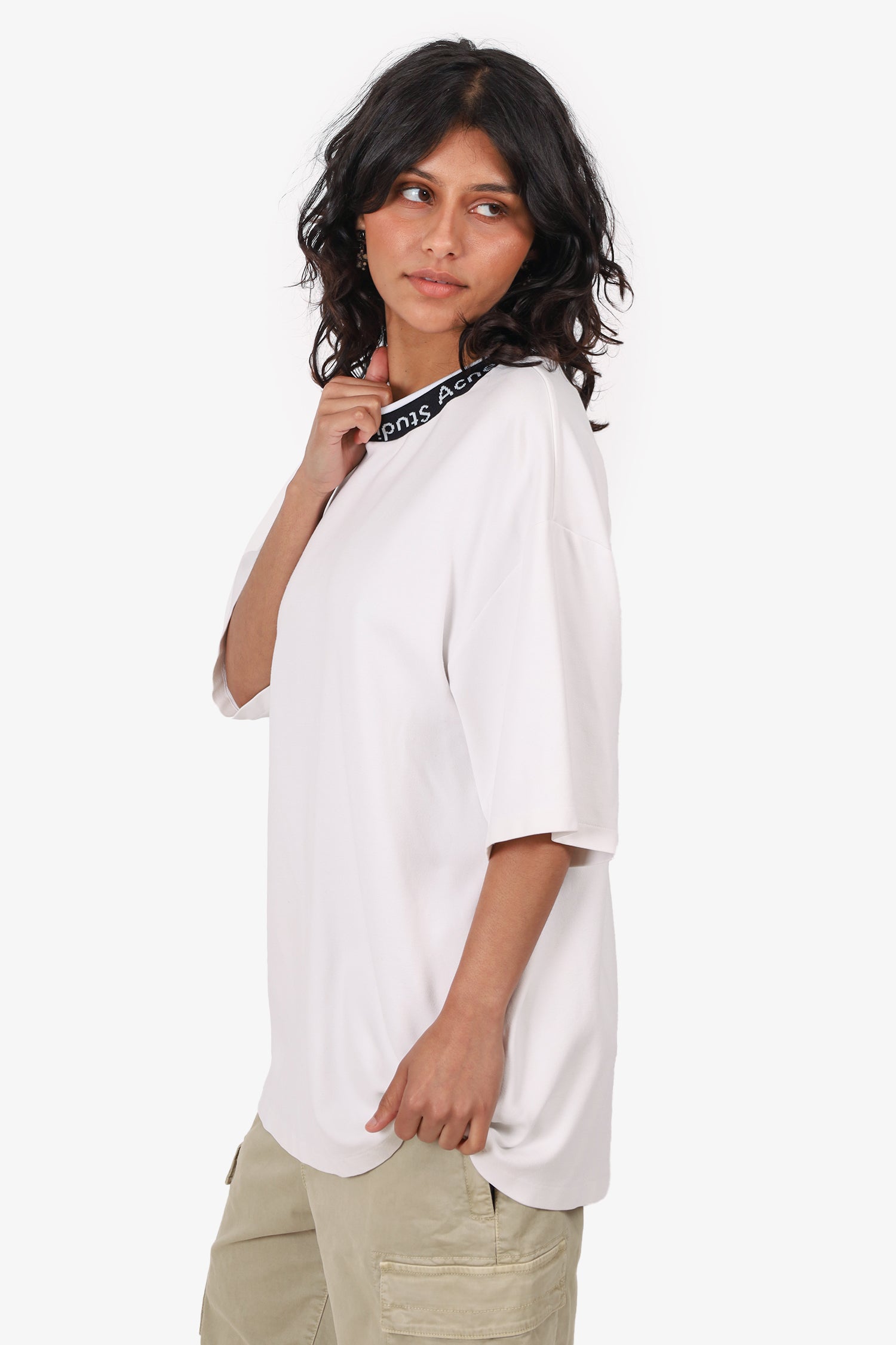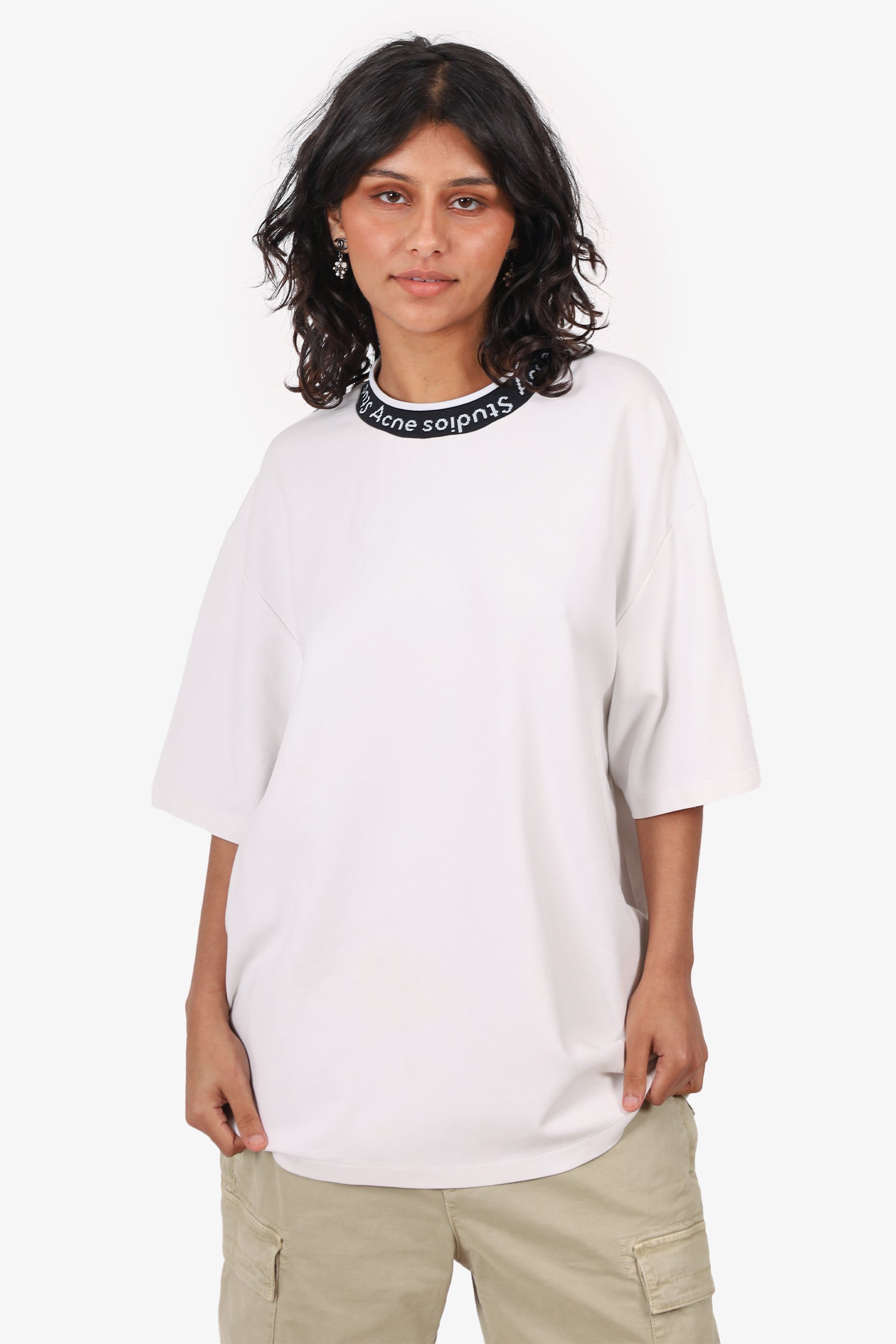 Refresh availabilityAcne Studios White/Black Logo Neck T-shirt. Pull-on. Round neckline. Tonal stitching.