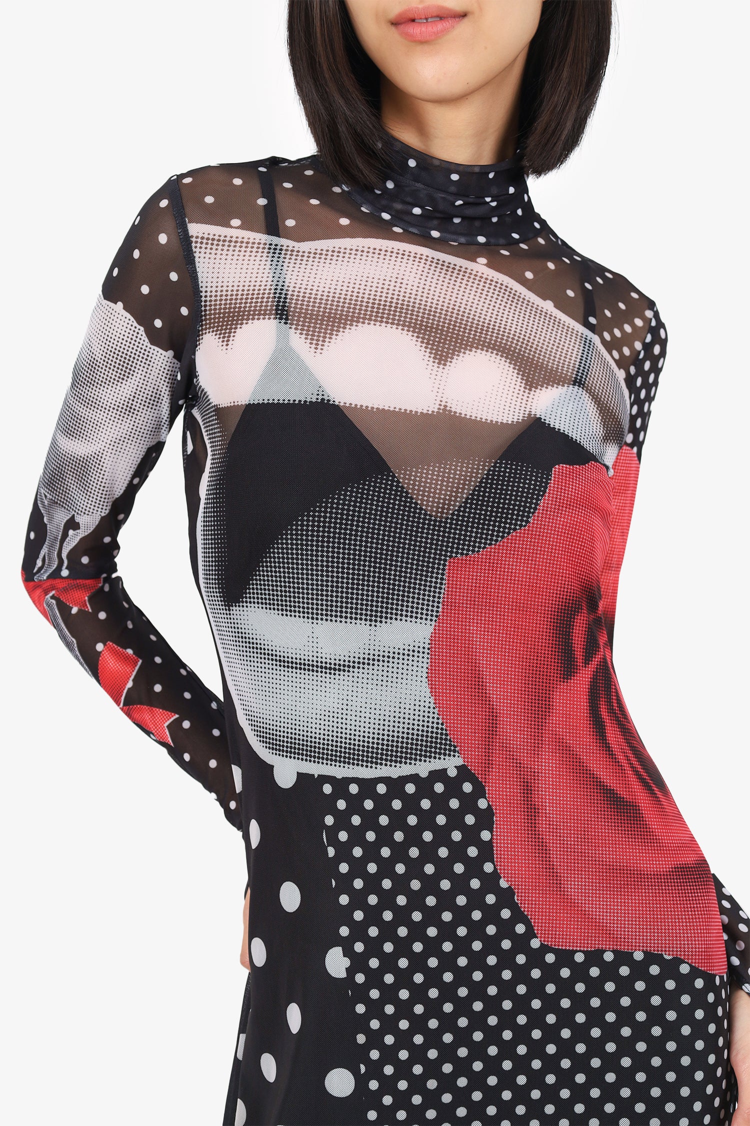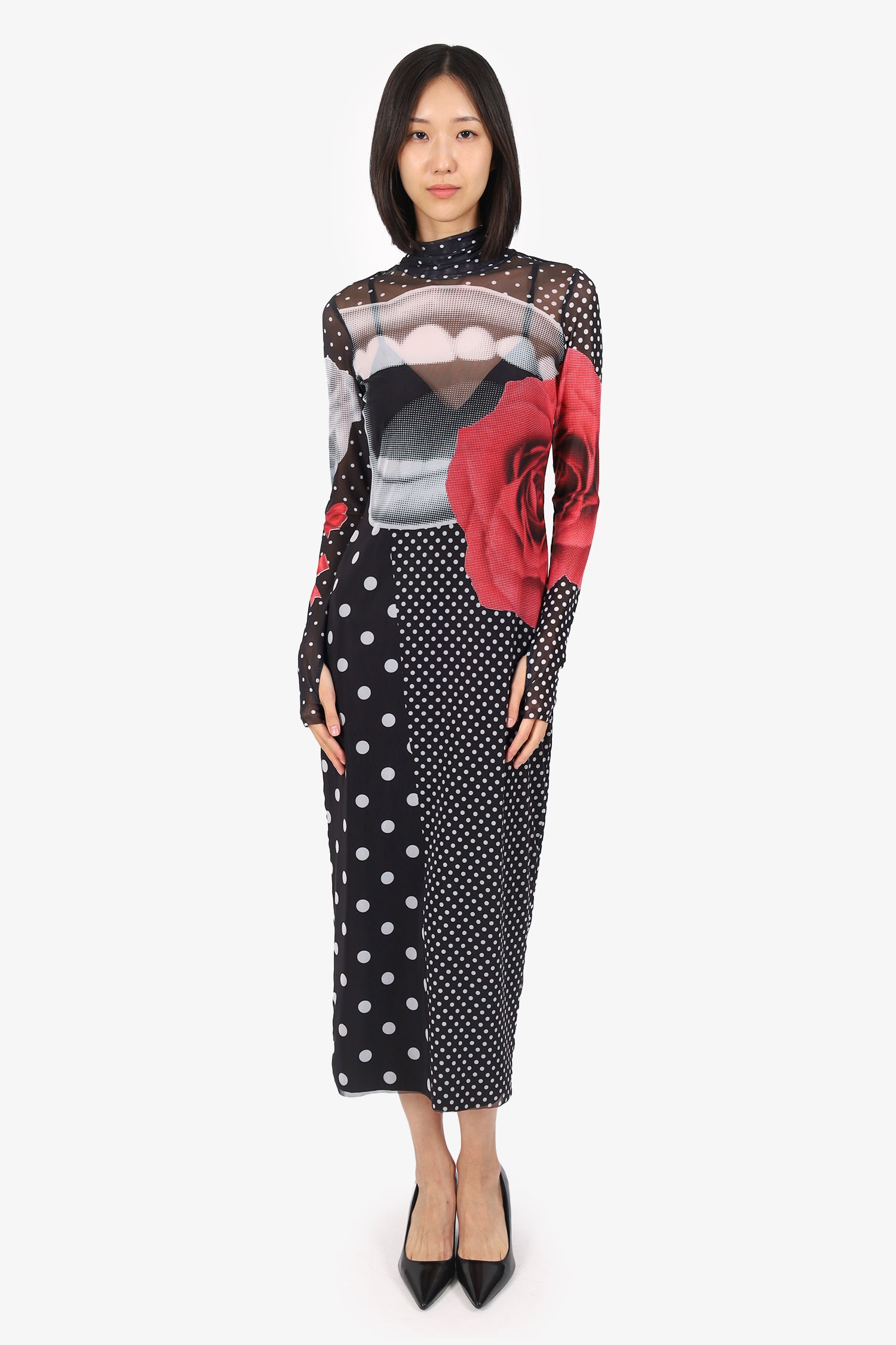 Refresh availabilityAFRM Black/Multicolour Long Sleeve Rose Printed Maxi Dress. Pull-on. Turtle-neckline. Mesh exterior. Thumb holes. Interior slip. Tonal stitching.