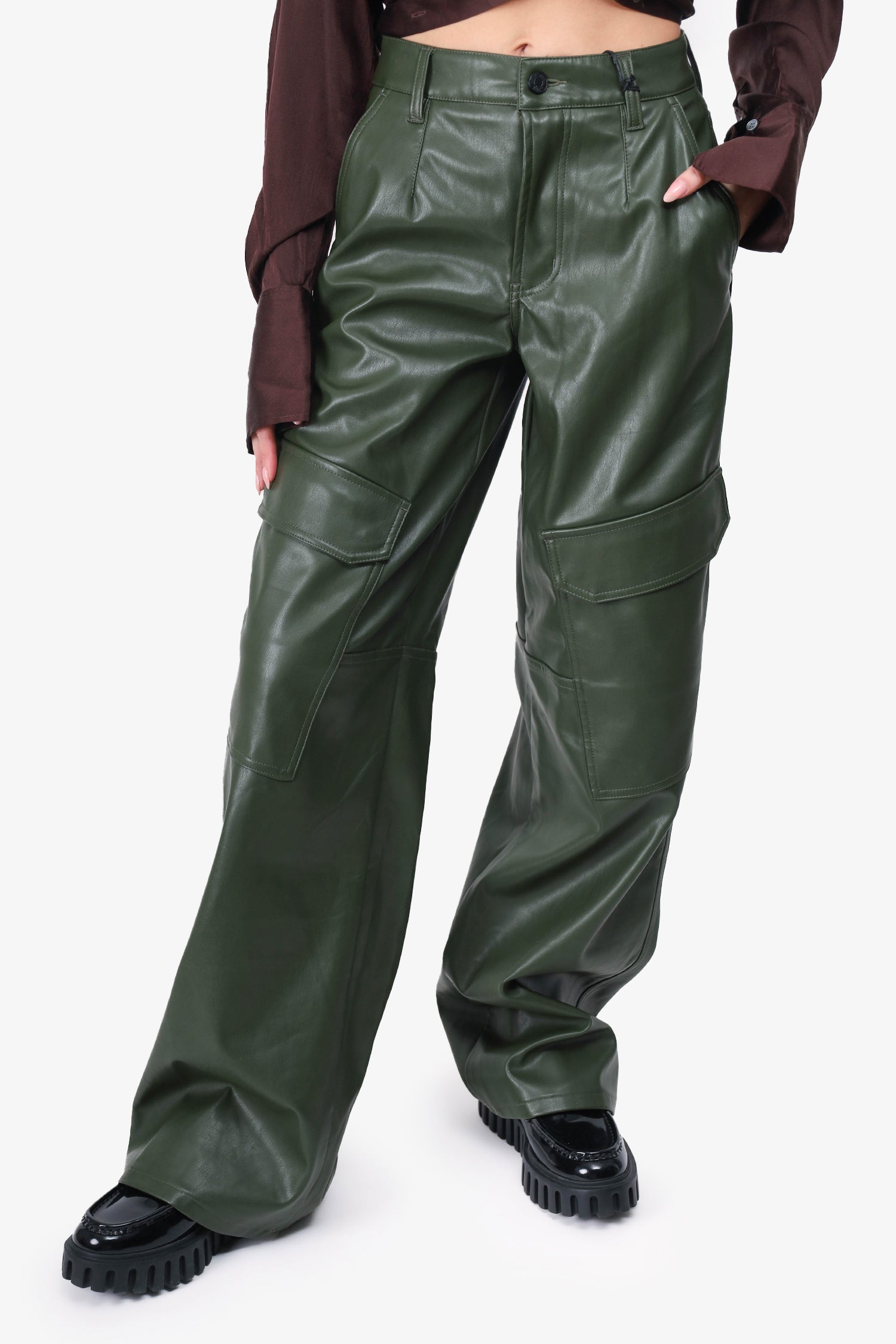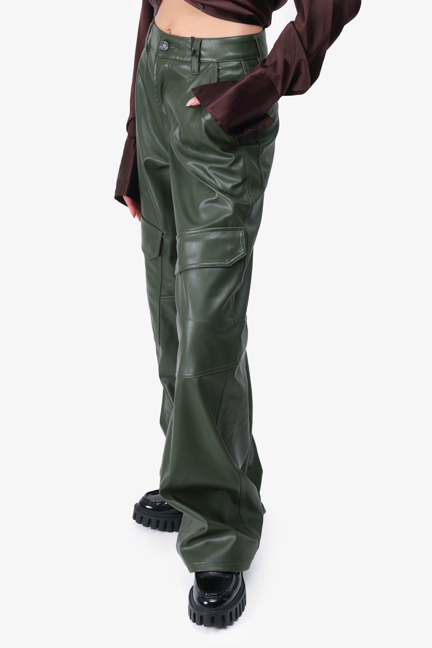 Refresh availabilityAFRM Green Faux Leather Cargo Pants. Front zip with button-up closure. Slip pockets on front and rear. Fold-over pockets on both legs. Unlined. Tonal Stitching.