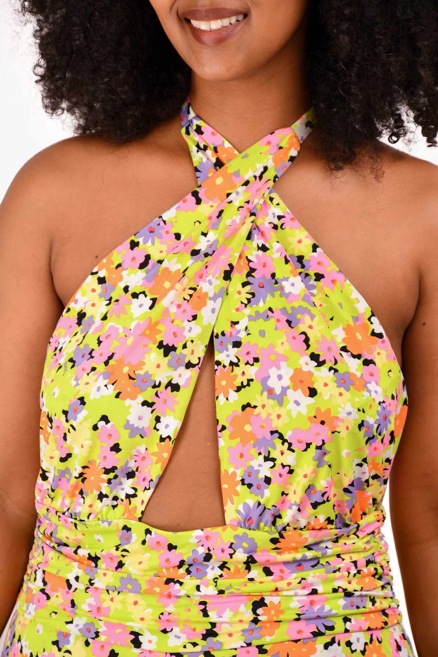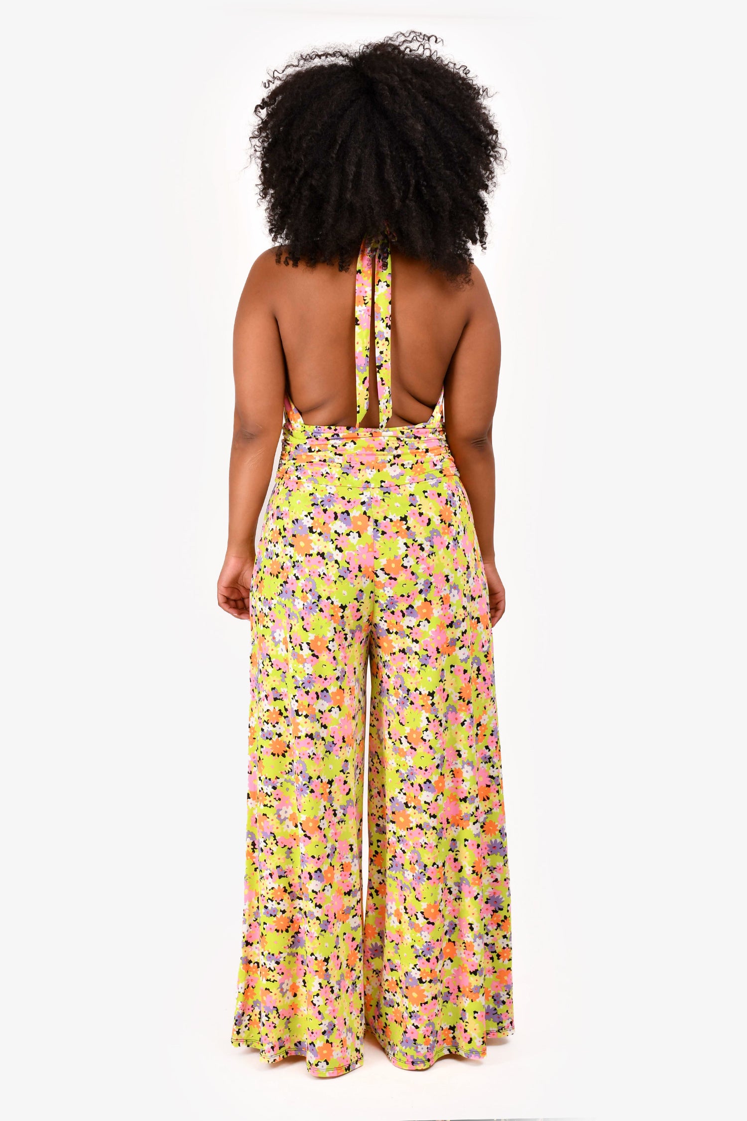 Refresh availabilityAFRM Yellow Pink Orange Floral Halterneck 'Pamela' Jumpsuit. Tonal fabric strap to wrap and tide at the back of the neck. Pull-on. Tonal stitching.