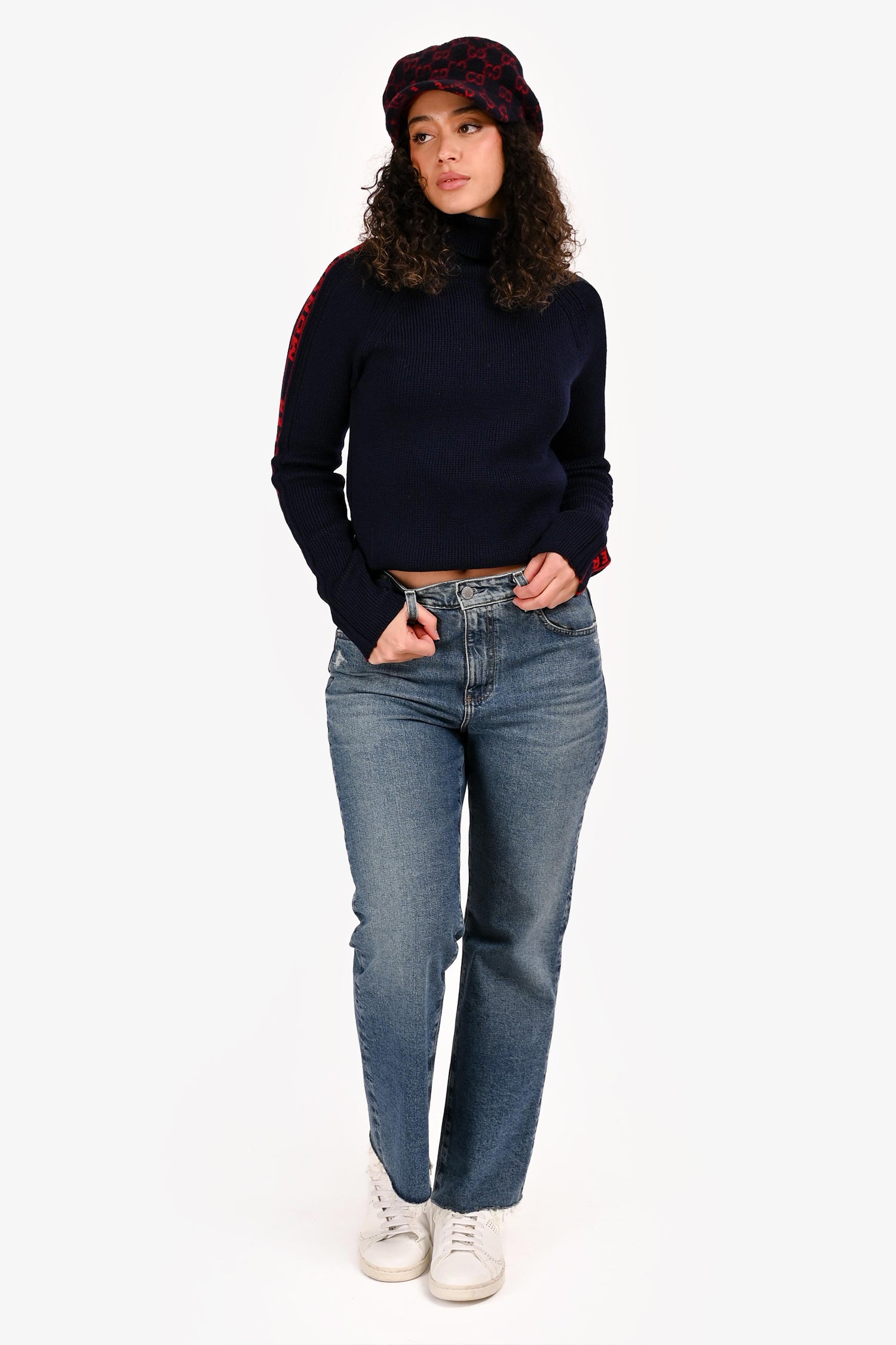 Refresh availabilityAG Blue Denim 'Kinsley' Cropped Boot Jeans. Front button and zip fly closure. Waistband belt-loops. Classic five-pocket styling. Raw-edge hemline. Tonal stitching.