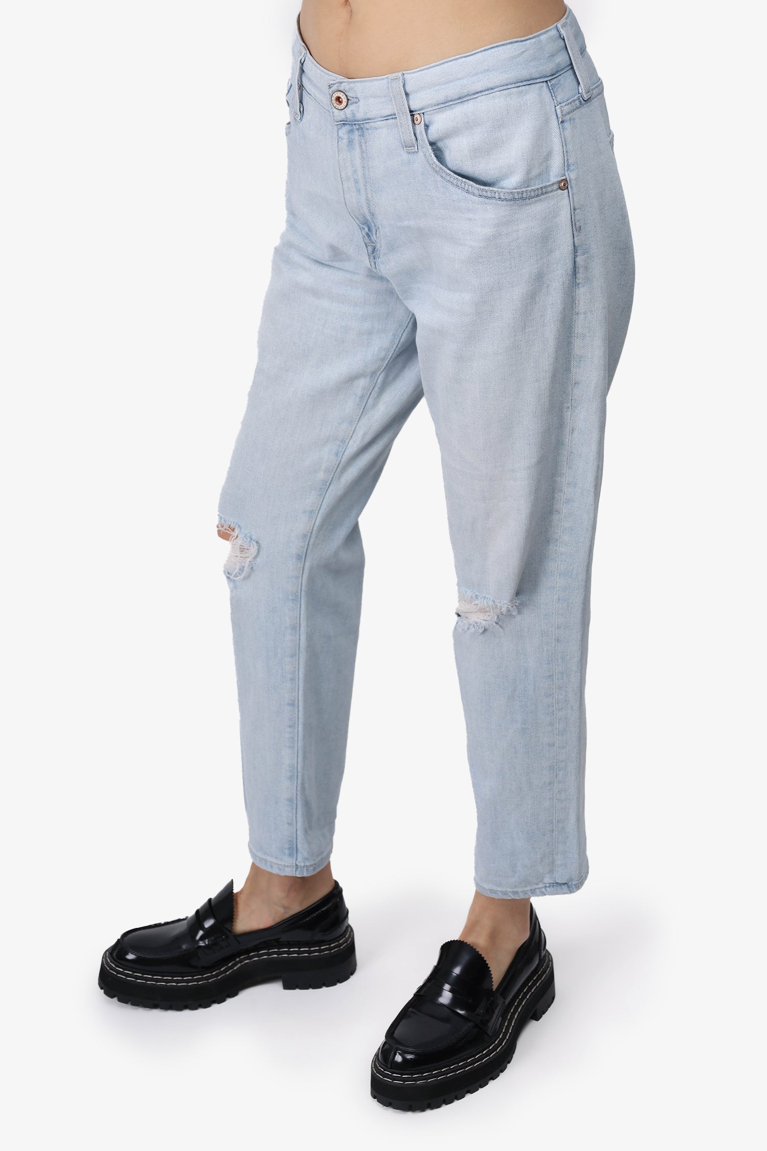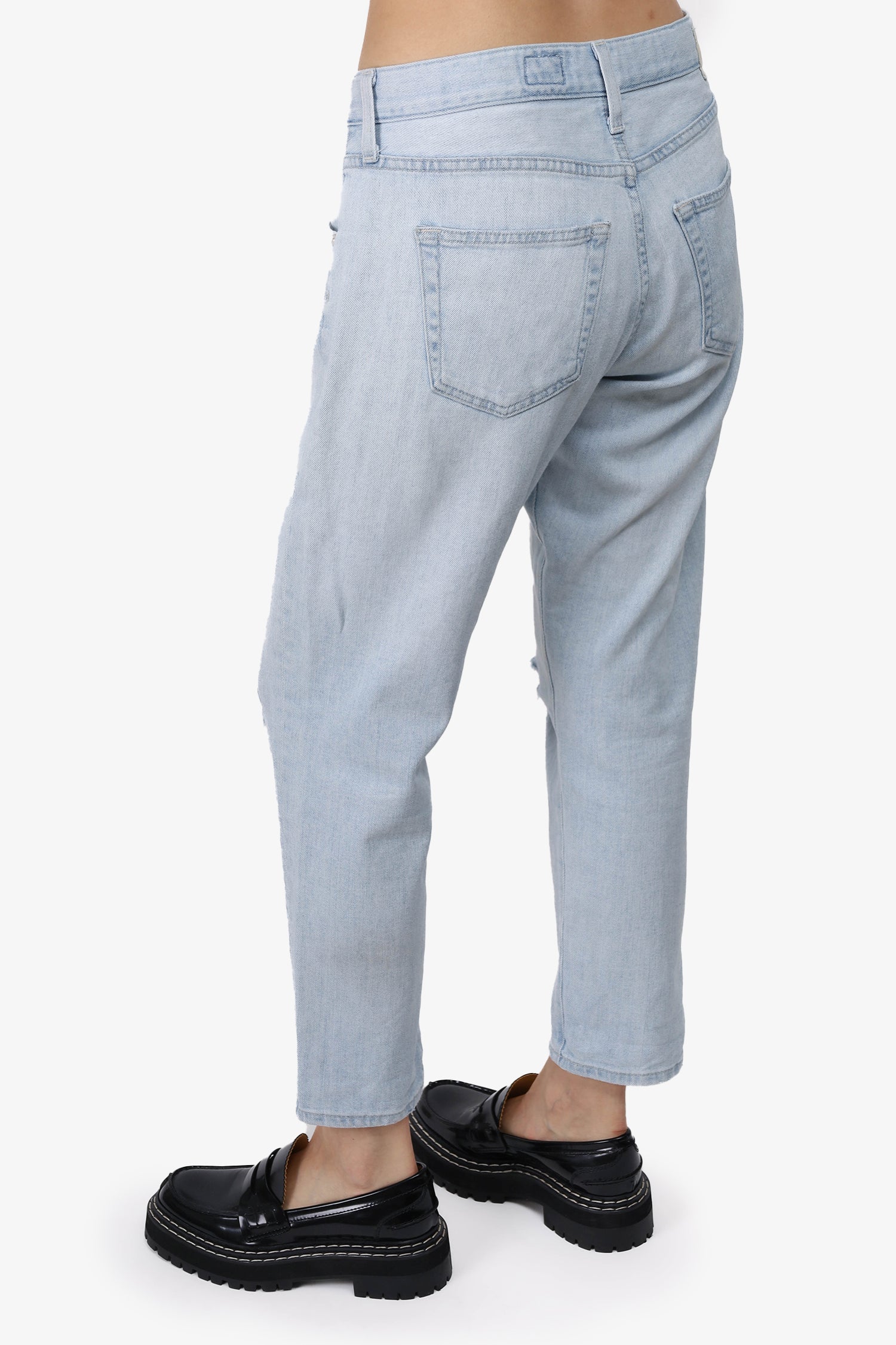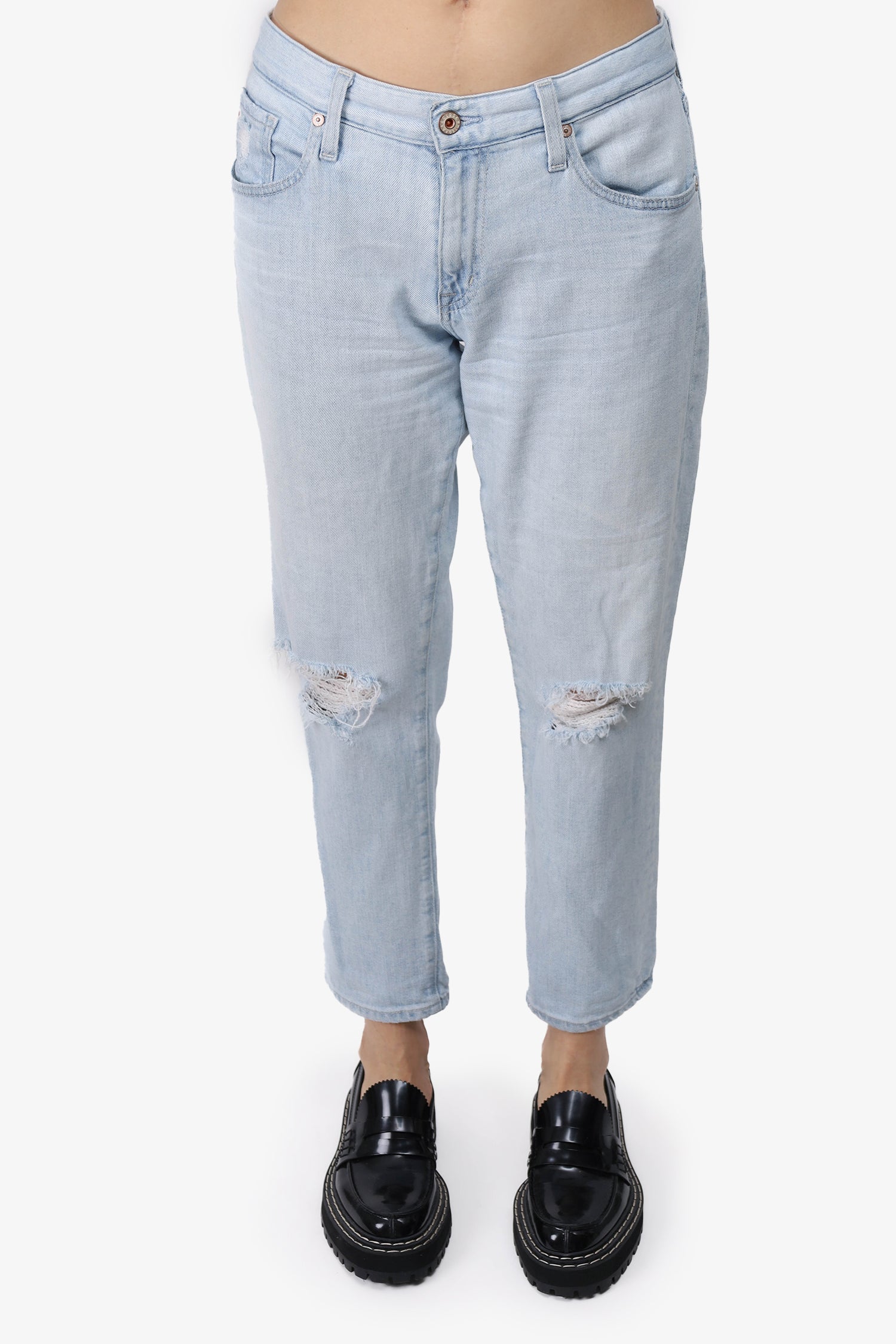 Refresh availabilityAG Blue Denim Ripped Jeans. Front zip with button-up closure. Front and rear slip pockets. Belt loops along waistline. Unlined. Contrast stitching.