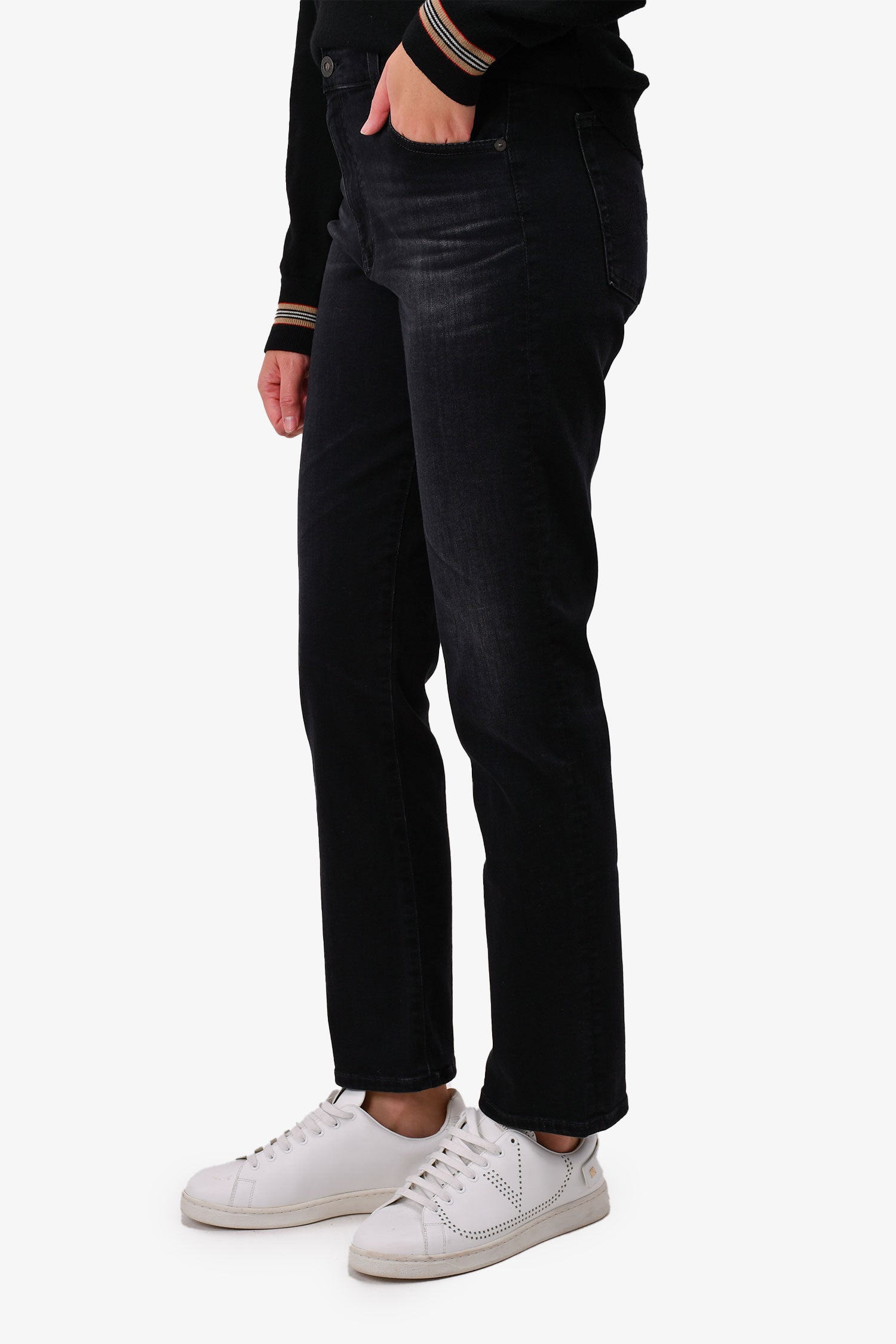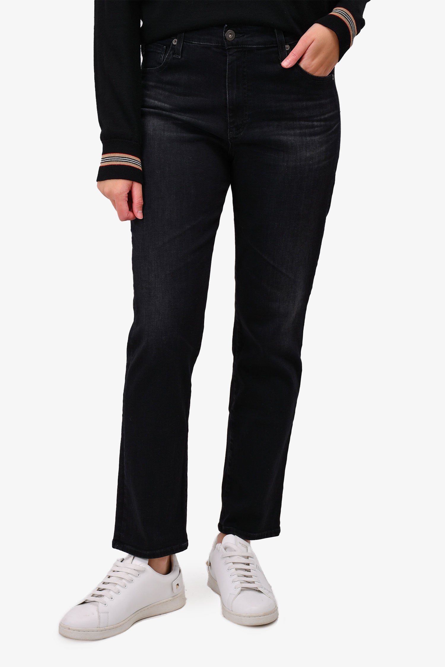 Refresh availabilityAG Dark Grey Denim 'Mari' High Rise Slim Straight Jeans. Front zip and button up closure. 5 slip pockets; 3 on front, 2 on back. Distressed pant legs. Tonal stitching. Unlined.
