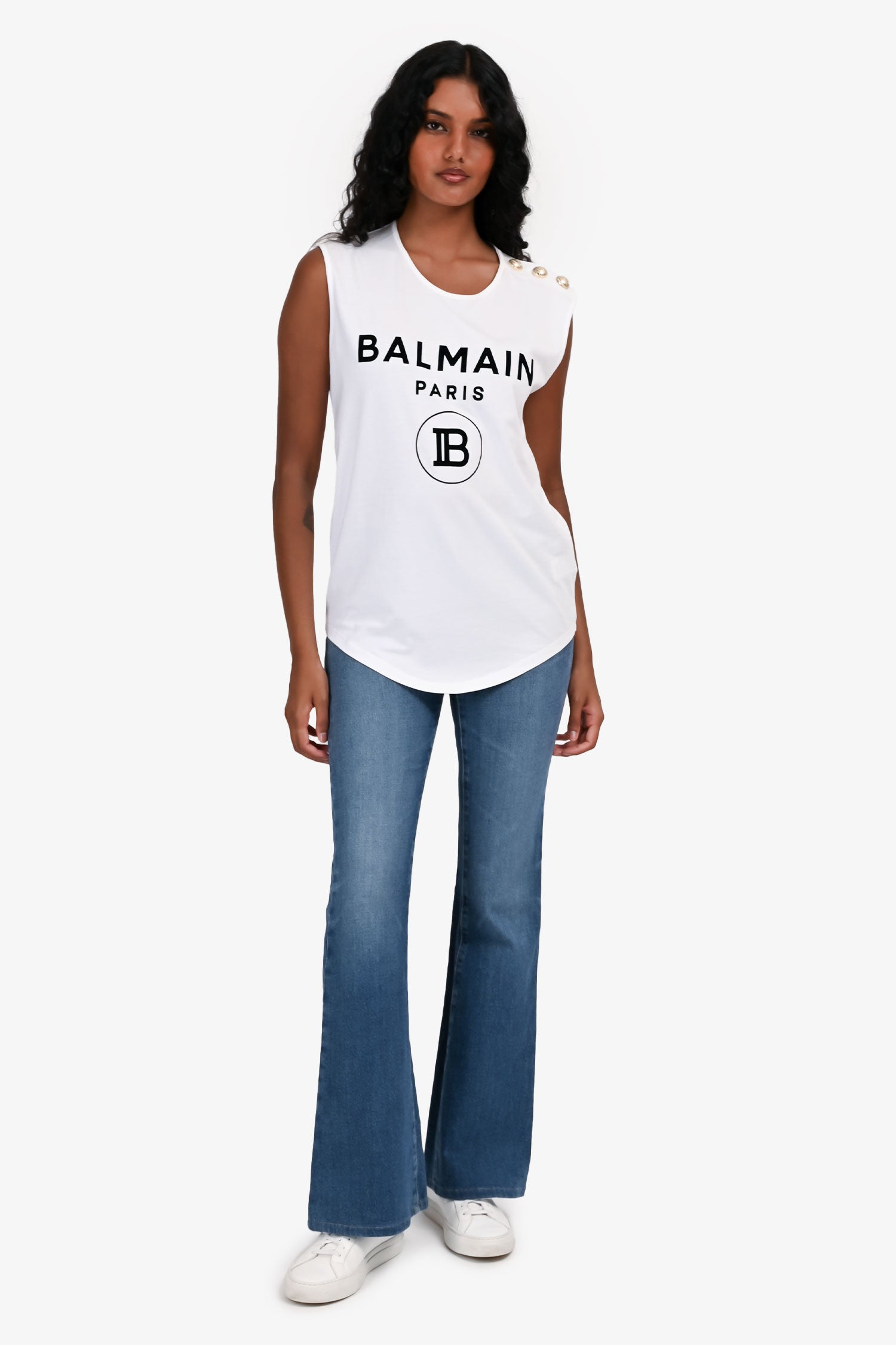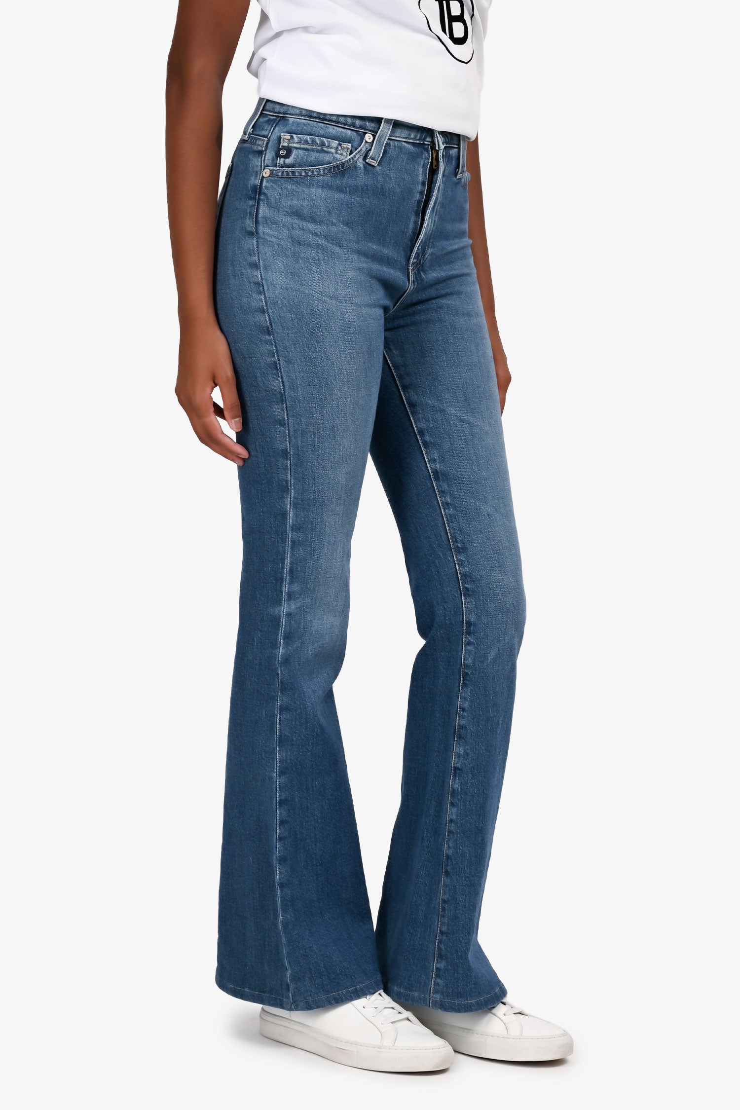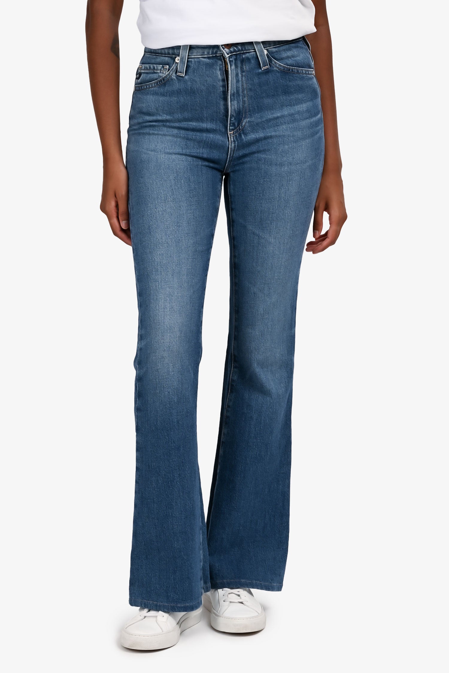 Refresh availabilityAG Light Blue 'Madi' High Rise Flare Jeans. Classic five-pocket styling. Zip fly with button closure. Belt loops. Faded wash throughout. Contrast stitching.