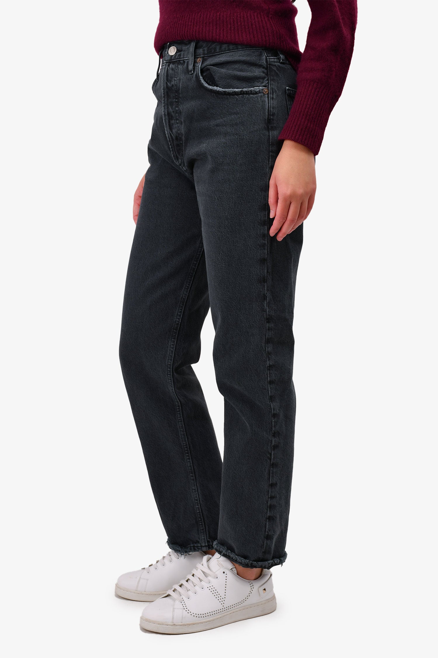 Refresh availabilityAgolde Black Denim '90s' Jeans. Front button up closure. 5 slip pockets; 3 on front, 2 on back. Distressed pant legs. Tonal stitching. Unlined.