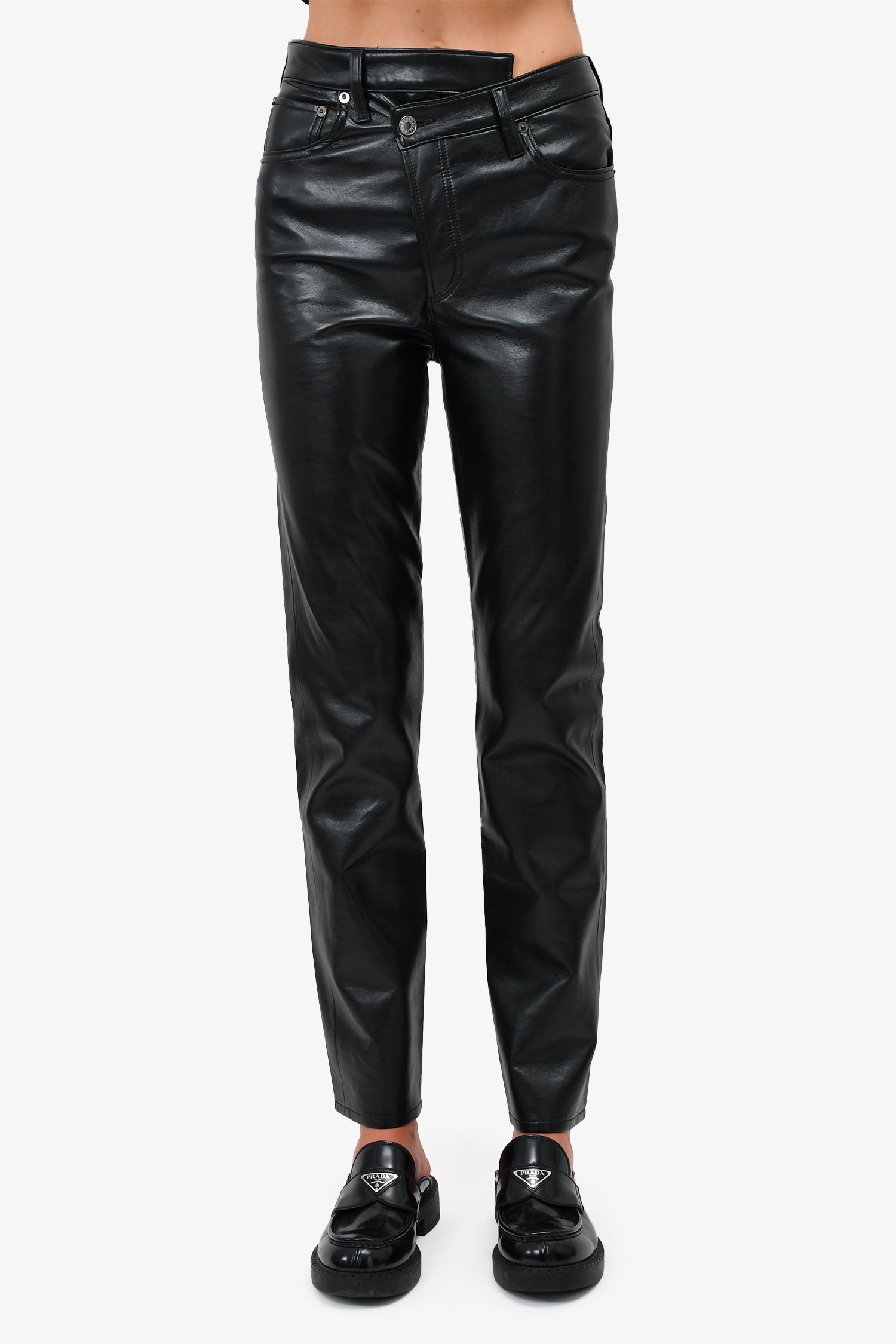 Refresh availabilityAgolde Black Recycled Leather Criss Cross Button Up Straight Leg Pants. Tonal stitching. Multi-button closure at the front. Glossed finish.