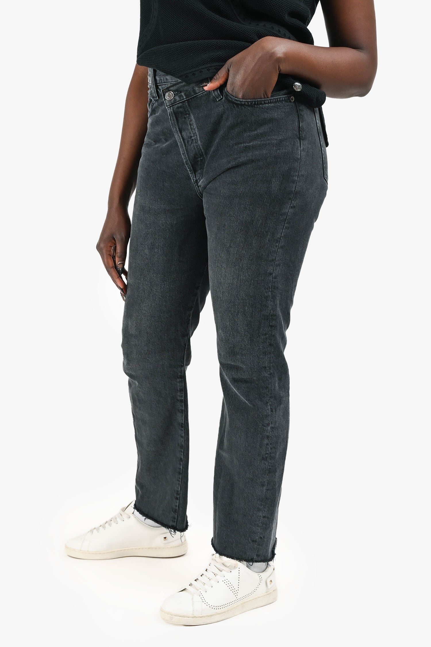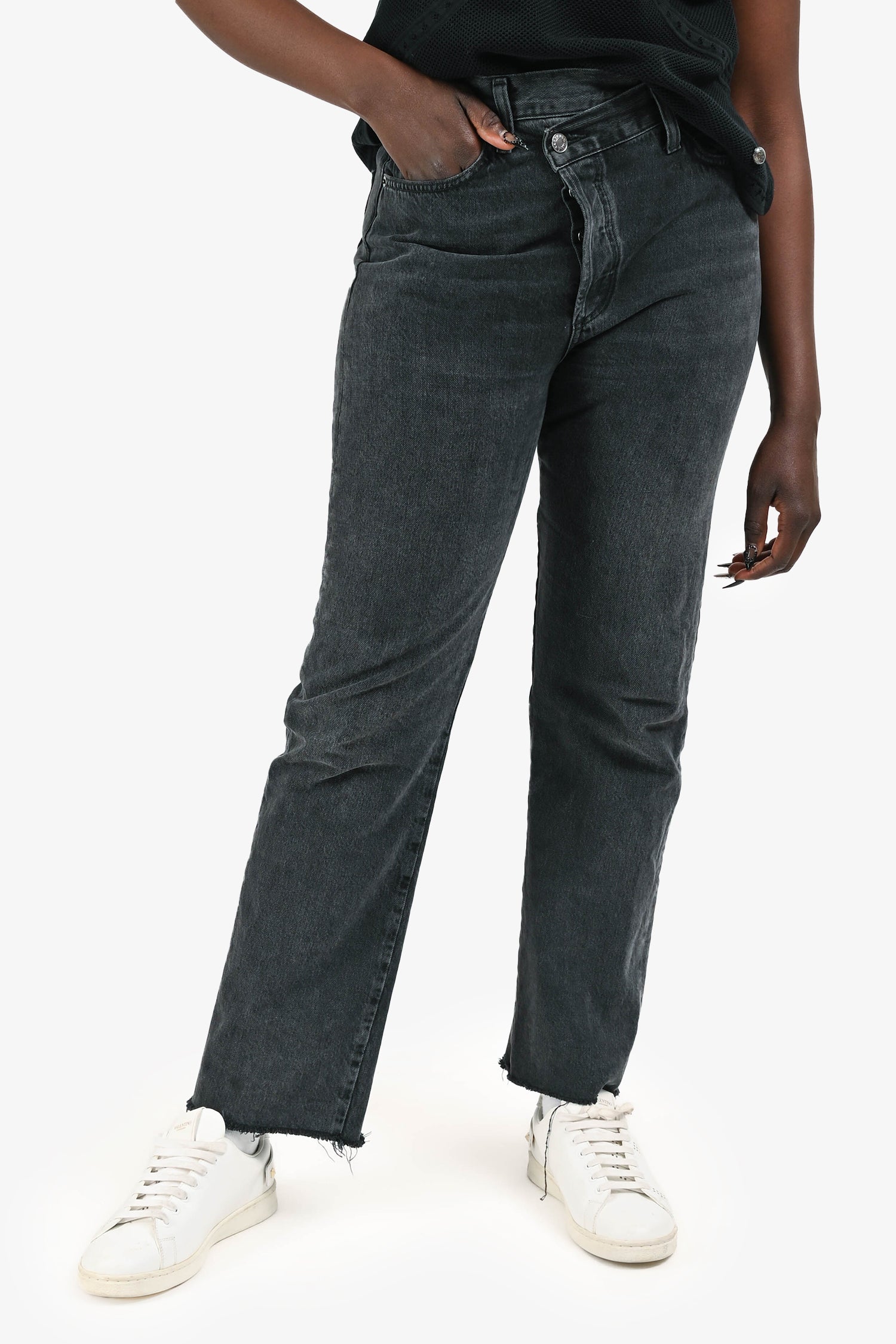 Refresh availabilityAgolde Black Wash 'Criss Cross' Denim. Multi-buttoned criss-cross closure. 5 slip pockets. Gunmetal hardware. Intentional distressed hemming. Tonal stitching.