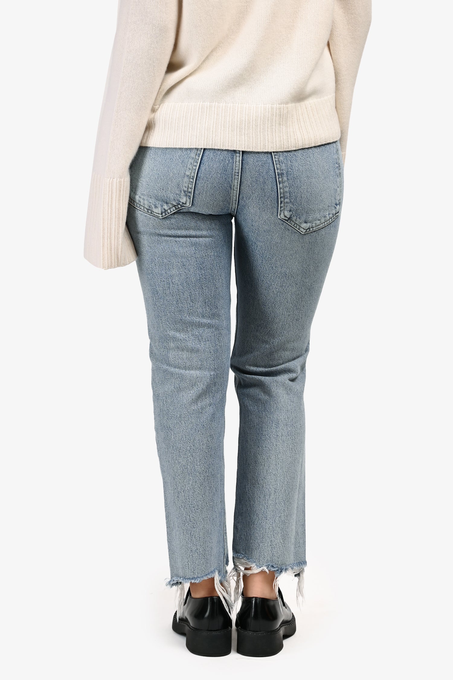 Refresh availabilityAgolde Blue Denim Distressed Detail Jeans. Pull-on. Hidden button closure in the front. Belt loops at the waist. Classic 5-pocket style. Distressed detailing on the pockets and hemline. Silver-tone hardware. Tonal stitching.