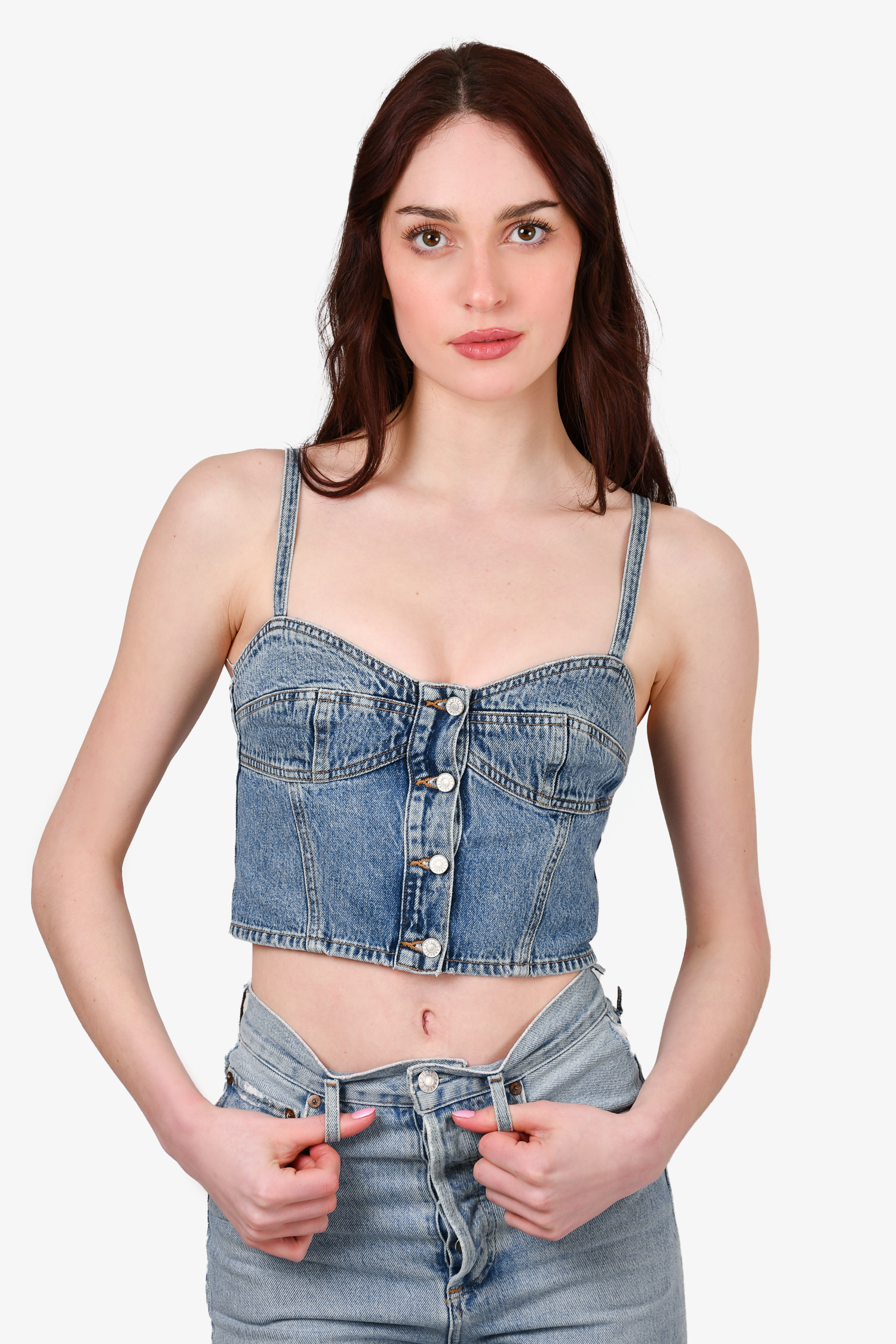 Refresh availabilityAgolde Blue Denim 'Lola' Crop Top. Front button-up closure. Unlined. Contrast and tonal stitching.