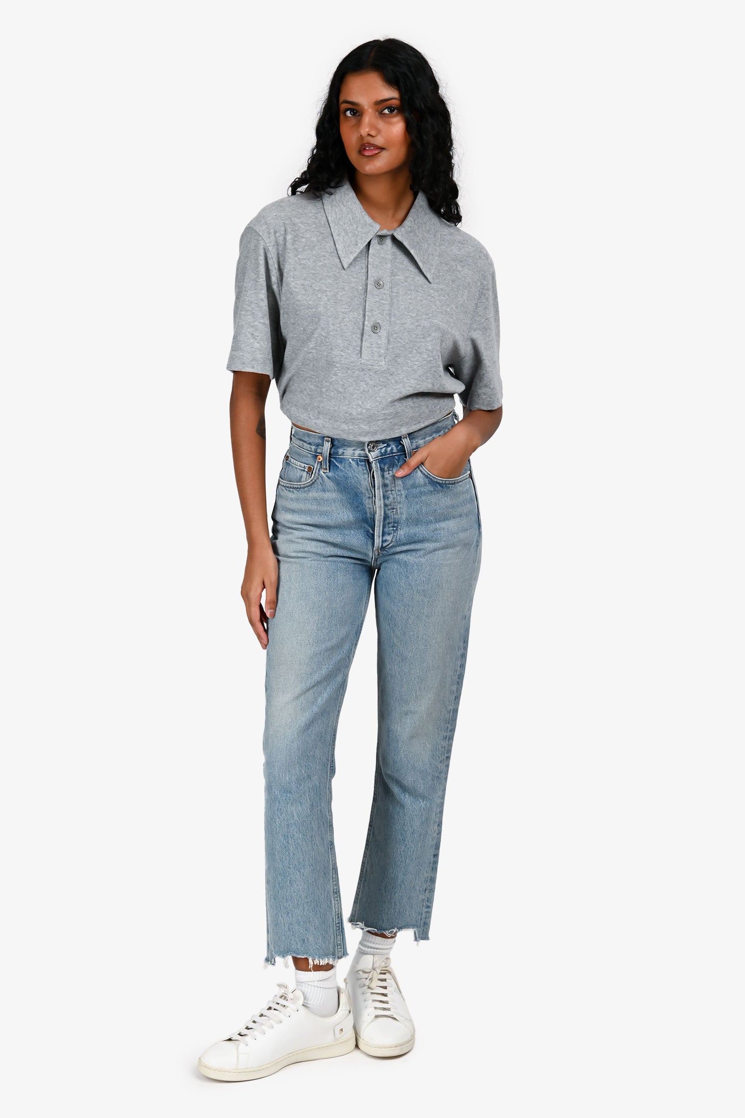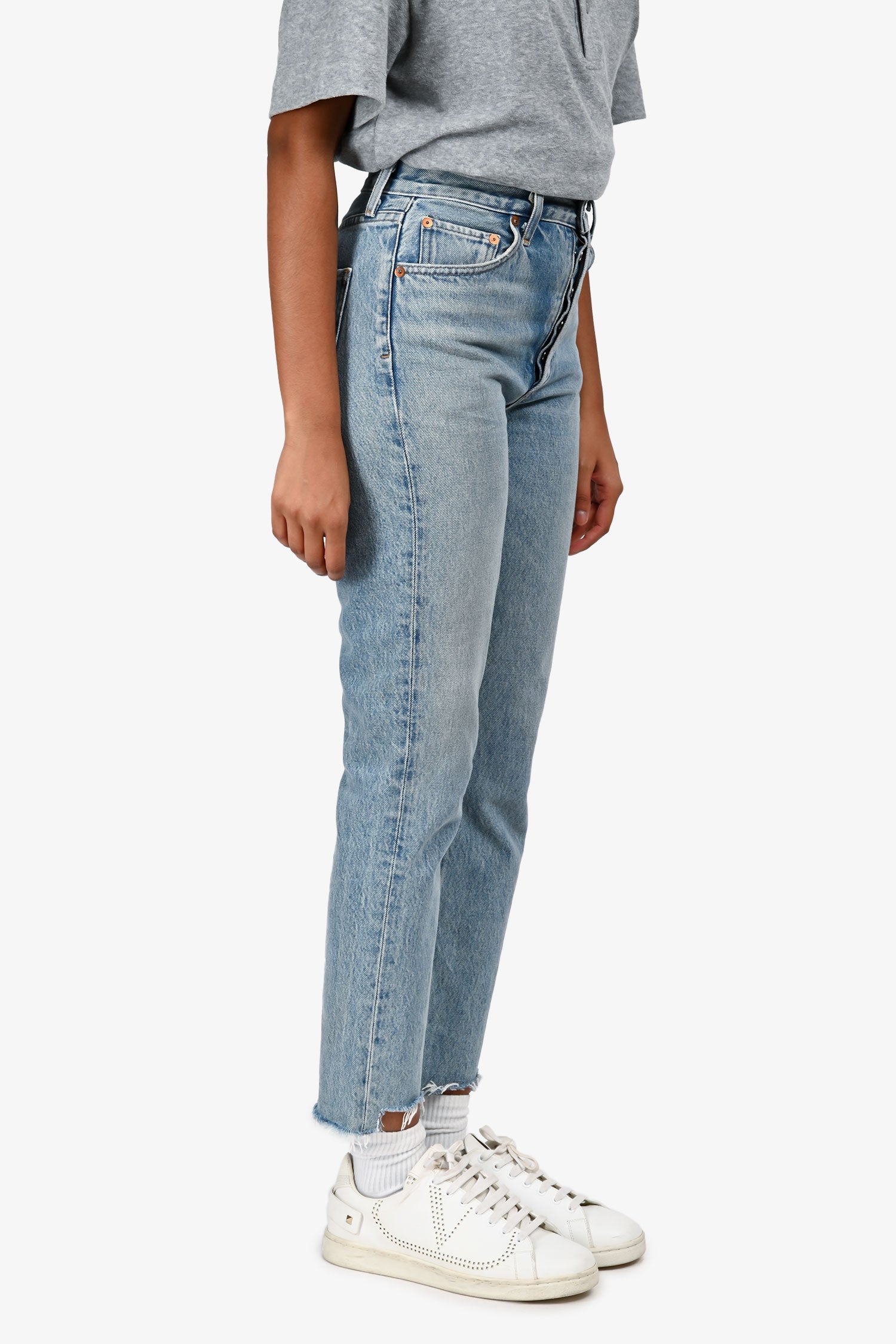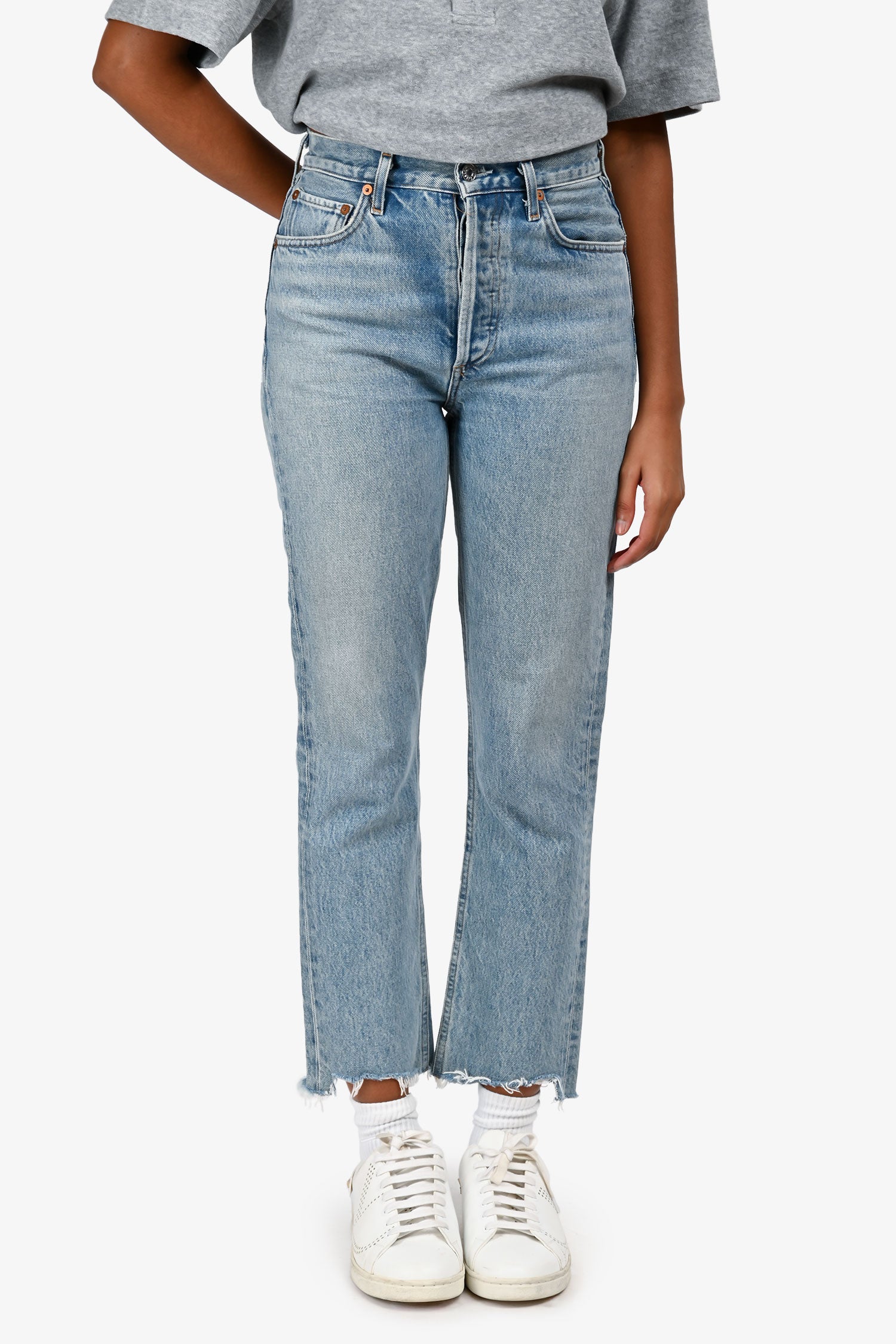 Refresh availabilityAgolde Blue Denim Straight Jeans. Slip-on. Front button-up closure. Waistband belt loops. 5 exterior pockets; 2 side slip and 1 mini compartment, 2 rear slip. Silver-tone hardware. Contrast stitching.