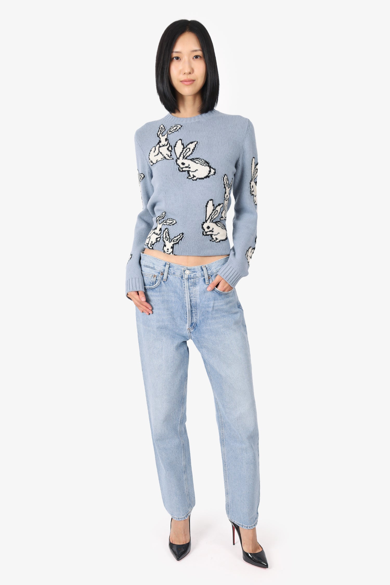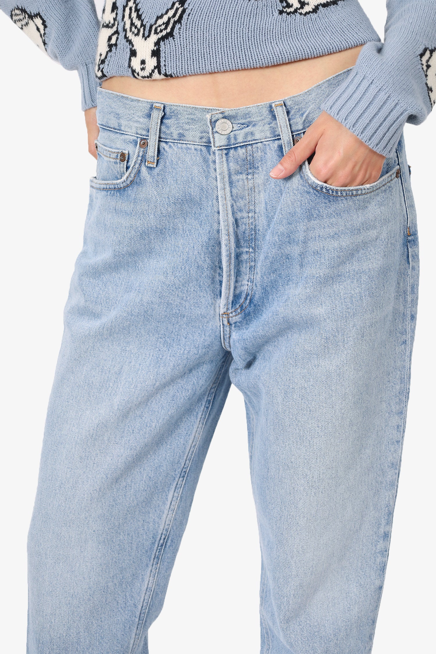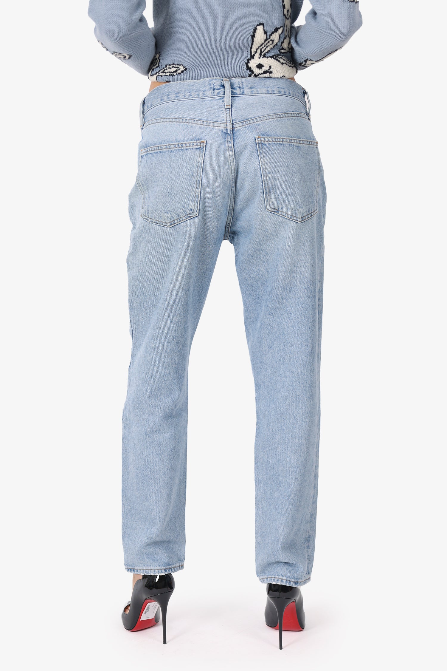 Refresh availabilityAgolde Blue 'Fen' Jeans. Slip on. Front button-up closure. Waistband belt-loops. 5 exterior pockets; 2 front slip, 1 mini compartment, and 2 rear slip. Brass and silver-tone hardware. Contrast stitching.