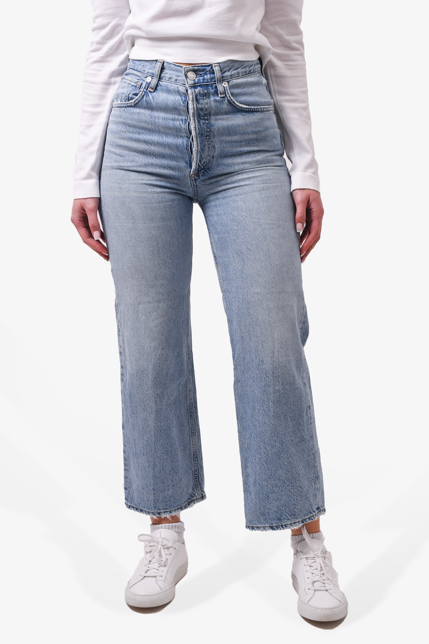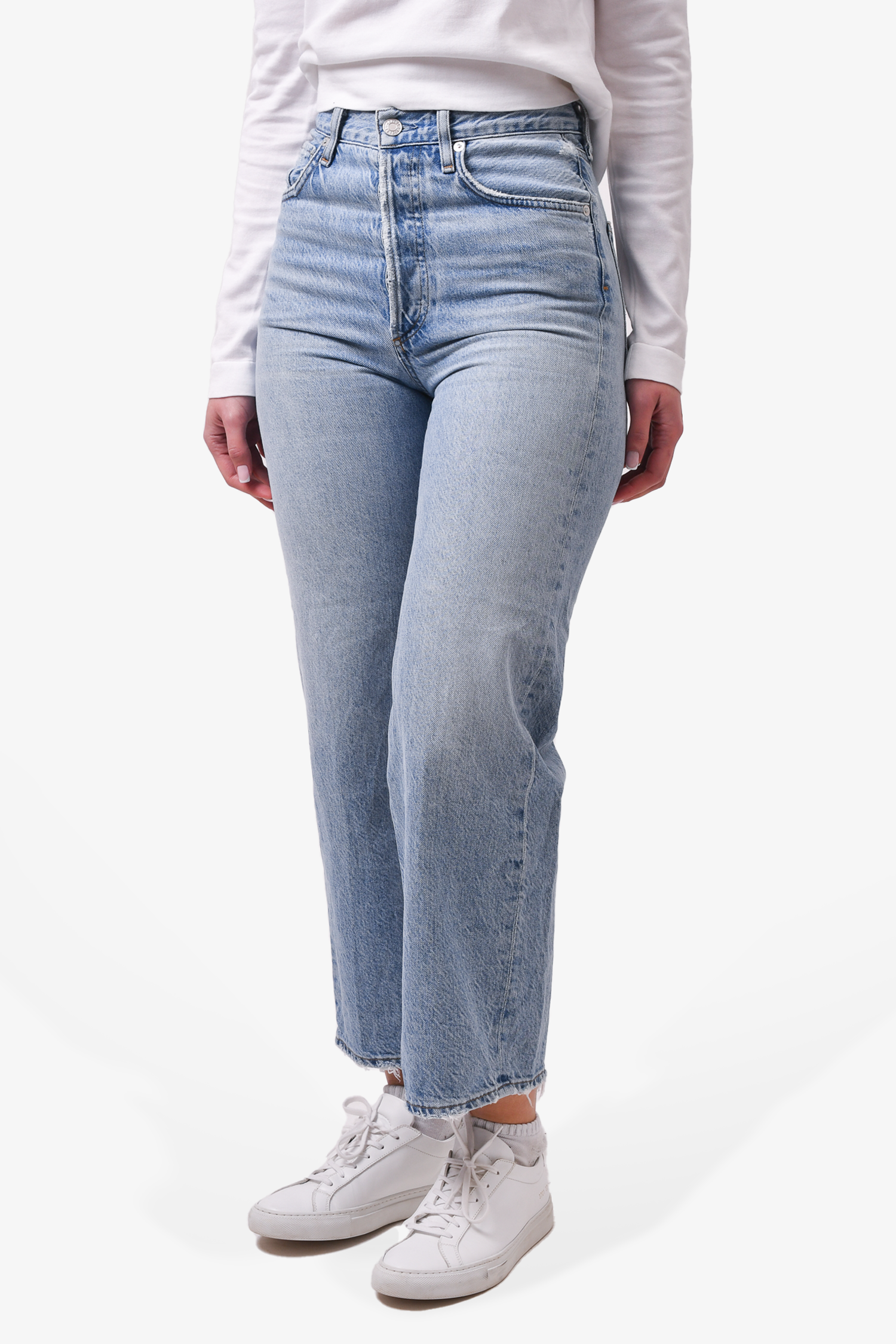 Refresh availabilityAgolde Light Blue Denim Straight Leg Jeans. Front button-up closure. Front and rear pockets. Waist belt loops. Contrast and tonal stitching.