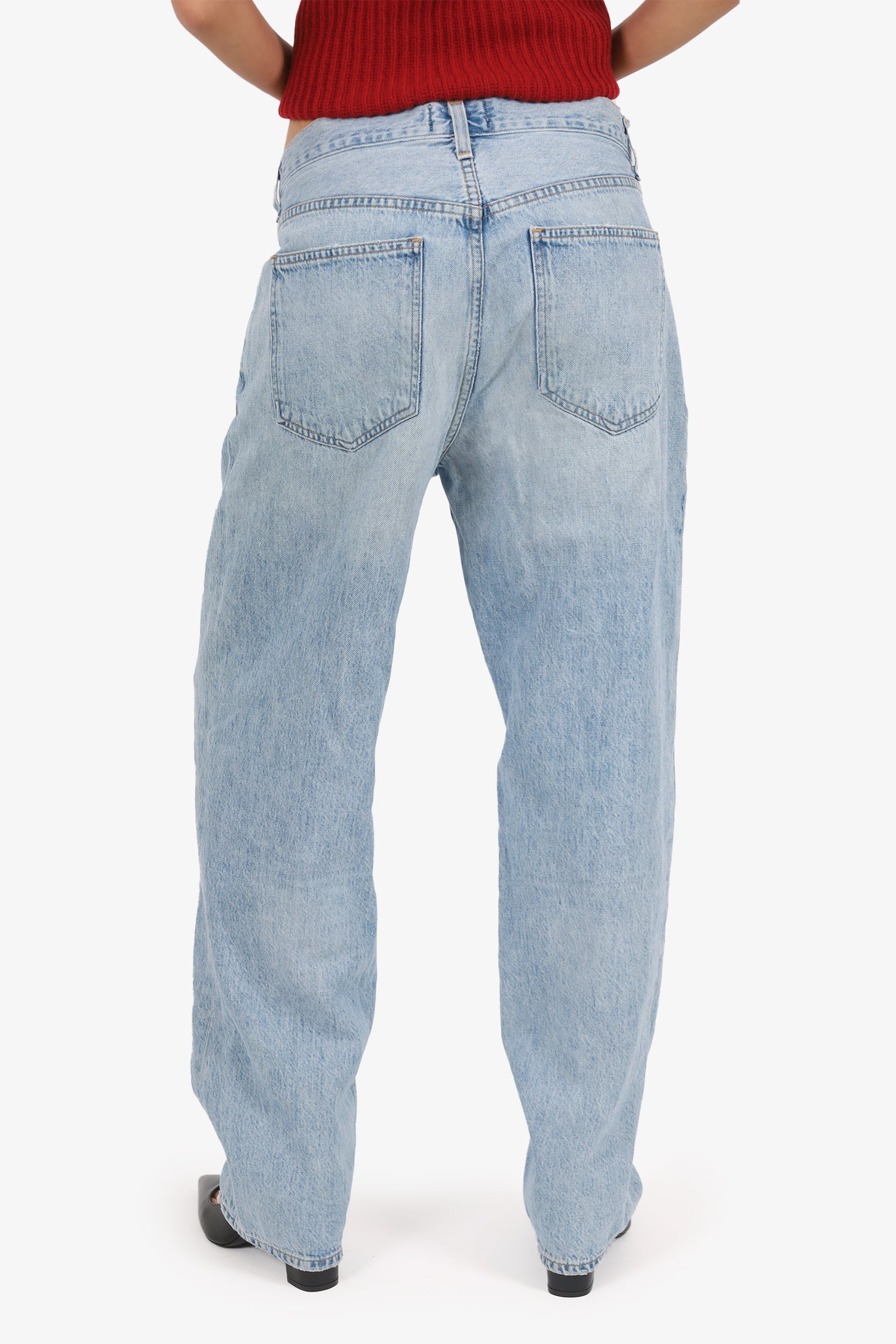 Refresh availabilityAgolde Light Wash Criss Cross Waist Jeans. Slip on. Front button-up closure. Waistband belt-loops. 5 exterior pockets; 2 front slip, 1 mini compartment, and 2 rear slip. Silver-tone hardware. Contrast stitching.