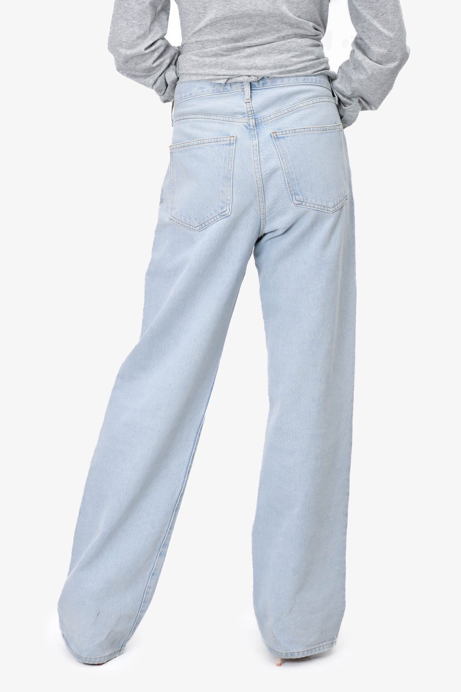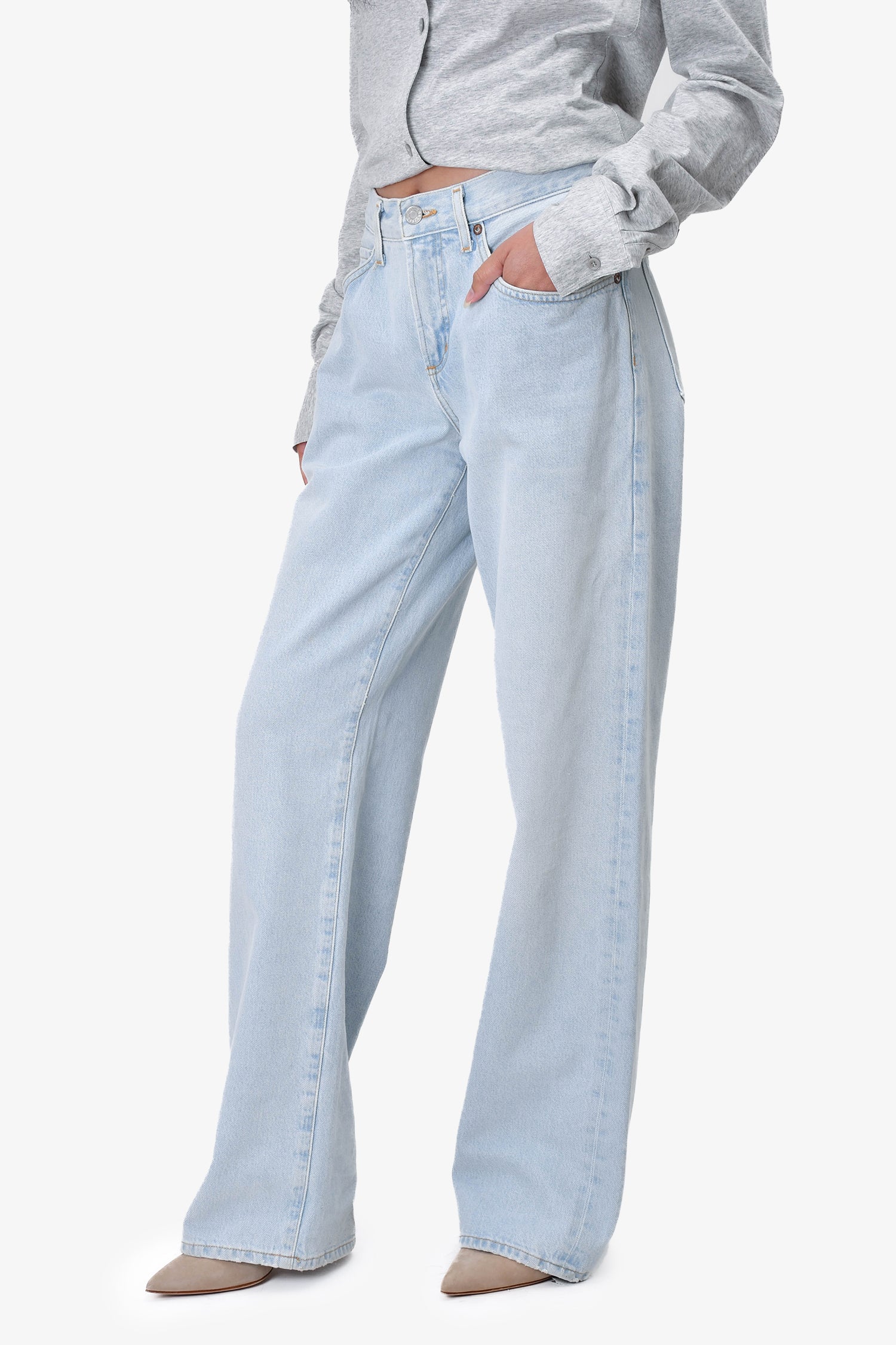 Refresh availabilityAgolde Light Wash Denim Wide Leg 'Fusion' Jeans. Front zip and button closure. Front and rear pockets. Waist belt loops.