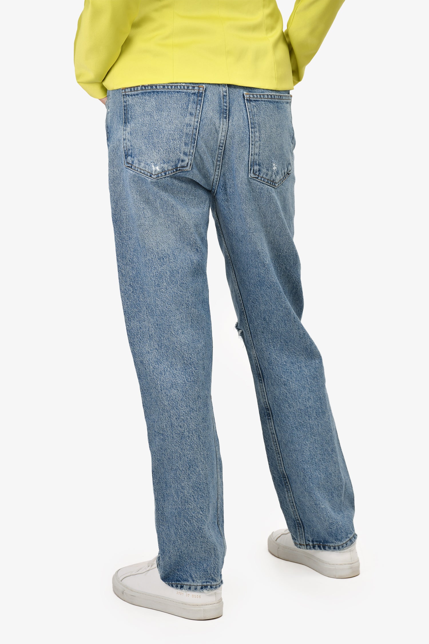 Refresh availabilityAgolde Medium Wash Distressed Denim Jeans. Front zip and button closure. Front and rear pockets. Waist belt loops.