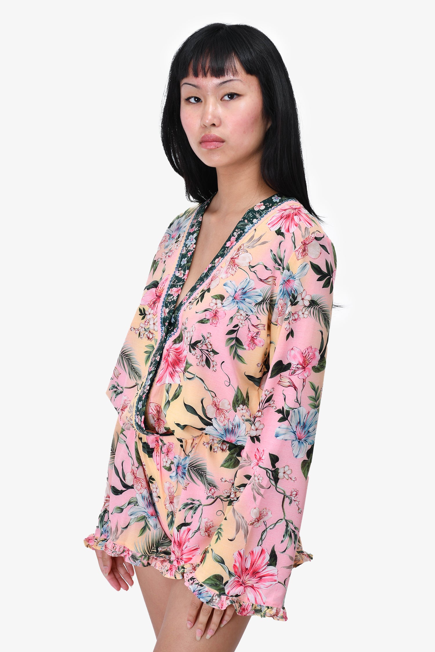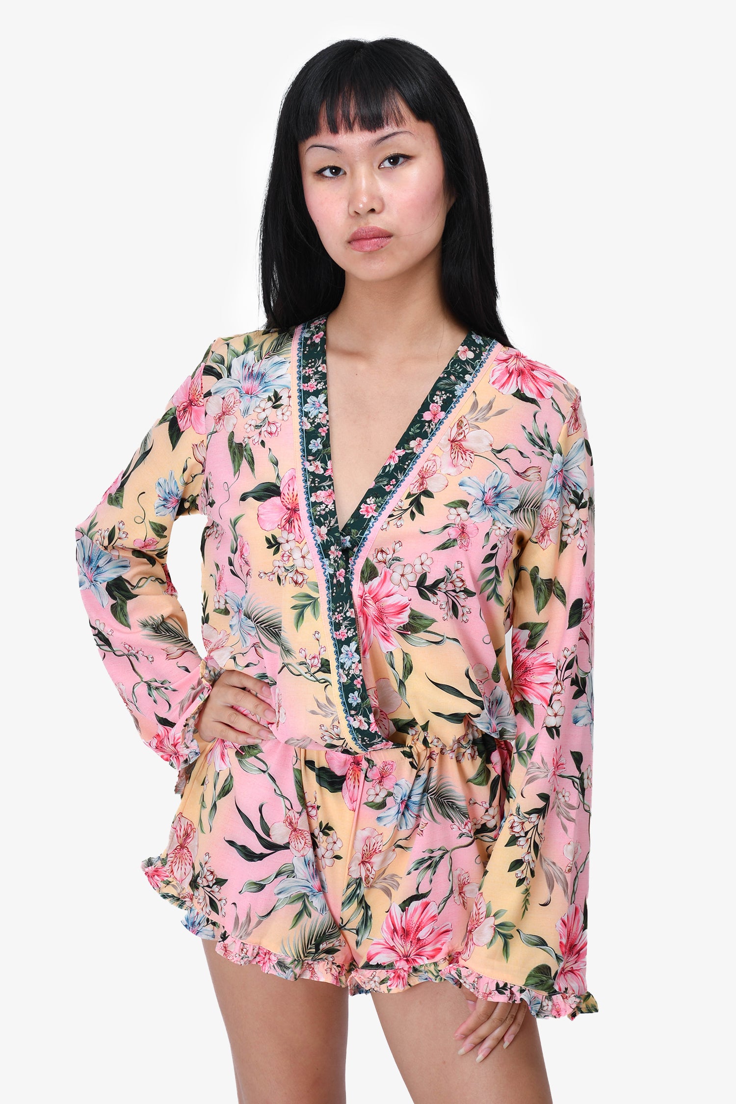 Refresh availabilityAgua Bendita Pink & Green Floral Romper. Plunging v-neckline. Ruffle trim at the sleeves and hem. Elastic band with ruching at the waist. Snap-on button at the neckline.