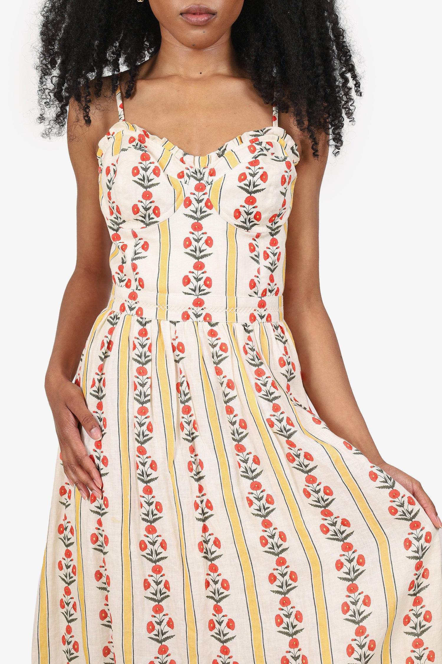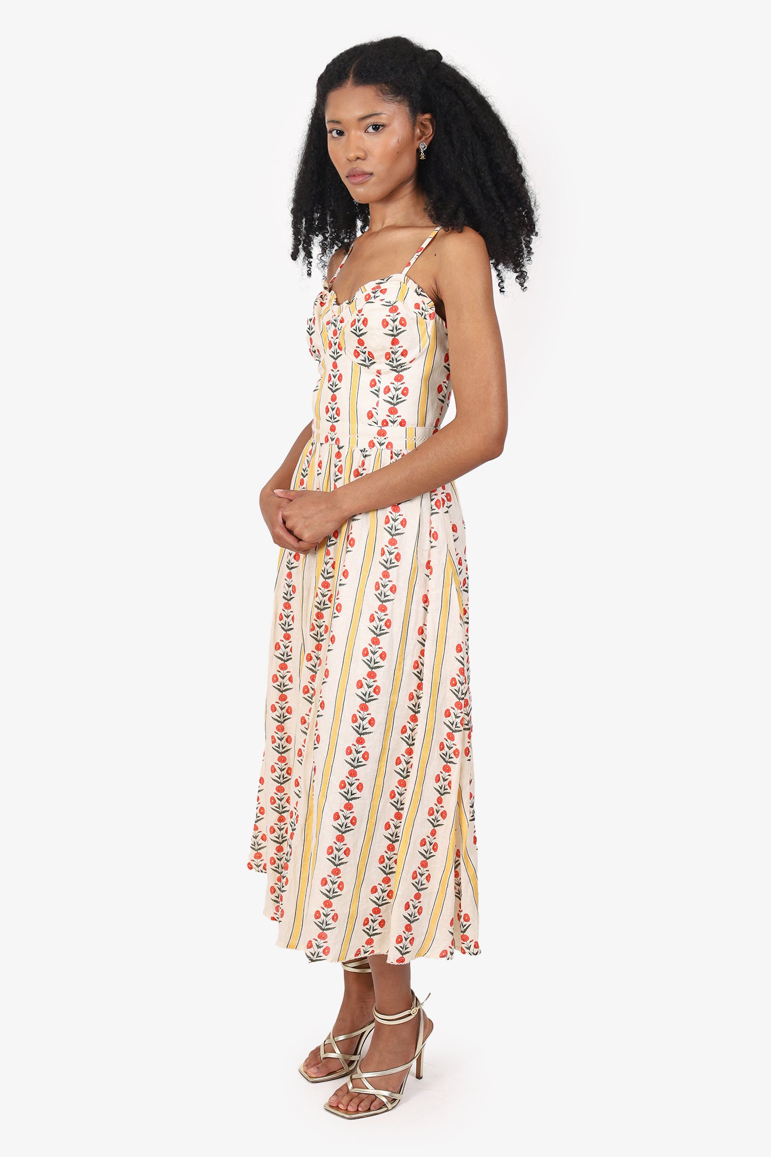 Refresh availabilityAgua by Agua Bendita White/Beige Floral Print Striped Midi Length Dress. Slip-on. Bustier-neckline. Rear zip and hook closure. Adjustable straps with adjustable buckle closure. Built-in underwire. Attached interior lining. Gold-tone hardware. Tonal stitching.