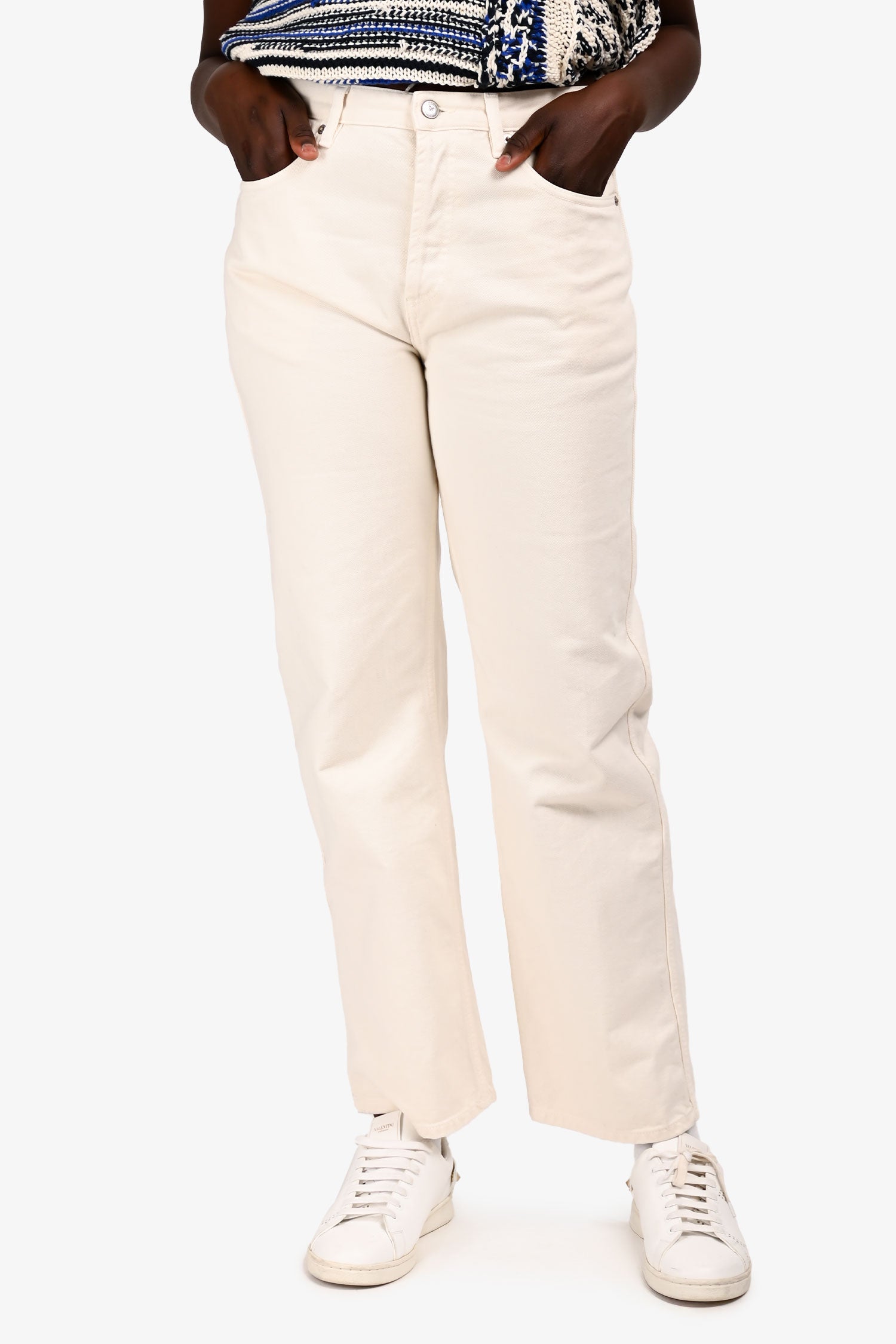 Refresh availabilityAimé Leon Dore White Straight Leg Jeans. Pull-on. Front button closure. Classic 5-pocket style. Belt loops at the waist. Silver-tone hardware. Tonal stitching.