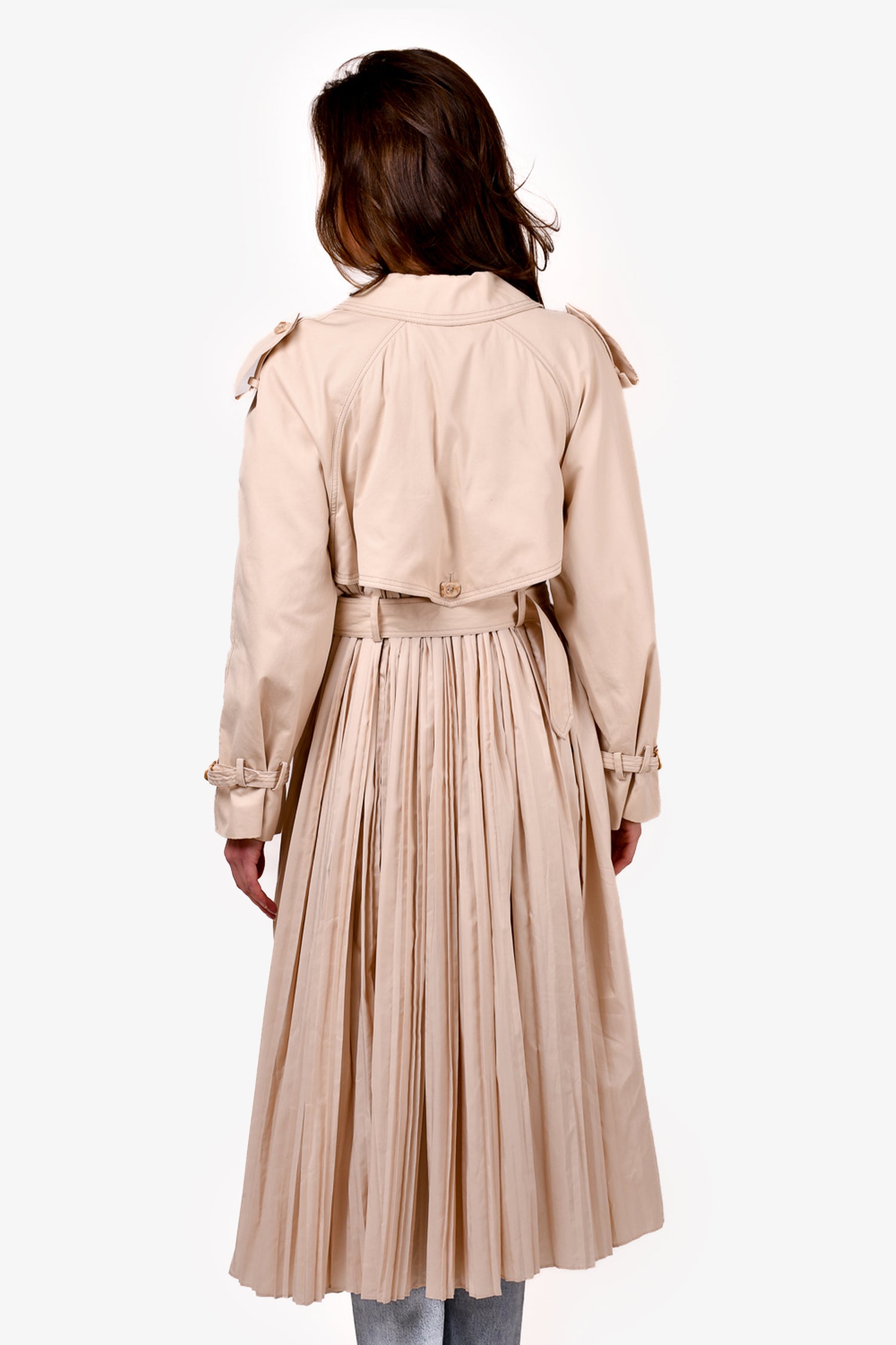 Aje Cream Pleated Belted Trench Coat. Front button-up closure. Front pockets. Strap with buckle closure on the cuffs. Tonal stitching.