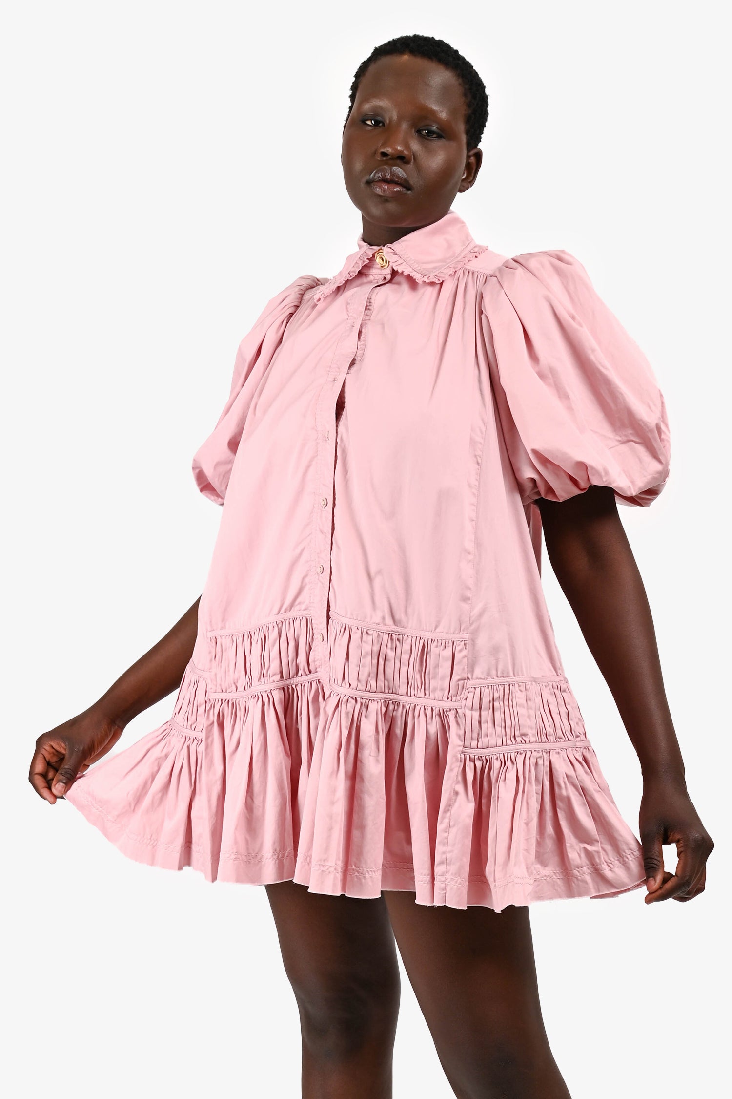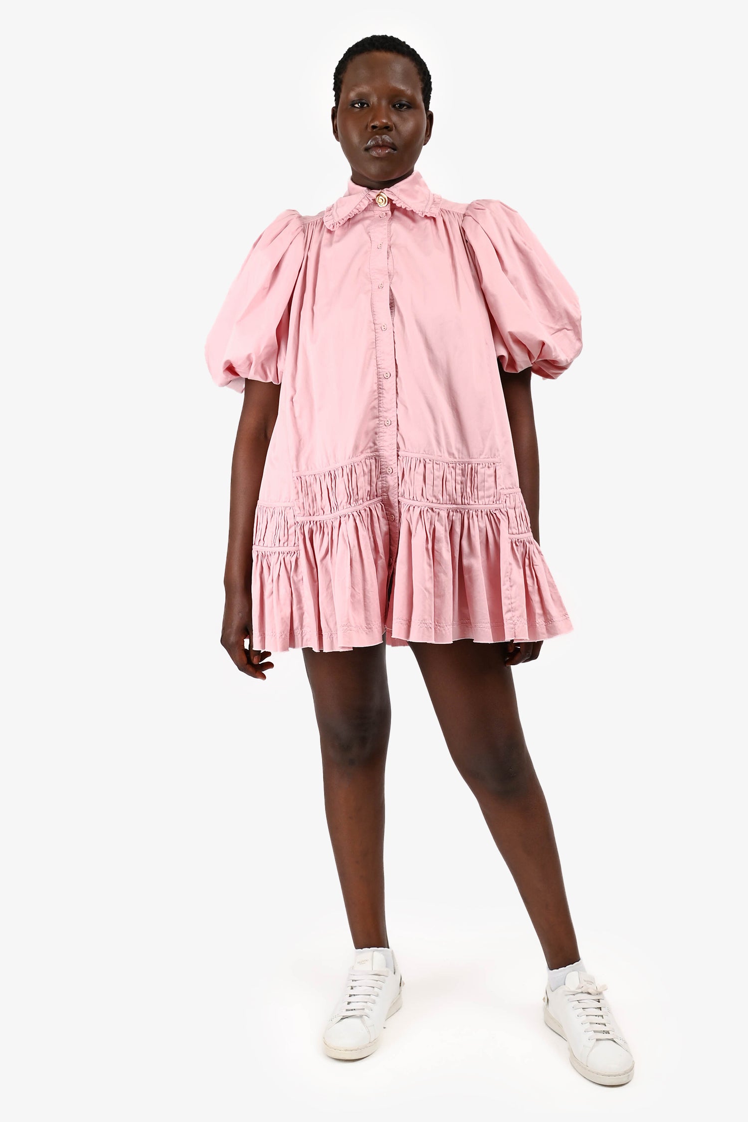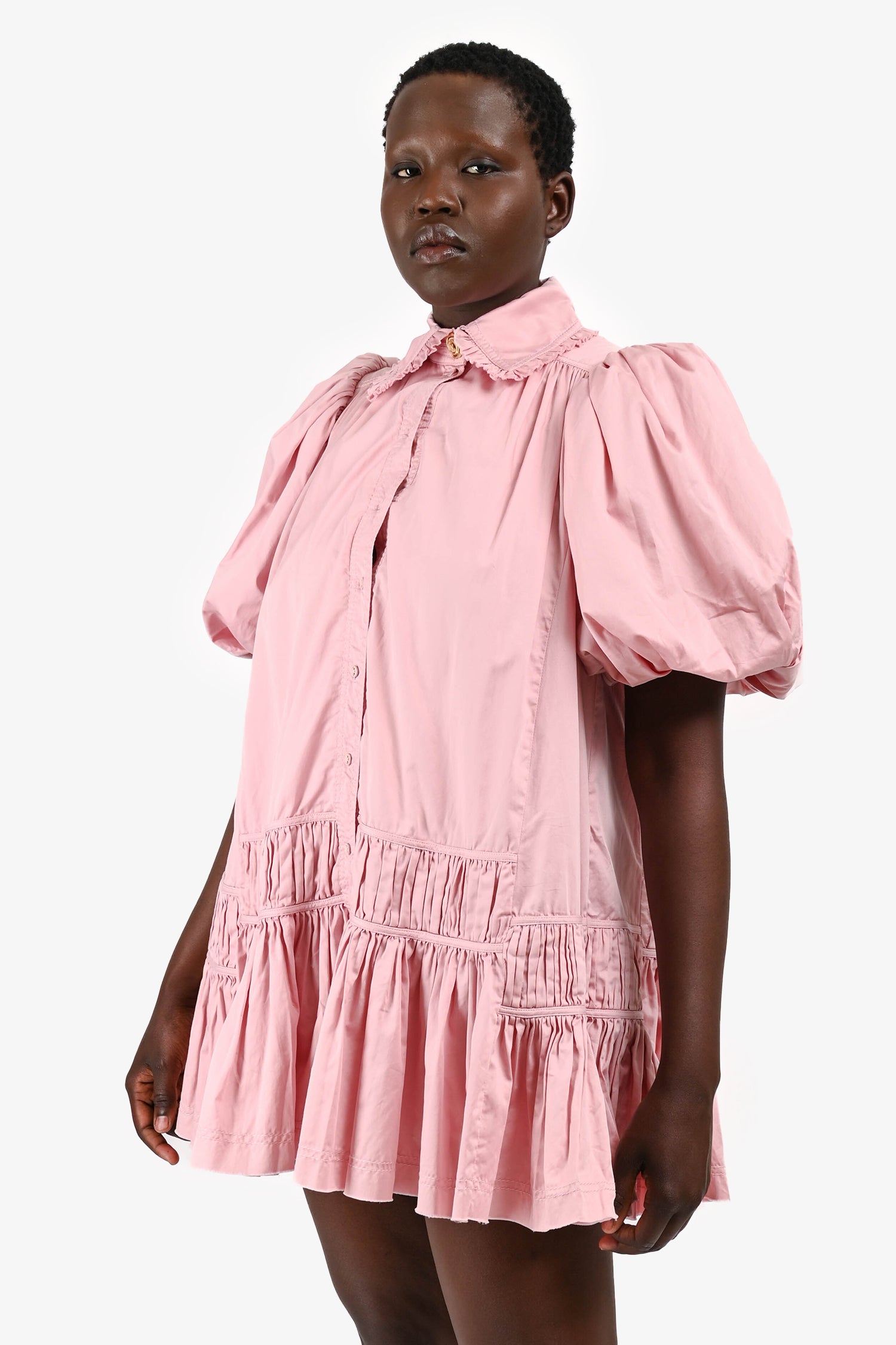 Refresh availabilityAje Pink Cotton Puff Sleeve Ruffle Mini Dress. Puff short sleeves. Front button closure. Top button in gold-tone. Side pockets. Fully lined. Tonal stitching.