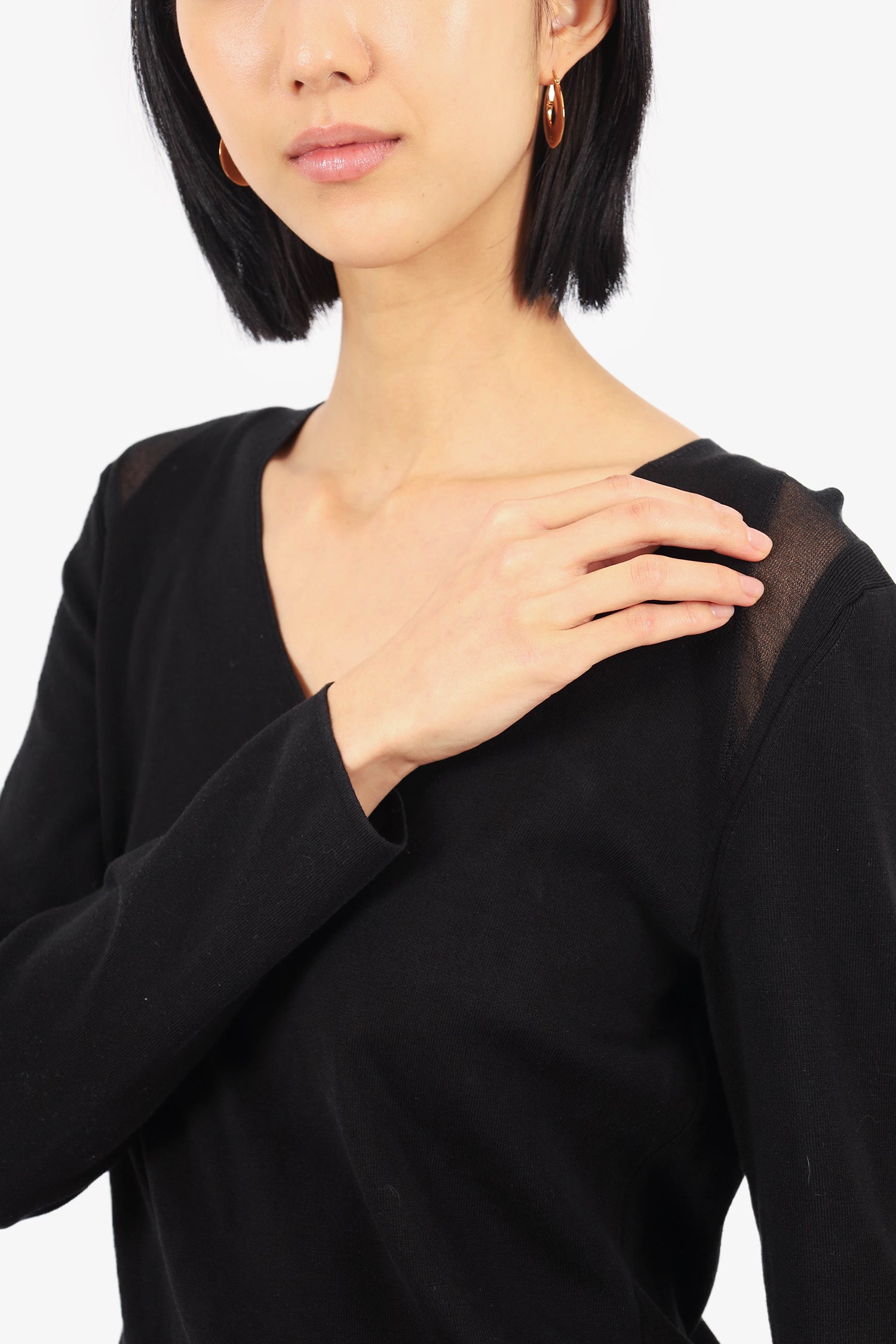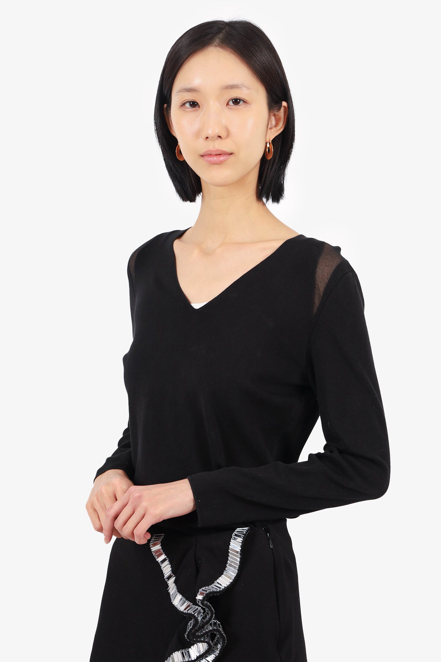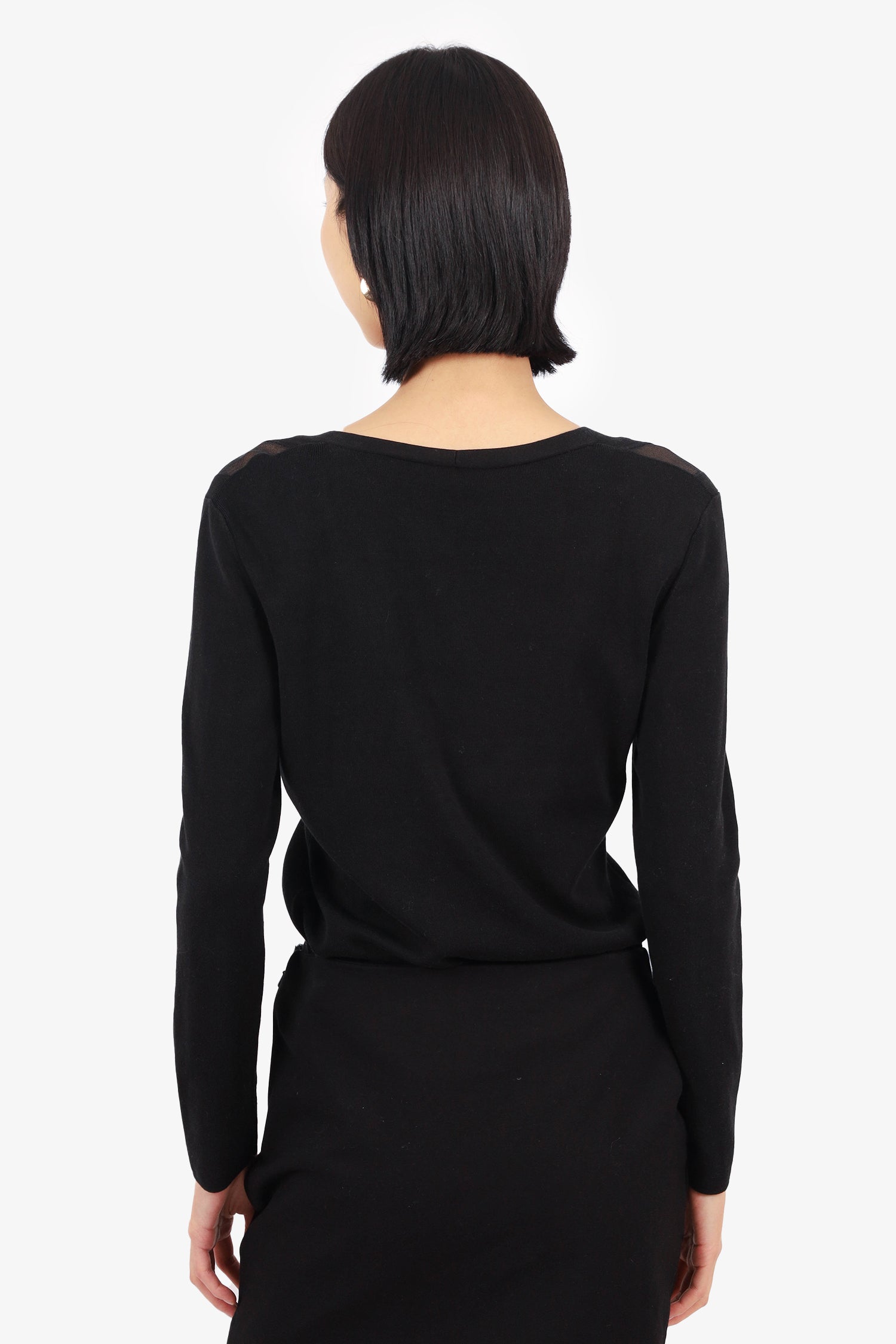 Refresh availabilityAkris Black Silk Ribbed Knit V-Neck Long-sleeve Sweater. Sheer shoulder detail. Pull-on. Tonal stitching. Unlined.