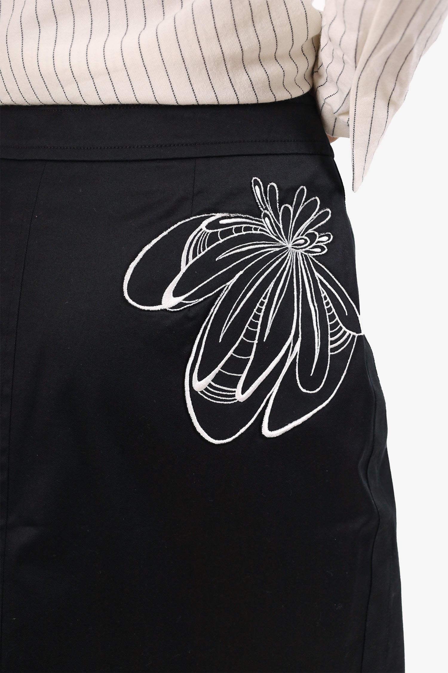 Refresh availabilityAkris Punto Black Floral Emboridery Midi Skirt. Slip-on. Front zip with snap-button closure. Embroidery at right rear. Slit at bottom rear. Attached interior lining. Tonal stitching.