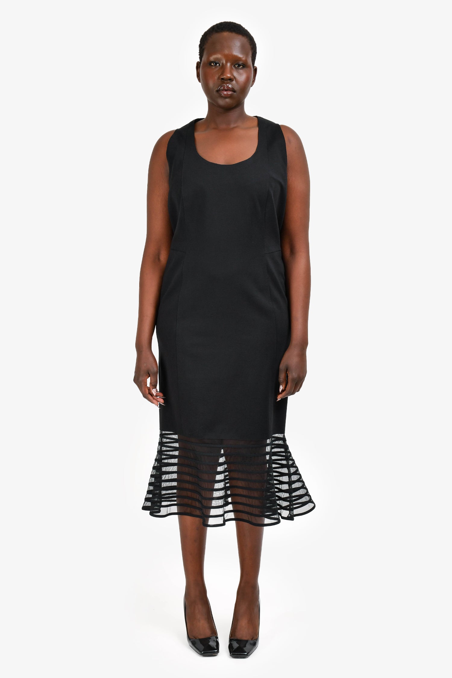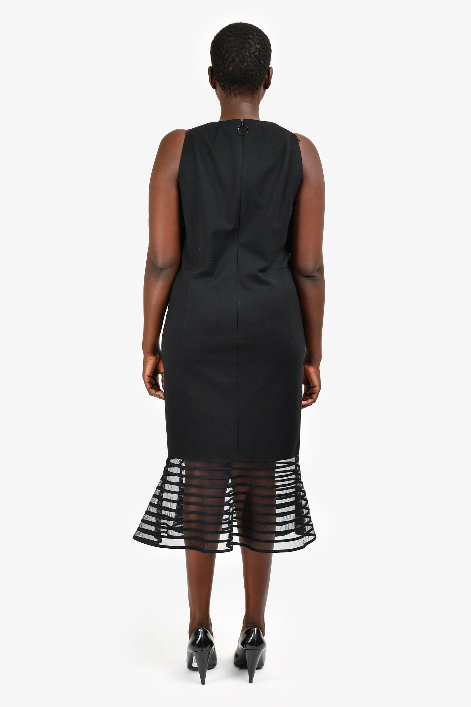 Refresh availabilityAkris Punto Black Mesh Ruffle Hem Midi Dress. Sleeveless design. Round neckline. Hidden back zip closure. Fully lined. Tonal stitching.
