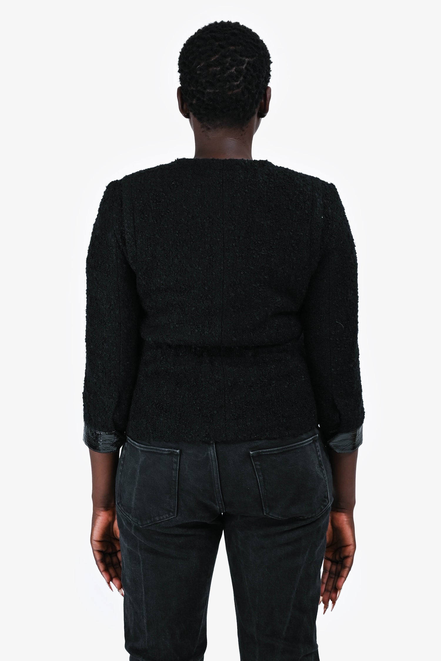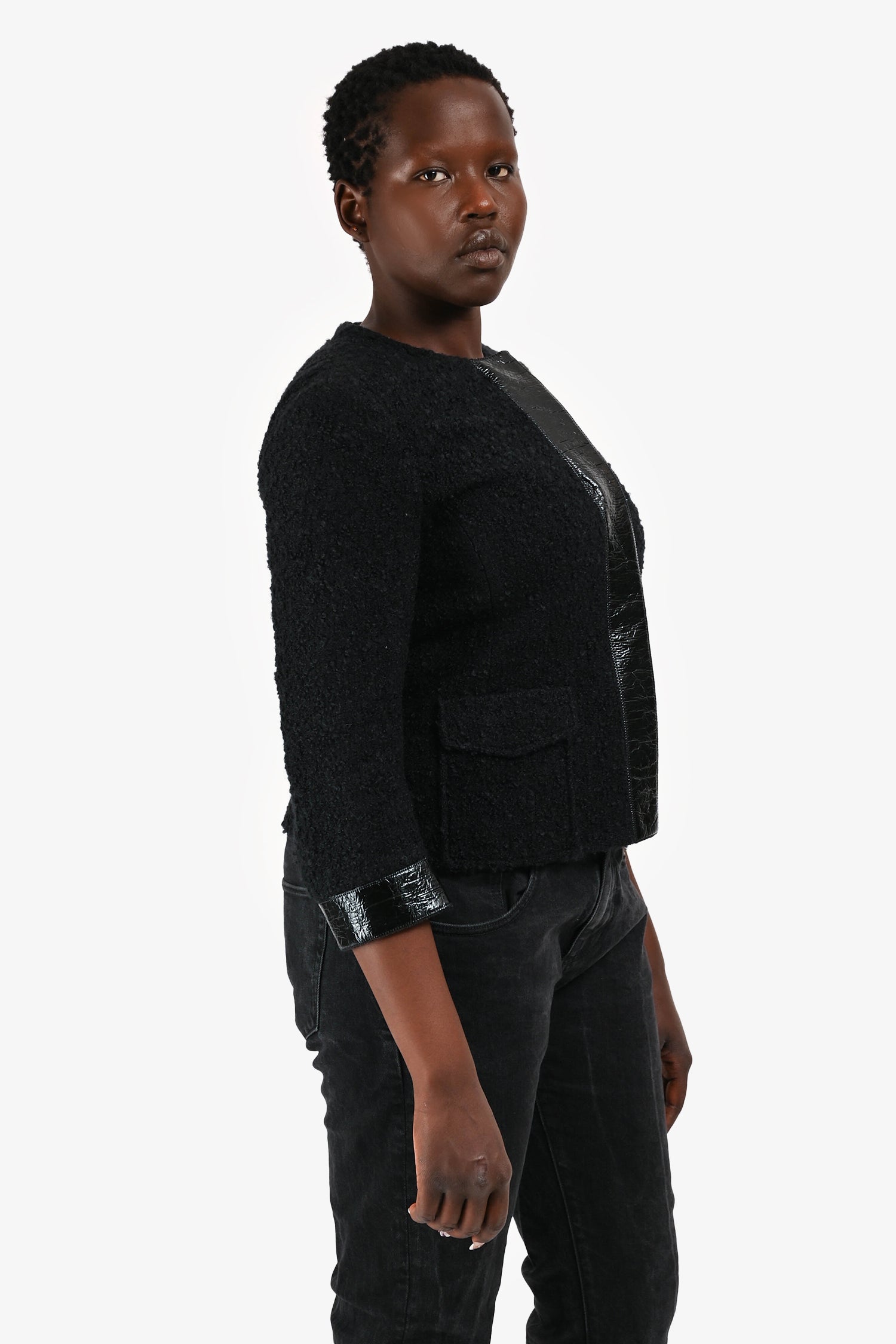 Refresh availabilityAkris Punto Black Tweed Evening Jacket with Faux Patent Trim. Front snap button closures. Interior waist drawstring. 2 hand pockets. Tonal stitching.