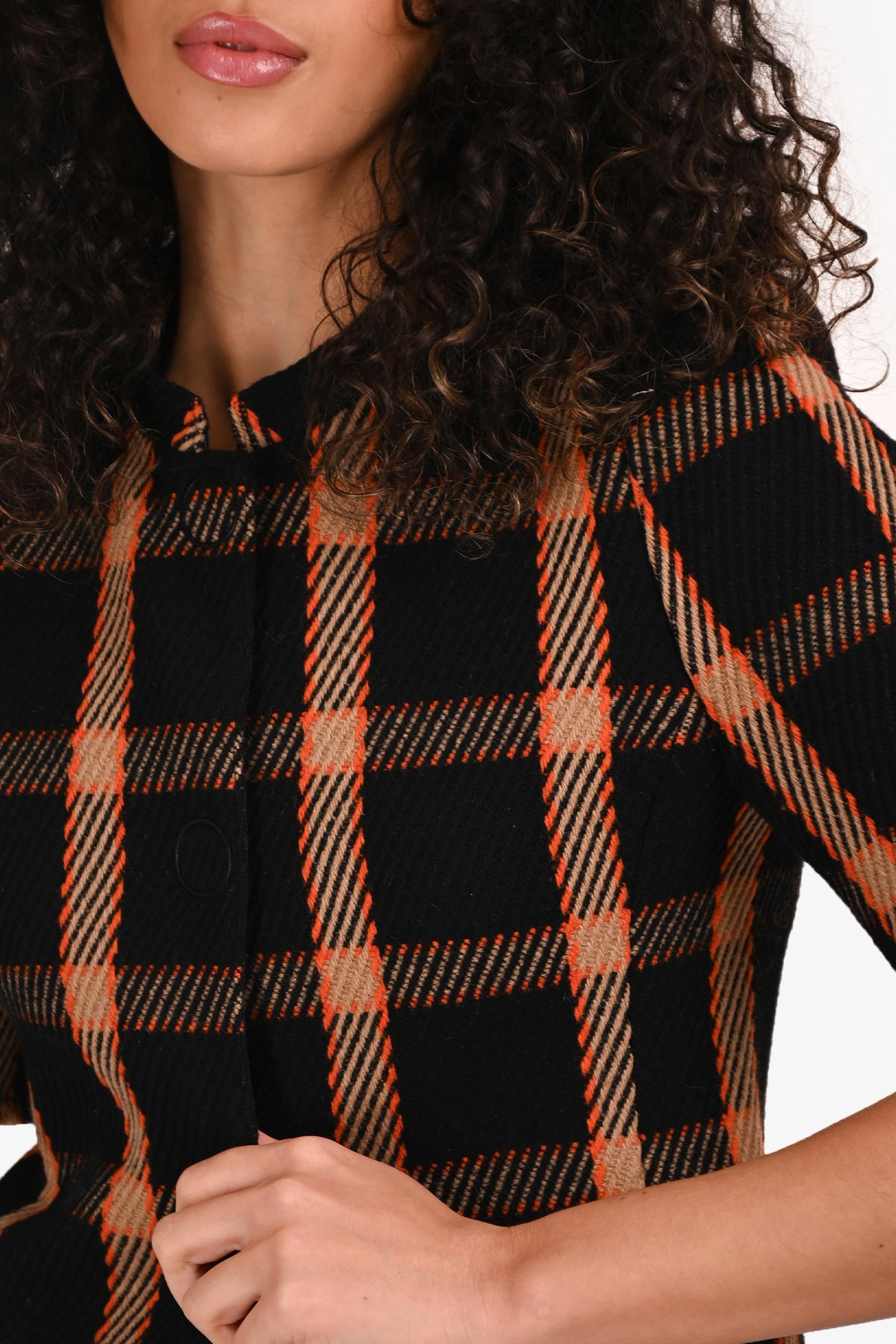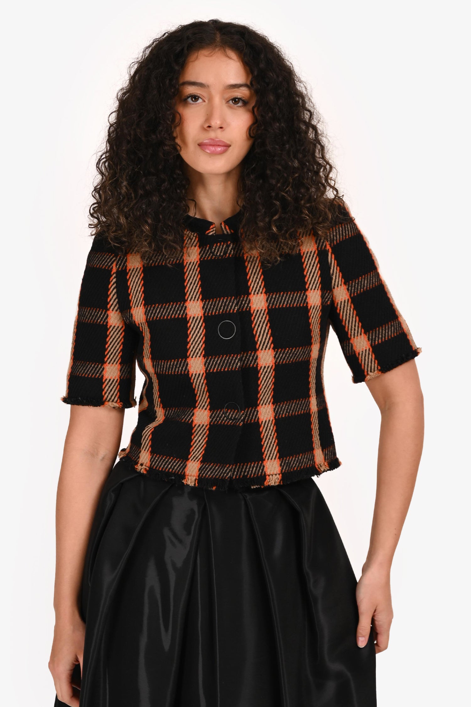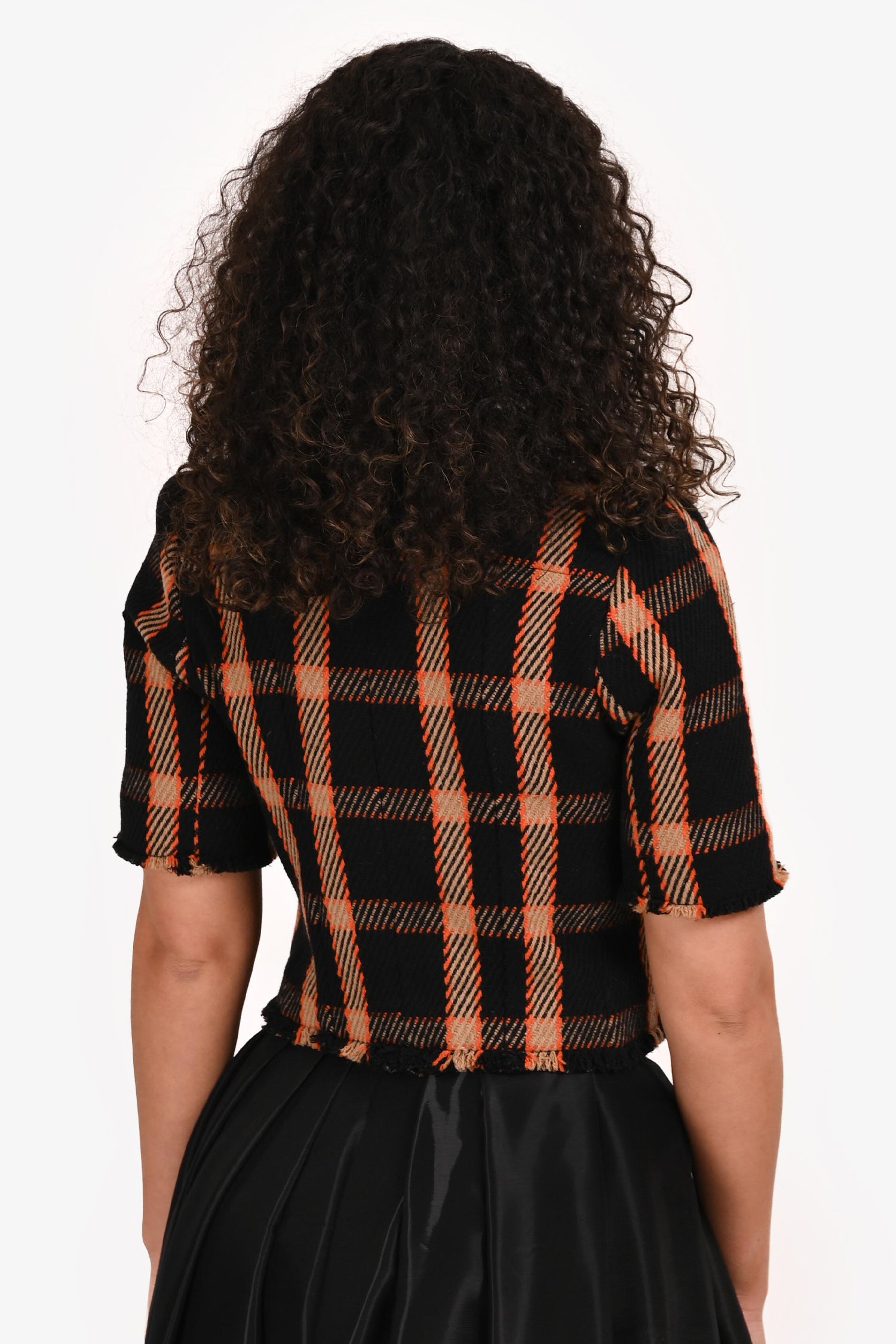 Refresh availabilityAkris Punto Black/Orange Checked Cropped Blazer. Front snap-button closure. Fringe trim on the cuffs and hemline. Fully lined. Tonal stitching.