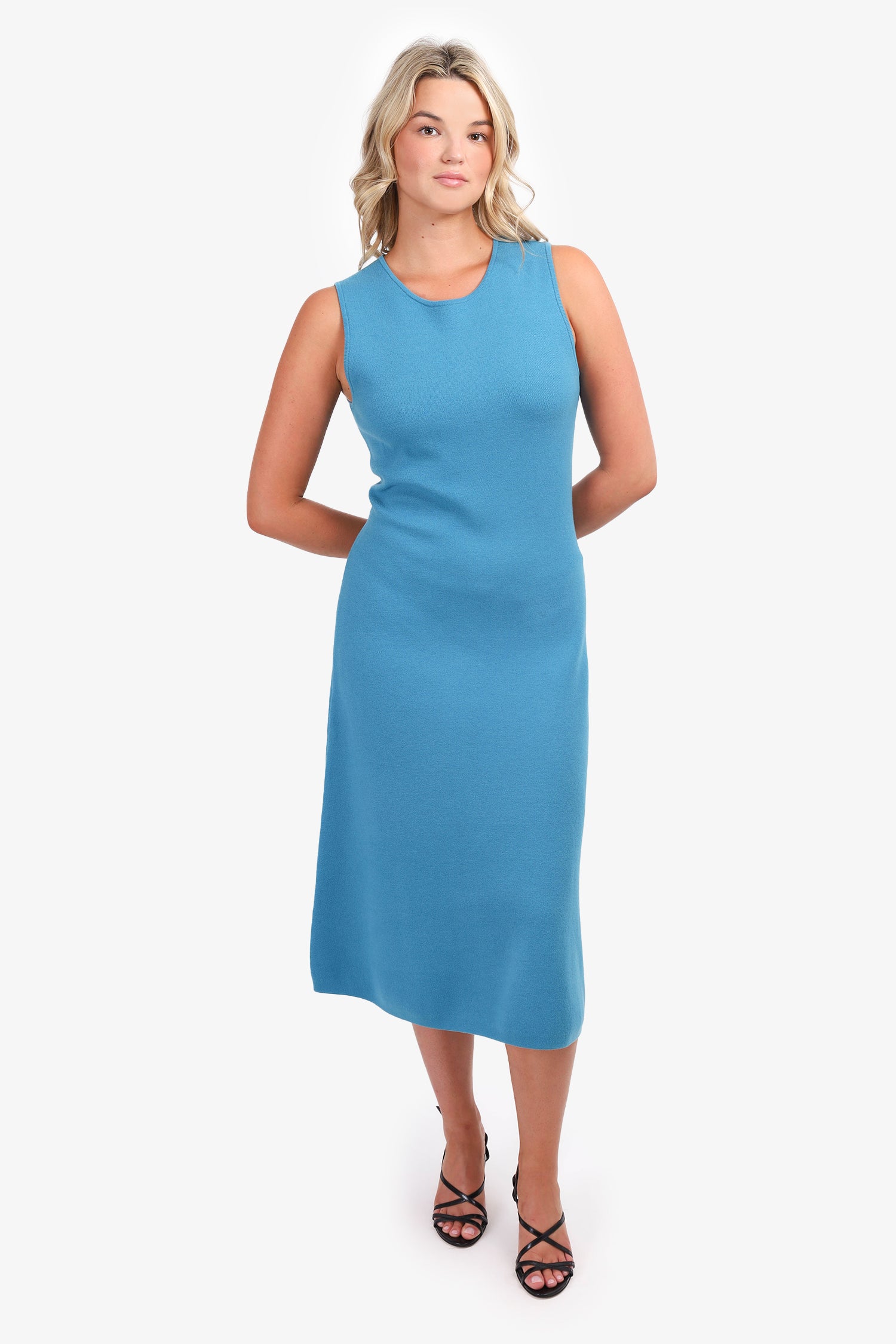 Refresh availabilityAkris Punto Blue Wool Knitted Sleeveless Midi Dress. Rear zip closure. Round neckline. Unlined. Tonal stitching.