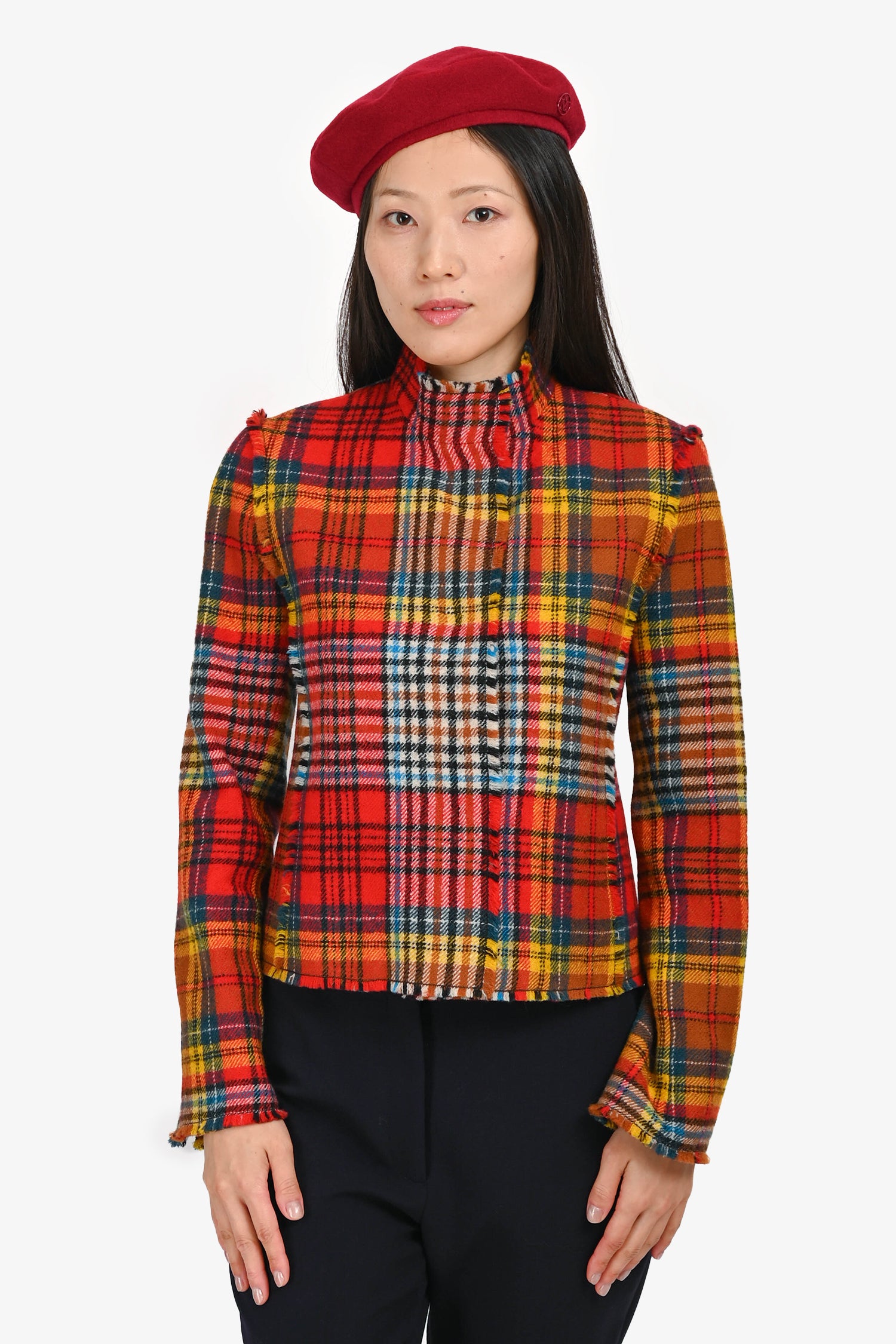 Akris Punto Red Multicolour Plaid Fringe Jacket Size 4 US