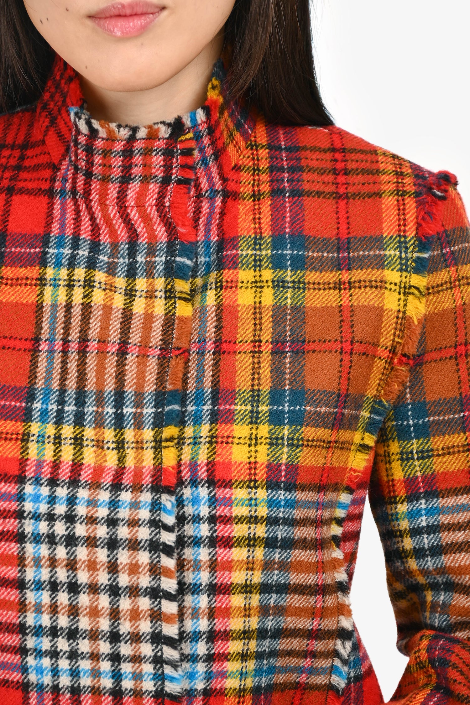 Refresh availabilityAkris Punto Red Multicolour Plaid Fringe Jacket. Front snap button closure. Slit detailing on the sleeves. Semi-lined interior. Dark silver-tone hardware. Tonal stitching.