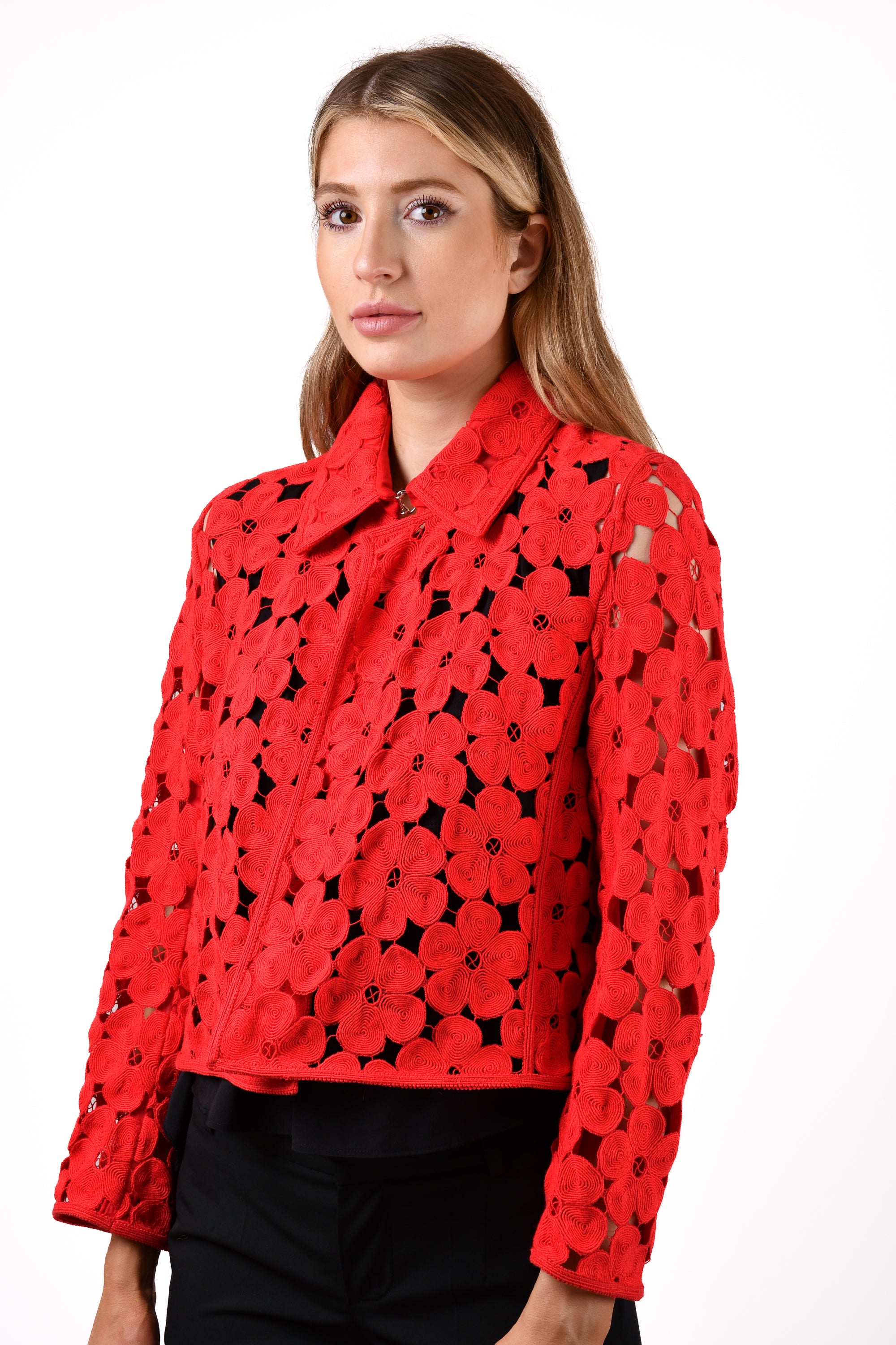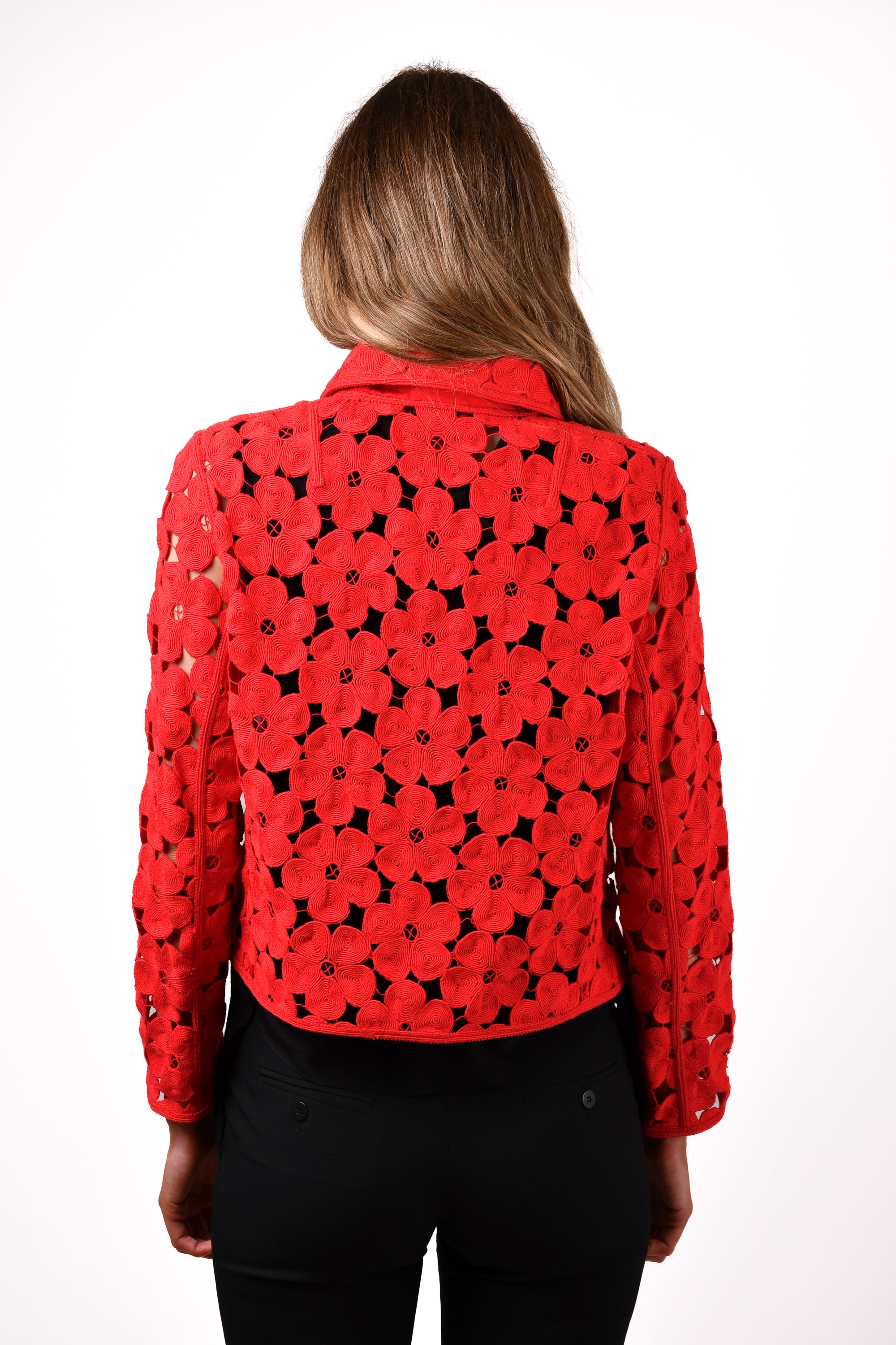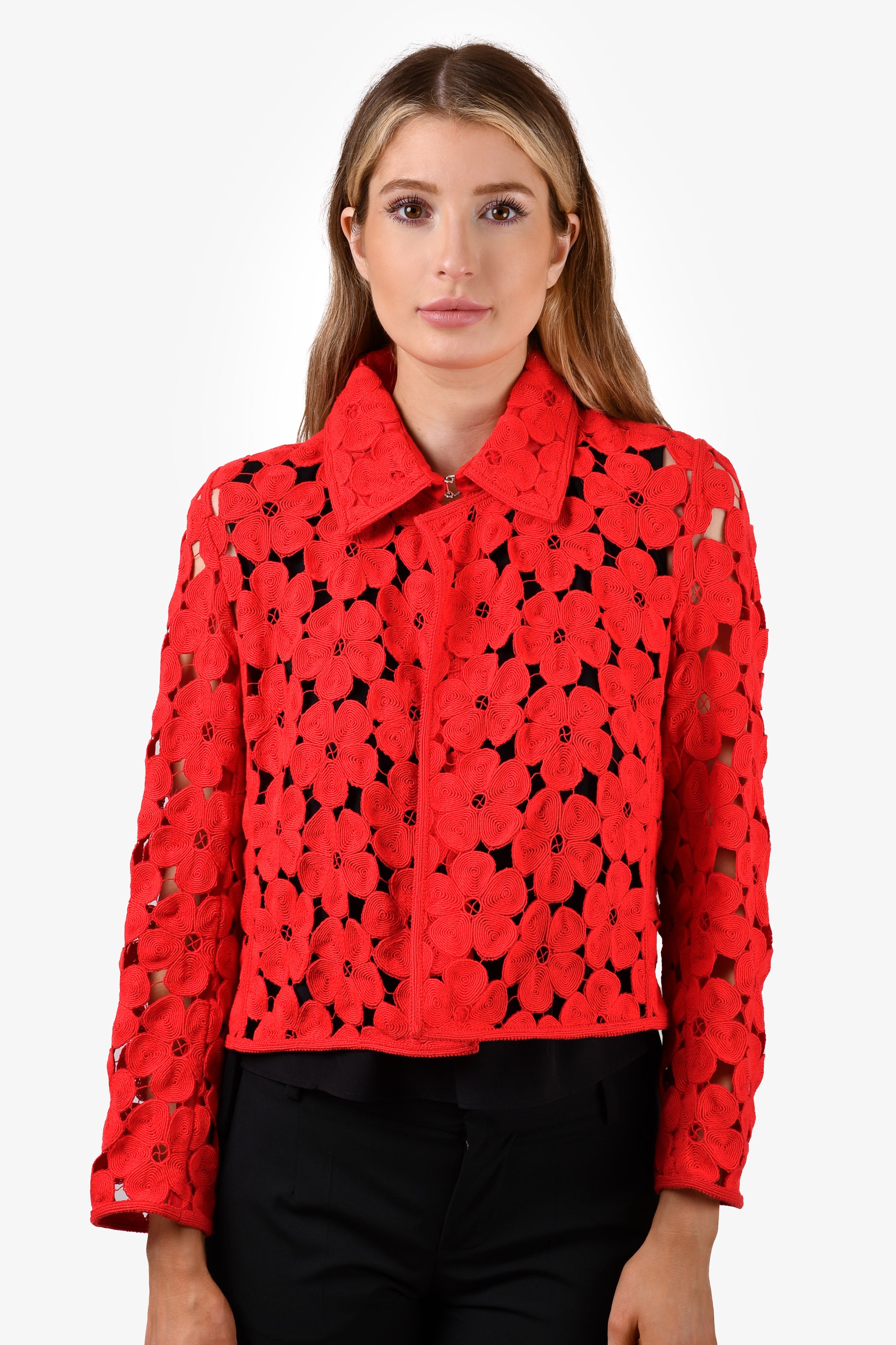 Refresh availabilityAkris Red Crochet Knit Jacket. Single front hook closure on the neckline. Unlined. Tonal stitching.