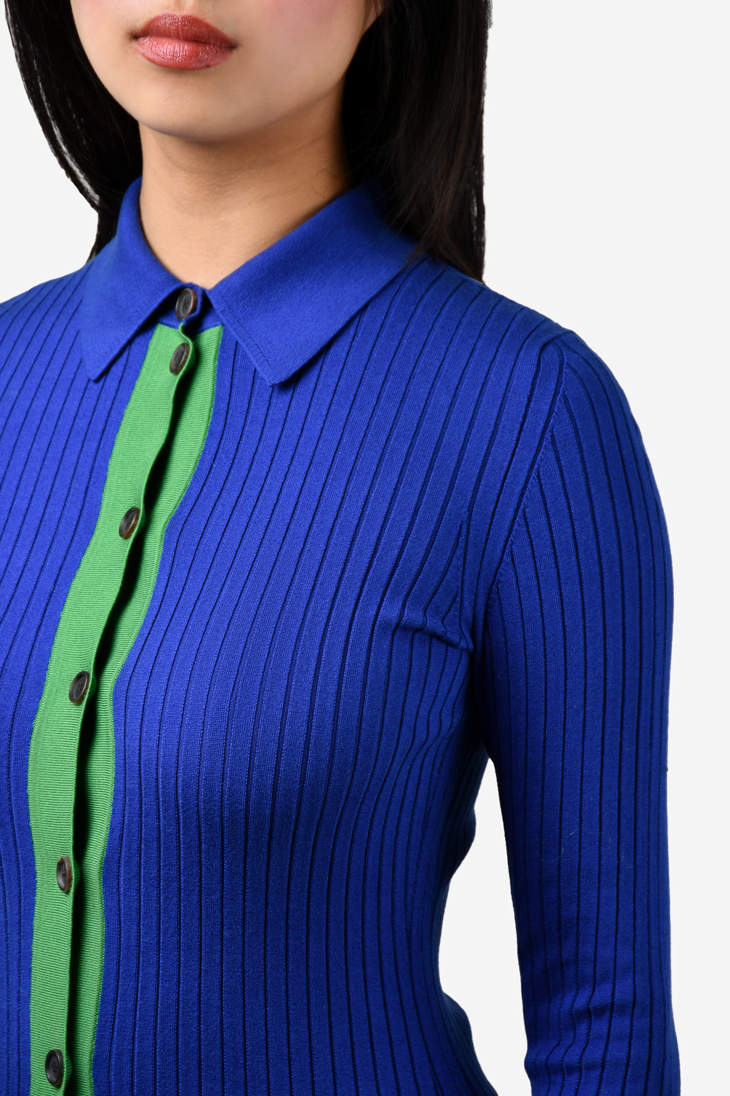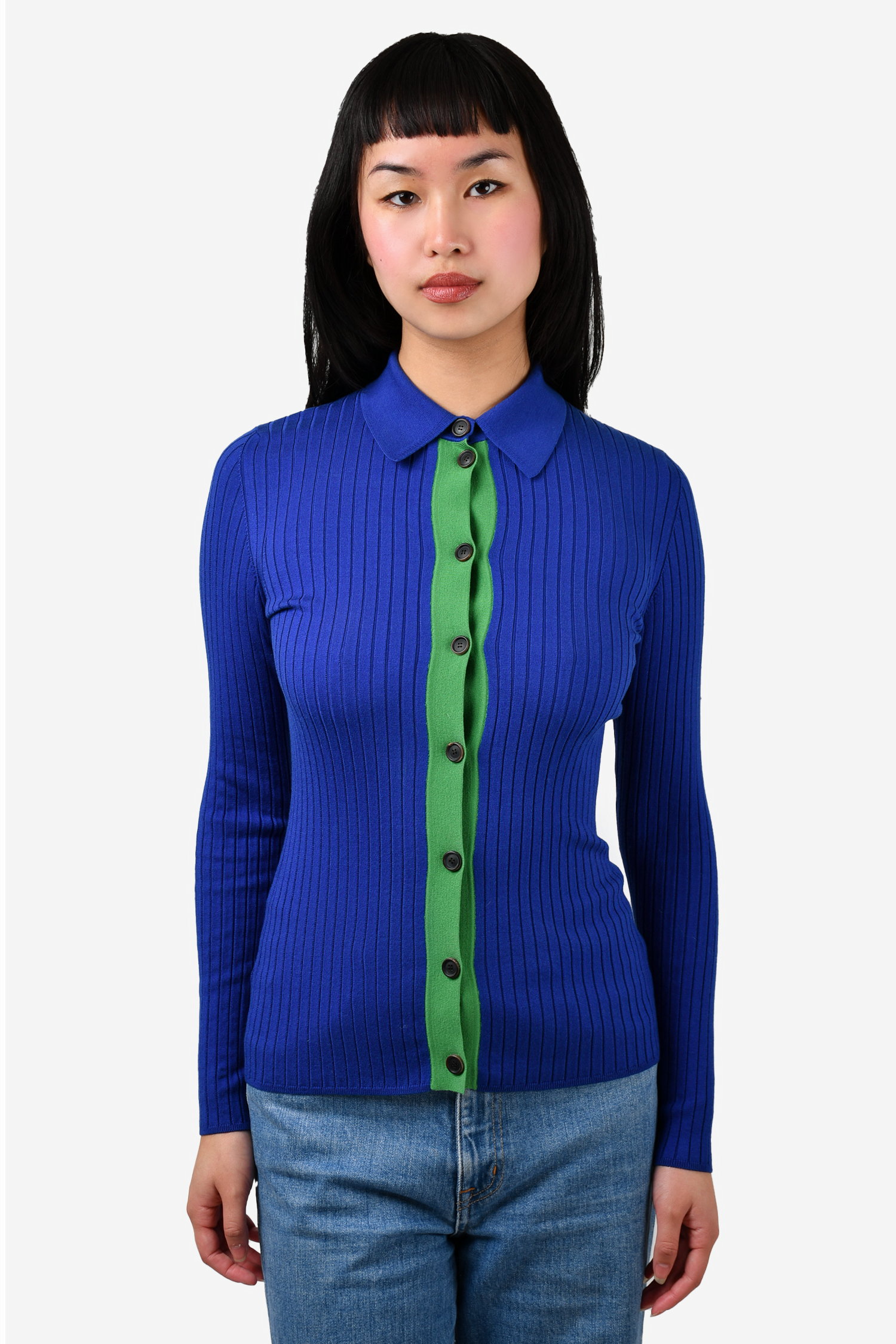 Refresh availabilityAkris Silk Knit Blue/Green Collared Cardigan. Front button-up closure. Tonal stitching.